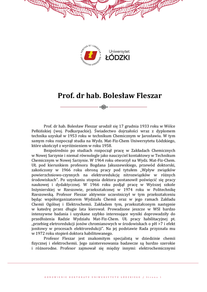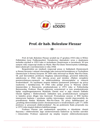 Prof. dr hab. Bolesław Fleszar Prof. dr hab. Bolesław Fleszar urodził się 17 grudnia 1933 roku w Wólce Pełkińskiej (woj. Podkarpackie). Świadectwo dojrzałości wraz z dyplomem technika uzyskał w 1953 roku w technikum Chemicznym w Jarosławiu. W tym samym roku rozpoczął studia na Wydz. Mat-Fiz-Chem Uniwersytetu Łódzkiego, które ukończył z wyróżnieniem w roku 1958. Bezpośrednio po studiach rozpoczął pracę w Zakładach Chemicznych w Nowej Sarzynie i niemal równolegle jako nauczyciel kontaktowy w Technikum Chemicznym w Nowej Sarzynie. W 1964 roku otworzył na Wydz. Mat-Fiz-Chem. UŁ pod kierunkiem profesora Bogdana Jakuszewskiego, przewód doktorski, zakończony w 1966 roku obroną pracy pod tytułem „Wpływ związków powierzchniowo-czynnych na elektroredukcję nitrozwiązków w różnych środowiskach”. Po uzyskaniu stopnia doktora postanowił poświęcić się pracy naukowej i dydaktycznej. W 1966 roku podjął pracę w Wyższej szkole Inżynierskiej w Rzeszowie, przekształconej w 1974 roku w Politechnikę Rzeszowską. Profesor Fleszar aktywnie uczestniczył w tym przekształceniu będąc współorganizatorem Wydziału Chemii oraz w jego ramach Zakładu Chemii Ogólnej i Elektrochemii. Zakładem tym, przekształconym następnie w katedrę przez długie lata kierował. Prowadzone jeszcze w WSI bardzo intensywne badania i uzyskane szybko interesujące wyniki doprowadziły do przedłożenia Radzie Wydziału Mat-Fiz-Chem. UŁ pracy habilitacyjnej pt. „przebieg eletroredukcji jonów chromianowych w środowiskach o pH >7 i efekt jonitowy w procesach elektroredukcji”. Na jej podstawie Rada przyznała mu w 1972 roku stopień doktora habilitowanego. Profesor Fleszar jest znakomitym specjalistą w dziedzinie chemii fizycznej i elektrochemii. Jego zainteresowania badawcze są bardzo szerokie i różnorodne. Profesor zajmował się między innymi: elektrochemicznymi O D N O W I E N I E D O K T O R A T U U N I W E R S Y T E T U Ł Ó D Z K I E G O / S t r o n a 1 O D N O W I E N I E D O K T O R A T U U N I W E R S Y T E T U Ł Ó D Z K I E G O metodami analizy związków organicznych, wpływem związków powierzchniowo-czynnych na redukcję tlenu, jonów chromianowych i nitrozwiązków, kinetyką adsorpcji związków wielocząsteczkowych na elektrodzie rtęciowej, elektorchemicznym hydroksylowaniem związków aromatycznych, elektrochemią aromatycznych związków siarki. Teoretycznymi i klasycznymi modelami warstwy podwójnej na granicy faz elektroda – roztwór. Oryginalnymi wkładem profesora w rozwój elektorchemii są prace nad tzw. „modelem polaryzacyjnym”. Dorobek naukowy profesora Fleszara obejmuje kilkadziesiąt oryginalnych prac w opublikowanych periodykach naukowych, 13 patentów, kilkadziesiąt opracowań badawczych na zlecenie oraz liczne wystąpienia konferencyjne. W uznaniu wagi tego dorobku Centralna komisja Kwalifikacyjna przyznała mu w roku 1996 tytuł profesora. Profesor Bolesław Fleszar wypromował 5 doktorów. Cztery z tych przewodów były przeprowadzane na Uniwersytecie Łódzkim – w tym przewód doktorski długoletniego Rektora Politechniki Rzeszowskiej prof. Andrzeja Sobkowiaka. Uwieńczeniem kariery akademickiej prof. Fleszara było powołanie go w 1981 roku na stanowisko Rektora Politechniki Rzeszowskiej. Niestety po niespełna roku, za działalność opozycyjną , został on z tego stanowiska odwołany. Działalność opozycyjna w latach 80. i 90. ubiegłego wieku oraz bardzo zaangażowana działalność społeczna to bardzo znaczące fragmenty życiorysu profesora. We wrześniu 1980 roku wstąpił on do Solidarności i wkrótce został wybrany do prezydium Komisji Zakładowej tego związku w macierzystej uczelni. Działalność związkową prowadził także poza Politechniką. Przypisuje mu się np. autorstwo wielu wystąpień podczas spotkań i manifestacji solidarnościowych w latach 1987-1989. Od 1981 roku współredagował niezależny miesięcznik kulturalno-społeczny „Reduta”. W latach 1985-1990 był wykładowcą duszpasterstw akademickich, robotniczych i rolniczych diecezji przemyskiej oraz członkiem Zespołu Niezależnych Historyków działającego pod patronatem KUL Pracował też w Diecezjalnej Radzie Kultury w Przemyślu. W roku 1989 został członkiem Komitetu Obywatelskiego Solidarności i z listy tego Komitetu został wybrany senatorem RP I-ej kadencji. W wyborach tych uzyskał prawie 80% ważnych głosów. W komisjach senackich zajmował się sprawami oświaty, nauki, kultury i środków masowego przekazu. W latach 1990-1996 był prezydentem Fundacji Rozwoju Ziemi Rzeszowskiej, a od 1992 roku założycielem i przewodniczącym Towarzystwa Rozwju regionu Polski Południowo-Wschodniej w Rzeszowie. O D N O W I E N I E D O K T O R A T U U N I W E R S Y T E T U Ł Ó D Z K I E G O / S t r o n a 2 O D N O W I E N I E D O K T O R A T U U N I W E R S Y T E T U Ł Ó D Z K I E G O Za swoją działalność był wielokrotnie nagradzany. Najważniejsze wyróżnienia państwowe to: - Medal KEN (1980) - Krzyż Polonia Restituta (1994) - Krzyż Kawalerski Orderu Odrodzenia Polski (1995) O D N O W I E N I E D O K T O R A T U U N I W E R S Y T E T U Ł Ó D Z K I E G O / S t r o n a 3