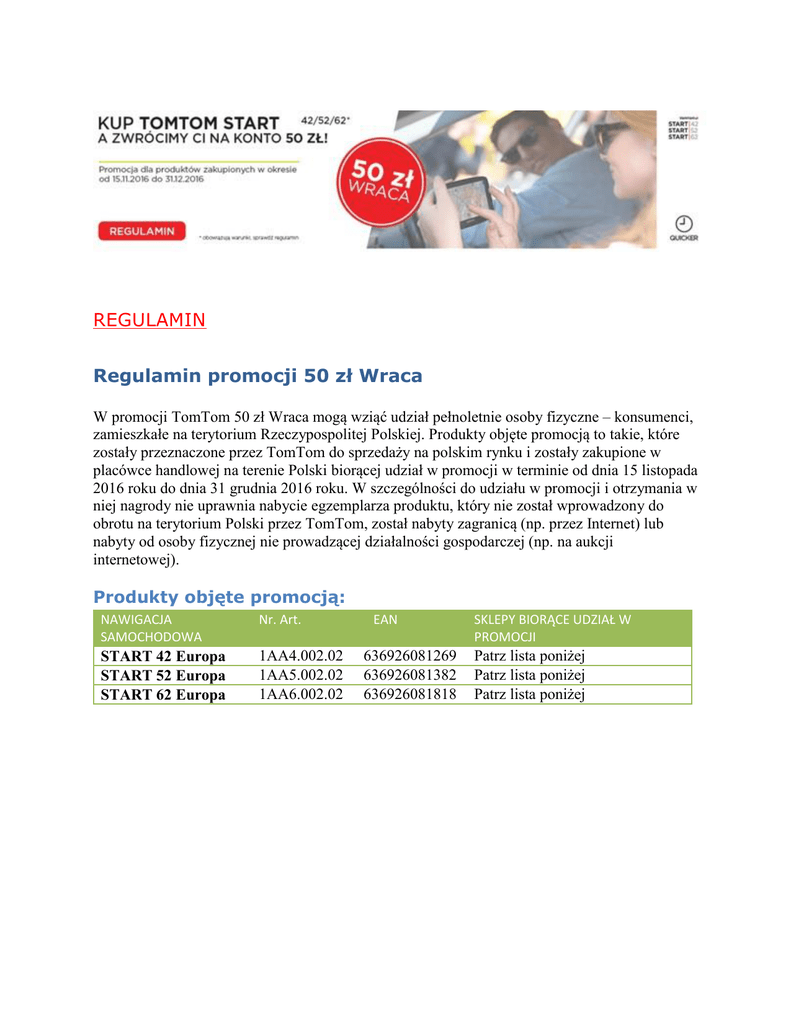 REGULAMIN Regulamin promocji 50 zł Wraca W promocji TomTom 50 zł Wraca mogą wziąć udział pełnoletnie osoby fizyczne – konsumenci, zamieszkałe na terytorium Rzeczypospolitej Polskiej. Produkty objęte promocją to takie, które zostały przeznaczone przez TomTom do sprzedaży na polskim rynku i zostały zakupione w placówce handlowej na terenie Polski biorącej udział w promocji w terminie od dnia 15 listopada 2016 roku do dnia 31 grudnia 2016 roku. W szczególności do udziału w promocji i otrzymania w niej nagrody nie uprawnia nabycie egzemplarza produktu, który nie został wprowadzony do obrotu na terytorium Polski przez TomTom, został nabyty zagranicą (np. przez Internet) lub nabyty od osoby fizycznej nie prowadzącej działalności gospodarczej (np. na aukcji internetowej). Produkty objęte promocją: NAWIGACJA SAMOCHODOWA Nr. Art. START 42 Europa START 52 Europa START 62 Europa 1AA4.002.02 1AA5.002.02 1AA6.002.02 EAN 636926081269 636926081382 636926081818 SKLEPY BIORĄCE UDZIAŁ W PROMOCJI Patrz lista poniżej Patrz lista poniżej Patrz lista poniżej Jak wziąć udział w promocji: 1. Dokonać zakupu produktu zachowując paragon albo fakturę i wypełnić formularz zgłoszeniowy na stronie: promocjetomtom.pl. Formularz musi zostać wypełniony i przedłożony w ciągu 14 (czternastu) dni od daty zakupu produktu objętego promocją. Rejestracja obejmuje podanie: danych osobowych, aktualnego adresu email, konta bankowego, na które nastąpi zwrot, numeru seryjnego produktu objętego promocją i scanu paragonu lub faktury potwierdzającej zakup produktu. 2. Zwrot pieniędzy nastąpi w ciągu 28 dni roboczych od momentu otrzymania przez organizatora poprawnie wypełnionych dokumentów zgłoszeniowych. Wartość zwrotu to 50 PLN. Wszystkie osoby, które zakupiły produkt objęty promocją w okresie jej trwania, są uprawnione do otrzymania zwrotu. Wszelkie niekompletne i nieprawidłowe formularze zgłoszeniowe zostaną automatycznie odrzucone, a do Uczestników zostaną wysłane stosowne powiadomienia e-mail. Niekompletne formularze zgłoszeniowe należy uzupełnić i ponownie przesłać w ciągu 7 (siedmiu) dni roboczych od daty otrzymania powiadomienia. W przeciwnym razie formularz nie zostanie przetworzony. Zgłoszenie jest uznawane za niekompletne w przypadku, gdy spełnia jedno lub więcej spośród następujących kryteriów: 1. Zakupiony produkt nie jest objęty Promocją. 2. Zakupiony produkt nie został zakupiony w odpowiedniej placówce. 3. Produkt promocyjny został nabyty poza Okresem zakupu. 4. Produkt promocyjny został zwrócony. 5. Produkt promocyjny nie został zakupiony u kwalifikującego się sprzedawcy. 6. Procedura rejestracji została zakończona po wyznaczonym terminie. 7. W formularzu zgłoszeniowym brakuje jakichkolwiek wymaganych informacji. 8. Nie dostarczono dowodu zakupu lub dostarczony dowód zakupu jest nieważny. 9. Dostarczono nieprawidłowe zdjęcie/kopię dowodu zakupu Produktu objetego promocją. 10. Dostarczono niepełne lub nieprawidłowe dane bankowe. 3. Uczestnik musi postępować zgodnie z opisaną procedurą oraz z warunkami ogólnymi, w tym także stosować się do określonych terminów i wymogów Promocji. Uczestnicy muszą zakończyć procedurę rejestracji do godziny 23:59 czasu środkowoeuropejskiego w dniu 14 stycznia 2017 r. 4. Wszelkie reklamacje można zgłaszać do 21 stycznia 2017 r. do godziny 23:59 czasu środkowoeuropejskiego. Warunki ogólne: 1. Pouczenie - Dz.U.1997.88.553 - Ustawa z dnia 6 czerwca 1997 r. Kodeks karny. Art. 270. § 1. Kto, w celu użycia za autentyczny, podrabia lub przerabia dokument lub takiego dokumentu jako autentycznego używa, podlega grzywnie, karze ograniczenia wolności albo pozbawienia wolności od 3 miesięcy do lat 5. TomTom zastrzega sobie prawo do wyrywkowego sprawdzania autentyczności nadsyłanych dowodów zakupu. 2. W Promocji mogą wziąć udział Uczestnicy, którzy ukończyli osiemnaście (18) lat, z wykluczeniem sprzedawców hurtowych i detalicznych sprzedających dowolne produkty firmy TomTom, pracowników i kontrahentów (lub ich rodzin) firmy TomTom lub jej firm stowarzyszonych, przedstawicieli firmy TomTom i wszelkich osób zaangażowanych w organizację i zarządzanie Promocją. Promocja dotyczy wyłącznie Produktu promocyjnego zakupionego od uczestniczących w promocji sprzedawców w oryginalnym opakowaniu i obowiązuje według uznania firmy TomTom. Produkty promocyjne, które nie zostały zakupione od uczestniczącego w promocji sprzedawcy, np. produkty promocyjne zakupione od sprzedawców produktów innych dostawców (np. eBay, Amazon, ING rentepunten, itp.), nie będą brane pod uwagę i nie są objęte tą promocją. 3. Firma TomTom szanuje prywatność Uczestników i dba o to, aby wszystkie dane osobowe były przetwarzane zgodnie z polityką prywatności firmy TomTom. Szczegóły znajdują się na stronie tomtom.com/legal/privacy/. 4. Uczestnicy mają prawo do uzyskania informacji o swoich danych, a jeśli zajdzie taka potrzeba, również do sprostowania lub usunięcia swoich danych przechowywanych przez firmę TomTom. Tego typu prośby należy kierować do firmy TomTom na adres: krupa.kamila @ tomtom.com. 5. Firma TomTom nie ponosi odpowiedzialności (także prawnej) za zagubione, opóźnione, uszkodzone lub mylnie skierowane zgłoszenia rejestracyjne, jak również za nieodczytane korespondencje zwrotne dotyczące pkt. 2 ‘Jak skorzystać z promocji’. 6. Uiszczenie podatków stanowi obowiązek Uczestnika. Promocja nie łączy się z innymi promocjami oferowanymi przez firmę TomTom — od momentu rozpoczęcia Promocji do Dnia zakończenia. 7. Aby uzyskać dalsze informacje o Promocji, produktach i usługach firmy TomTom należy skontaktować się z działem obsługi klienta firmy TomTom tomtom.com/support. 8. Jeśli którekolwiek postanowienie lub część postanowienia Promocji lub niniejszych warunków ogólnych zostanie uznane przez dowolne władze lub s