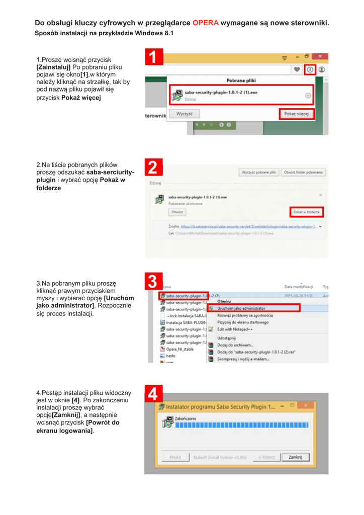 Do obsługi kluczy cyfrowych w przeglądarce OPERA wymagane są nowe sterowniki. Sposób instalacji na przykładzie Windows 8.1 1.Proszę wcisnąć przycisk [Zainstaluj] Po pobraniu pliku pojawi się okno[1],w którym należy kliknąć na strzałkę, tak by pod nazwą pliku pojawił się przycisk Pokaż więcej 2.Na liście pobranych plików proszę odszukać saba-serciurityplugin i wybrać opcję Pokaż w folderze 3.Na pobranym pliku proszę kliknąć prawym przyciskiem myszy i wybierać opcję [Uruchom jako administrator]. Rozpocznie się proces instalacji. 4.Postęp instalacji pliku widoczny jest w oknie [4]. Po zakończeniu instalacji proszę wybrać opcję[Zamknij], a następnie wcisnąć przycisk [Powrót do ekranu logowania].