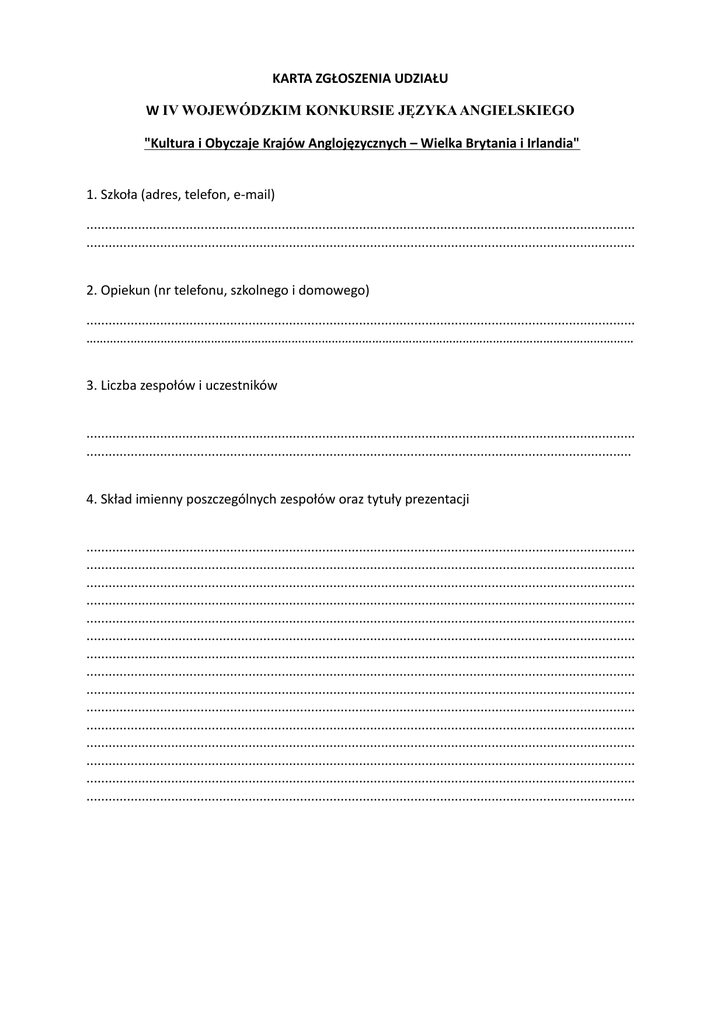 KARTA ZGŁOSZENIA UDZIAŁU W IV WOJEWÓDZKIM KONKURSIE JĘZYKA ANGIELSKIEGO "Kultura i Obyczaje Krajów Anglojęzycznych – Wielka Brytania i Irlandia" 1. Szkoła (adres, telefon, e-mail) ..................................................................................................................................................... ..................................................................................................................................................... 2. Opiekun (nr telefonu, szkolnego i domowego) ..................................................................................................................................................... ………….…………………………………………………………………………………………………………………………………… 3. Liczba zespołów i uczestników ..................................................................................................................................................... .................................................................................................................................................... 4. Skład imienny poszczególnych zespołów oraz tytuły prezentacji ..................................................................................................................................................... ..................................................................................................................................................... ..................................................................................................................................................... ..................................................................................................................................................... ..................................................................................................................................................... ..................................................................................................................................................... ..................................................................................................................................................... ..................................................................................................................................................... ..................................................................................................................................................... ..................................................................................................................................................... ..................................................................................................................................................... ..................................................................................................................................................... ..................................................................................................................................................... ..................................................................................................................................................... .....................................................................................................................................................