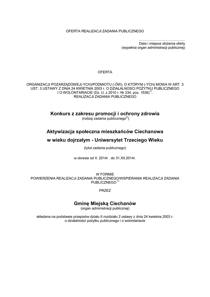 OFERTA REALIZACJI ZADANIA PUBLICZNEGO ………………………………… Data i miejsce złożenia oferty (wypełnia organ administracji publicznej) OFERTA ORGANIZACJI POZARZĄDOWEJ(-YCH)/PODMIOTU (-ÓW), O KTÓRYM (-YCH) MOWA W ART. 3 UST. 3 USTAWY Z DNIA 24 KWIETNIA 2003 r. O DZIAŁALNOSCI POŻYTKU PUBLICZNEGO I O WOLONTARIACIE (Dz. U. z 2010 r. Nr 234, poz. 1536)1), REALIZACJI ZADANIA PUBLICZNEGO Konkurs z zakresu promocji i ochrony zdrowia (rodzaj zadania publicznego2)) Aktywizacja społeczna mieszkańców Ciechanowa w wieku dojrzałym - Uniwersytet Trzeciego Wieku (tytuł zadania publicznego) w okresie od II. 2014r . do 31.XII.2014r. W FORMIE POWIERZENIA REALIZACJI ZADANIA PUBLICZNEGO/WSPIERANIA REALIZACJI ZADANIA 1) PUBLICZNEGO PRZEZ Gminę Miejską Ciechanów (organ administracji publicznej) składana na podstawie przepisów działu II rozdziału 2 ustawy z dnia 24 kwietnia 2003 r. o działalności pożytku publicznego i o wolontariacie I. Dane oferenta/oferentów 1)3) 1) nazwa: Towarzystwo Wiedzy Powszechnej Oddział Regionalny w Ciechanowie 2) forma prawna:4) ( ) stowarzyszenie ( ) fundacja ( ) kościelna osoba prawna ( ) kościelna jednostka organizacyjna ( ) spółdzielnia socjalna ( ) inna………………………………… 3) numer w Krajowym Rejestrze Sądowym, w innym rejestrze lub ewidencji:5) 0000018160 6) 4) data wpisu, rejestracji lub utworzenia: 07.06.2001r. 5) nr NIP: 566 136 98 97 nr REGON: 130422460 6) adres: miejscowość: Ciechanów ul.: Warszawska 10 dzielnica lub inna jednostka pomocnicza:7) ……………………………………….. powiat:8) ciechanowski gmina: Ciechanów województwo: mazowieckie kod pocztowy 06-400 poczta: Ciechanów 7) 2el.: 23 672 50 07 e-mail: [email protected] faks: 23 672 50 07 http:// twpciechanow.strona.pl 8) numer rachunku bankowego: 26 1020 1592 0000 2302 0070 2225 nazwa banku: PKO BP S.A O/Ciechanów 1) 9) nazwiska i imiona osób upoważnionych do reprezentowania oferenta/oferentów : a) Różalski Wincenty b) Rutkowska Maria 10) nazwa, adres i telefon kontaktowy jednostki organizacyjnej bezpośrednio wykonującej zadanie, o którym mowa w ofercie:9) Towarzystwo Wiedzy Powszechnej Oddział Regionalny w Ciechanowie ul. Warszawska 10 06-400 Ciechanów Tel. 23 672 50 07 11) osoba upoważniona do składania wyjaśnień dotyczących oferty (imię i nazwisko oraz nr telefonu kontaktowego) Rutkowska Maria Tel. 23 672 50 07 12) przedmiot działalności pożytku publicznego: b) działalność nieodpłatna pożytku publicznego: prelekcje, odczyty b) działalność odpłatna pożytku publicznego Szkoły, kursy i inne zorganizowane formy działalności oświatowej 13) jeżeli oferent /oferenci1) prowadzi/prowadzą1) działalność gospodarczą: a) numer wpisu do rejestru przedsiębiorców ………………………………………………………….. b) przedmiot działalności gospodarczej ---------------- II. Informacja o sposobie reprezentacji oferentów wobec organu administracji publicznej wraz z przytoczeniem podstawy prawnej 10) ------------------- III. Szczegółowy zakres rzeczowy zadania publicznego proponowanego do realizacji 4. Krótka charakterystyka zadania publicznego Przy starzejącym się społeczeństwie polskim aktywizacja środowisk osób starszych jest ważnym zadaniem dla instytucji publicznych jak i organizacji pozarządowych. Osobom w trzecim wieku należy uświadamiać, że przejście na emeryturę nie jest wykluczeniem z czynnego życia społecznego. Doświadczenie zawodowe i życiowe może stanowić ważną część życia lokalnych grup społecznych. Dlatego też zadanie to jest ważnym dla tworzenia społeczeństwa obywatelskiego, które docenia doświadczenia seniorów. 2. Opis potrzeb wskazujących na konieczność wykonania zadania publicznego, opis ich przyczyn oraz skutków Realizacja tego zadania ma służyć przede wszystkim aktywizacji środowisk osób starszych, poprawieniu sprawności fizycznej i intelektualnej osób starszych. W hierarchii potrzeb człowieka potrzeby psychospołeczne są bardzo rozbudowane. Wydaje się, że u ludzi starszych szczególnie mocno odczuwane są potrzeby: bycia użytecznym, uznania, bezpieczeństwa psychicznego, życzliwości i przyjaźni, przynależności do grupy i zajmowania w niej określonego miejsca, bycia we wspólnocie. W starszym wieku, na skutek zmian w dotychczasowych, podstawowych rolach społecznych, mniej jest naturalnych możliwości zaspokajania potrzeb. Przejście na emeryturę, zmiana pozycji i ról społecznych, osłabienie więzi społecznych nie sprzyjają realizowaniu tej potrzeby. Potrzeba przynależności jest najczęściej realizowana poprzez małe grupy społeczne, jak rodzina i środowisko pracy. Przynależność do grupy daje człowiekowi poczucie własnej wartości, sensu życia, uznania i przydatności. Ważne jest, aby w przewidywaniu nadchodzących zmian w życiu, w sposób świadomy rozszerzać swoje kontakty, przenosząc je na środowisko pozazawodowe i pozarodzinne. Spotkania na UTW będą mogły świetnie zastępować kontakty zawodowe. Pozwalają one ludziom na nowe spotkania ze sobą, dają możliwość działania. UTW daje człowiekowi starszemu względnie stałe środowisko, daje możliwość przynależenia i bycia potrzebnym w grupie.. Ustalają się wspólne zainteresowania, zwyczaje, określony rytm spotkań, nawiązują się i utrwalają nowe znajomości. Posiadanie własnego środowiska i określonych wobec niego obowiązków sprzyja zachowaniu postawy konstruktywnej, dającej zadowolenie z życia, możliwości działania, wyrażania siebie. 3. Opis grup adresatów zadania publicznego Głównymi adresatami tego zadania są osoby starsze – mieszkańcy Ciechanowa, które nie uczestniczą w organizacjach emeryckich jak i te które są członkami różnych organizacji emeryckich. 4. Uzasadnienie potrzeby dofinansowania z dotacji inwestycji związanych z realizacją zadania publicznego, w szczególności ze wskaza