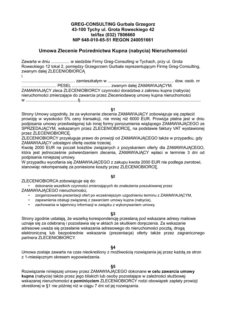 GREG-CONSULTING Gurbała Grzegorz 43-100 Tychy ul. Grota Roweckiego 42 tel/fax (032) 7806660 NIP 648-010-65-51 REGON 240051661 Umowa Zlecenie Pośrednictwa Kupna (nabycia) Nieruchomości Zawarta w dniu ................ w siedzibie Firmy Greg-Consulting w Tychach, przy ul. Grota Roweckiego 12 lokal 2, pomiędzy Grzegorzem Gurbała reprezentującym Firmę Greg-Consulting, zwanym dalej ZLECENIOBIORCĄ i .............................................. zamieszkałym w ......................................................... dow. osob. nr .............................. PESEL ................................. zwanym dalej ZAMAWIAJĄCYM. ZAMAWIAJĄCY zleca ZLECENIOBIORCY czynności doradztwa z zakresu kupna (nabycia) nieruchomości zmierzające do zawarcia przez Zleceniodawcę umowy kupna nieruchomości w .............................................tj........................................................................................................ §1 Strony Umowy uzgodniły, Ŝe za wykonanie zlecenia ZAMAWIAJĄCY zobowiązuje się zapłacić prowizję w wysokości 5% ceny transakcji, nie mniej niŜ 6000 EUR. Prowizja płatna jest w dniu podpisania umowy przedwstępnej lub innej formy porozumienia wiąŜącego ZAMAWIAJĄCEGO ze SPRZEDAJĄCYM, wskazanym przez ZLECENIOBIORCĘ, na podstawie faktury VAT wystawionej przez ZLECENIOBIORCĘ. ZLECENIOBIORCY przysługuje prawo do prowizji od ZAMAWIAJĄCEGO takŜe w przypadku, gdy ZAMAWIAJĄCY udostępni ofertę osobie trzeciej. Kwotę 2000 EUR na poczet kosztów związanych z pozyskaniem oferty dla ZAMAWIAJĄCEGO, która jest jednocześnie potwierdzeniem zlecenia, ZAMAWIAJĄCY wpłaci w terminie 3 dni od podpisania niniejszej umowy. W przypadku wycofania się ZAMAWIAJĄCEGO z zakupu kwota 2000 EUR nie podlega zwrotowi, stanowiąc rekompensatę za poniesione koszty przez ZLECENIOBIORCĘ. §2 ZLECENIOBIORCA zobowiązuje się do: • dokonania wszelkich czynności zmierzających do znalezienia poszukiwanej przez ZAMAWIAJĄCEGO nieruchomości, • • • zorganizowania prezentacji ofert po wcześniejszym uzgodnieniu terminu z ZAMAWIAJĄCYM, zapewnienia obsługi związanej z zawarciem umowy kupna (nabycia), zachowania w tajemnicy informacji w związku z wykonywaniem umowy. §3 Strony zgodnie ustalają, Ŝe wszelką korespondencję przesłaną pod wskazane adresy mailowe uznaje się za odebraną i pozostawia się w aktach ze skutkiem doręczenia. Za wskazanie adresowe uwaŜa się przesłanie wskazania adresowego do nieruchomości pocztą, drogą elektroniczną lub bezpośrednie wskazanie (prezentacja) oferty takŜe przez zagranicznego partnera ZLECENIOBIORCY. §4 Umowa zostaje zawarta na czas nieokreślony z moŜliwością rozwiązania jej przez kaŜdą ze stron z 1-miesięcznym okresem wypowiedzenia. §5 Rozwiązanie niniejszej umowy przez ZAMAWIAJĄCEGO dokonane w celu zawarcia umowy kupna (nabycia) takŜe przez jego bliskich lub osoby pozostające w zaleŜności słuŜbowej wskazanej nieruchomości z pominięciem ZLECENIOBIORCY rodzi obowiązek zapłaty prowizji określonej w §1 nie później niŜ w ciągu 7 dni od jej rozwiązania. §6 ZLECENIOBIORCA nie ponosi odpowiedzialności za działania ZAMAWIAJĄCEGO i SPRZEDAJĄCEGO podjęte po zawarciu umowy kupna, naruszające postanowienia tej umowy lub prawa i obowiązki stron. §7 ZLECENIOBIORCA moŜe dochodzić od ZAMAWIAJĄCEGO odszkodowania za poniesioną szkodę, związaną z rozpowszechnianiem przez niego otrzymanych ofert. §8 W sprawach nieuregulowanych postanowieniami tej Umowy mają zastosowanie odpowiednie przepisy Kodeksu Cywilnego. §9 Spory mogące wyniknąć pomiędzy stronami Umowy rozstrzygane będą przez Sąd Rejonowy w Tychach. §10 ZAMAWIAJĄCY oświadcza, Ŝe zapoznał się z treścią umowy oraz wyraŜa zgodę na przetwarzanie swoich danych osobowych niezbędnych do realizacji Umowy i zgodnie z Ustawą z dnia 29.08.1997 roku o ochronie danych osobowych. §11 ZLECENIOBIORCA oświadcza, Ŝe jest ubezpieczony od odpowiedzialności cywilnej podmiotów uprawnionych do prowadzenia działalności w zakresie Obrotu Nieruchomościami w PZU S.A. §12 Umowę sporządzono w dwóch egzemplarzach, po jednym dla kaŜdej ze stron. Uwaga: przy zakupie nieruchomości, oprócz wynagrodzenia dla ZLECENIOBIORCY, do ceny nieruchomości naleŜy doliczyć: koszty obsługi prawnej, koszty rejestracji nieruchomości, podatek od zakupu nieruchomości, koszty ewentualnej obsługi tłumacza przysięgłego. ZAMAWIAJĄCY – czytelny podpis ZLECENIOBIORCA