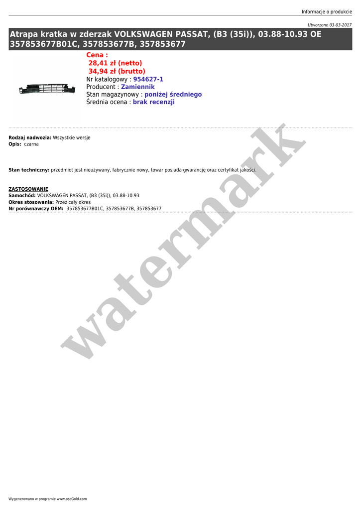 Informacje o produkcie Utworzono 03-03-2017 Atrapa kratka w zderzak VOLKSWAGEN PASSAT, (B3 (35i)), 03.88-10.93 OE 357853677B01C, 357853677B, 357853677 Cena : 28,41 zł (netto) 34,94 zł (brutto) Rodzaj nadwozia: Wszystkie wersje Opis: czarna er m ar k Nr katalogowy : 954627-1 Producent : Zamiennik Stan magazynowy : poniżej średniego Średnia ocena : brak recenzji Stan techniczny: przedmiot jest nieużywany, fabrycznie nowy, towar posiada gwarancję oraz certyfikat jakości. w at ZASTOSOWANIE Samochód: VOLKSWAGEN PASSAT, (B3 (35i)), 03.88-10.93 Okres stosowania: Przez cały okres Nr porównawczy OEM: 357853677B01C, 357853677B, 357853677 Wygenerowano w programie www.oscGold.com