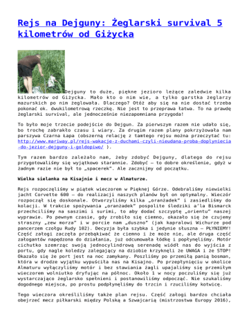 Rejs na Dejguny: Żeglarski survival 5 kilometrów od Giżycka Dejguny to duże, piękne jezioro leżące zaledwie kilka kilometrów od Giżycka. Mało kto o nim wie, a tylko garstka żeglarzy mazurskich po nim żeglowała. Dlaczego? Otóż aby się na nie dostać trzeba pokonać ok. dwukilometrową rzeczkę. Nie jest to przeprawa łatwa. To na prawdę żeglarski survival, ale jednocześnie niezapomniana przygoda! To było moje trzecie podejście do Dejgun. Za pierwszym razem nie udało się, bo trochę zabrakło czasu i wiary. Za drugim razem plany pokrzyżowała nam parszywa Czarna Łapa (obszerną relację z tamtego rejsu można przeczytać tu: http://www.mariway.pl/rejs-wakacje-z-duchami-czyli-nieudana-proba-doplyniecia -do-jezior-dejguny-i-goldopiwo/ ). Tym razem bardzo zależało nam, żeby zdobyć Dejguny, dlatego do rejsu przygotowaliśmy się wyjątkowo starannie. Zdobyć – to dobre określenie, gdyż w żadnym razie nie był to „spacerek”. Ale zacznijmy od początku. Wielka sielanka na Kisajnie i mecz w Almaturze. Rejs rozpoczęliśmy w piątek wieczorem w Pięknej Górze. Odebraliśmy niewielki jacht Corvette 600 – do realizacji naszych planów był on optymalny. Wieczór rozpoczął się doskonale. Otworzyliśmy kilka „oranżadek” i zasiedliśmy do kolacji. W trakcie spożywania „oranżadek” pospolite śledziki a’la Bismarck przechciliśmy na saszimi i surimi, to aby dodać szczyptę „orientu” naszej wyprawie. Po pewnym czasie, gdy zrobiło się ciemno, okazało się że czujemy straszny „zew morza” i w porcie nam „duszno” (jak kapralowi Wichurze pod pancerzem czołgu Rudy 102). Decyzja była szybka i jedynie słuszna – PŁYNIEMY! Część załogi zaczęła przebąkiwać że ciemno i że może nie, ale druga część załogantów napędzona do działania, już odcumowała łódkę i popłynęliśmy. Motór cichutko szemrząc swoją jednocylindrową serenadę wiódł nas do wyjścia z portu, gdy nagle koledzy zalegający na dziobie krzyknęli że UWAGA i że STOP! Okazało się że port jest na noc zamykany. Poszliśmy po przemiłą panią bosman, która w drodze wyjątku wypuściła nas na Kisajno. Po przepłynięciu w okolice Almaturu wyłączyliśmy motór i bez stawiania żagli upajaliśmy się przemiłym wieczorem wolniutko dryfując na północ. Około 1 w nocy poczuliśmy się już wystarczająco żeglarsko spełnieni i postanowiliśmy odpocząć. Nie szukaliśmy dogodnego miejsca, po prostu podpłynęliśmy do trzcin i rzuciliśmy kotwicę. Tego wieczora określiliśmy także plan rejsu. Część załogi bardzo chciała obejrzeć mecz piłkarski między Polską a Szwajcarią (mistrzostwa Europy 2016), więc wpłynięcie na Dejguny opóźniliśmy o jeden dzień, tak aby sobotę spędzić na Kisajnie, gdzie szansa na obejrzenie meczu jest większa niż na Dejgunach. Kolejny dzień zaczęliśmy od kąpieli w jeziorze. Podczas śniadania uzgodniliśmy, że dzisiaj nigdzie nam się nie śpieszy. Nieco później postawiliśmy żagle, opłynęliśmy wyspy na Kisajnie i skierowaliśmy się w stronę „łabędziego szlaku”. Po drodze kolega Czarny zapytał: ” a co to jest tam?” Tam była zatoka „Zimny Kąt”, więc postanowiliśmy ją natychmiast Czarnemu pokazać. Po jakimś czasie w okolicach ośrodka AWF kolega Ziut opowiedział nam kilka szalonych, pełnych dynamitu studenckich przygód związanych z tym miejscem. Ponieważ zaczęła się zbliżać 15.00 postanowiliśmy płynąć do Almaturu, gdzie spodziewaliśmy się znaleźć telewizor i obejrzeć wspomniany mecz. W Almaturze był akurat jakiś obóz, więc dawna „Szklanka”, a dziś zwykła świetlica, wypełniła się sporą grupką kibiców. Po meczu postanowiliśmy płynąć na koniec jeziora Tajty, aby kolejnego dnia być jak najbliżej początku rzeczki prowadzącej na Dejguny. Również i tego wieczora postanowiliśmy nie dobijać do brzegu, lecz rzucić kotwicę przy trzcinach (spodobało nam się). Wieczór, oczywiście doskonały, skończyliśmy pałaszując wykwintny obiad przygotowany przez Robsona. W drodze na Dejguny – przed nami wielka przygoda! Niedziela była niezwykle pogodna, nawet nieco zbyt upalna. Po śniadaniu ruszyliśmy w kierunku rzeczki, którą znaliśmy już z poprzedniej wyprawy i na początku której utknęliśmy wtedy z powodu baaardzo niskiego stanu wody. Tym razem wody było dużo więcej! Pod mostem kolejowym poziom wynosił około 20cm. To jednak trochę mało, aby udało się przepchnąć łódź. Postanowiliśmy zbudować tamę aby podnieść poziom wody. Byliśmy do tego przygotowani. Z domu przywieźliśmy plandekę i pręty. Zbudowana konstrukcja umocniona kamieniami podniosła wodę na tyle, że udało się przeciągnąć łódkę za most. Dalej po krótkim odcinku rzeczki znów rozpoczynało się małe jeziorko. Weszliśmy na żaglówkę i wypatrywaliśmy miejsca gdzie zaczyna się kolejny odcinek rzeczki. Nie było to łatwe, gdyż brzegi zarośnięte są gęstymi trzcinami. W końcu znaleźliśmy rzeczkę przy torach kolejowych i wpłynęliśmy w nią. Oczywiście trzeba było wejść do wody, gdyż płynięcie na silniku nie było możliwe. Nie było to przesadnie miłe, gdyż był gęsty muł, a poza tym zator z trzcin zgromadził w tym miejscu martwe zwierzęta (ponoć ich ciała utworzyły napis bitte hilfe, ale był on widoczny z wysokości 10 metrów, więc go nie zobaczyliśmy). Po wpłynięciu w rzeczkę rozpoczęliśmy żmudną drogę pod jej prąd. Z uwagi na upał na prawdę było to bardzo męczące. Dwóch z nas szło brzegiem i ciągnęło linę, a dwóch pchało łódkę brnąc po wodzie. Co jakiś czas Ziut gubił w mule swojego Crocsa, ale zawsze szczęśliwie go odnajdywał. Obok starej wierzby prawie pożegnał się z nim na dobre, ale w końcu go znalazł (miejsce to nazwaliśmy „zakrętem im. buta Ziutka”). Po około godzinie doszliśmy do mostu drogowego, gdzie dłuższą chwilę zajęło nam usuwanie kam