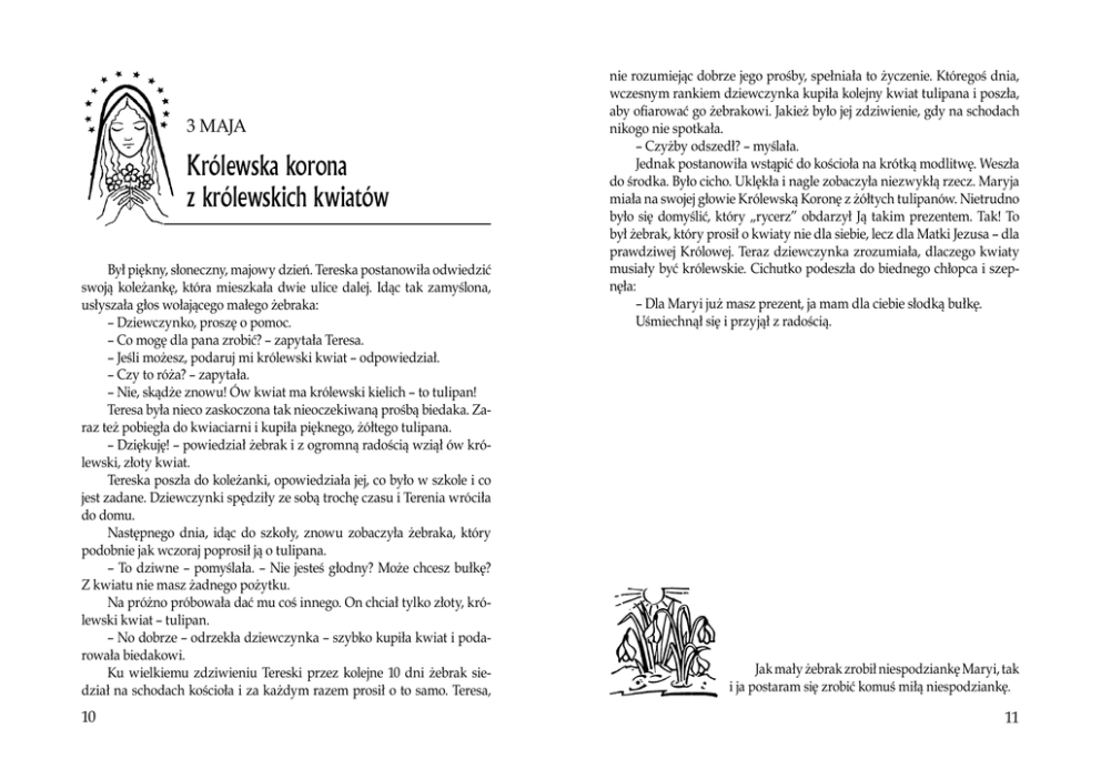 3 MAJA Królewska korona z królewskich kwiatów Był piękny, słoneczny, majowy dzień. Tereska postanowiła odwiedzić swoją koleżankę, która mieszkała dwie ulice dalej. Idąc tak zamyślona, usłyszała głos wołającego małego żebraka: – Dziewczynko, proszę o pomoc. – Co mogę dla pana zrobić? – zapytała Teresa. – Jeśli możesz, podaruj mi królewski kwiat – odpowiedział. – Czy to róża? – zapytała. – Nie, skądże znowu! Ów kwiat ma królewski kielich – to tulipan! Teresa była nieco zaskoczona tak nieoczekiwaną prośbą biedaka. Zaraz też pobiegła do kwiaciarni i kupiła pięknego, żółtego tulipana. – Dziękuję! – powiedział żebrak i z ogromną radością wziął ów królewski, złoty kwiat. Tereska poszła do koleżanki, opowiedziała jej, co było w szkole i co jest zadane. Dziewczynki spędziły ze sobą trochę czasu i Terenia wróciła do domu. Następnego dnia, idąc do szkoły, znowu zobaczyła żebraka, który podobnie jak wczoraj poprosił ją o tulipana. – To dziwne – pomyślała. – Nie jesteś głodny? Może chcesz bułkę? Z kwiatu nie masz żadnego pożytku. Na próżno próbowała dać mu coś innego. On chciał tylko złoty, królewski kwiat – tulipan. – No dobrze – odrzekła dziewczynka – szybko kupiła kwiat i podarowała biedakowi. Ku wielkiemu zdziwieniu Tereski przez kolejne 10 dni żebrak siedział na schodach kościoła i za każdym razem prosił o to samo. Teresa, 10 nie rozumiejąc dobrze jego prośby, spełniała to życzenie. Któregoś dnia, wczesnym rankiem dziewczynka kupiła kolejny kwiat tulipana i poszła, aby ofiarować go żebrakowi. Jakież było jej zdziwienie, gdy na schodach nikogo nie spotkała. – Czyżby odszedł? – myślała. Jednak postanowiła wstąpić do kościoła na krótką modlitwę. Weszła do środka. Było cicho. Uklękła i nagle zobaczyła niezwykłą rzecz. Maryja miała na swojej głowie Królewską Koronę z żółtych tulipanów. Nietrudno było się domyślić, który „rycerz” obdarzył Ją takim prezentem. Tak! To był żebrak, który prosił o kwiaty nie dla siebie, lecz dla Matki Jezusa – dla prawdziwej Królowej. Teraz dziewczynka zrozumiała, dlaczego kwiaty musiały być królewskie. Cichutko podeszła do biednego chłopca i szepnęła: – Dla Maryi już masz prezent, ja mam dla ciebie słodką bułkę. Uśmiechnął się i przyjął z radością. Jak mały żebrak zrobił niespodziankę Maryi, tak i ja postaram się zrobić komuś miłą niespodziankę. 11