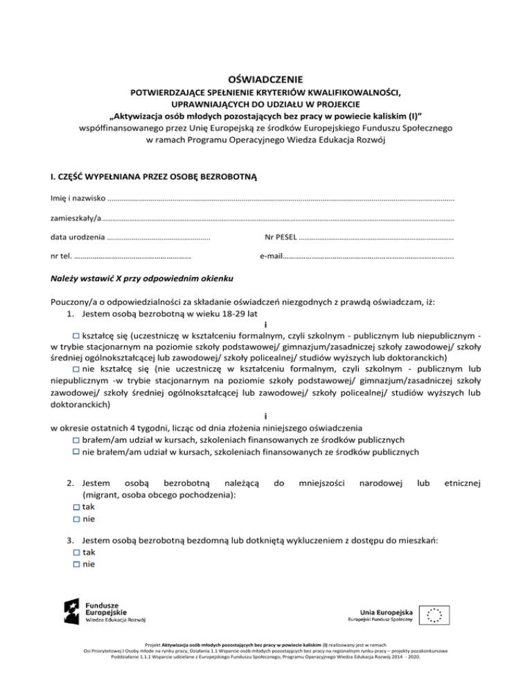 OŚWIADCZENIE POTWIERDZAJĄCE SPEŁNIENIE KRYTERIÓW KWALIFIKOWALNOŚCI, UPRAWNIAJĄCYCH DO UDZIAŁU W PROJEKCIE „Aktywizacja osób młodych pozostających bez pracy w powiecie kaliskim (I)” współfinansowanego przez Unię Europejską ze środków Europejskiego Funduszu Społecznego w ramach Programu Operacyjnego Wiedza Edukacja Rozwój I. CZĘŚĆ WYPEŁNIANA PRZEZ OSOBĘ BEZROBOTNĄ Imię i nazwisko ........................................................................................................................................................................... zamieszkały/a……………………………………………………………………………………………………………………………………………………………………….. data urodzenia ................................................... nr tel. ………………………………………………… Nr PESEL ………………………………………………………………………… e-mail………..…………………………………………….……………….. Należy wstawić X przy odpowiednim okienku Pouczony/a o odpowiedzialności za składanie oświadczeń niezgodnych z prawdą oświadczam, iż: 1. Jestem osobą bezrobotną w wieku 18-29 lat i kształcę się (uczestniczę w kształceniu formalnym, czyli szkolnym - publicznym lub niepublicznym w trybie stacjonarnym na poziomie szkoły podstawowej/ gimnazjum/zasadniczej szkoły zawodowej/ szkoły średniej ogólnokształcącej lub zawodowej/ szkoły policealnej/ studiów wyższych lub doktoranckich) nie kształcę się (nie uczestniczę w kształceniu formalnym, czyli szkolnym - publicznym lub niepublicznym -w trybie stacjonarnym na poziomie szkoły podstawowej/ gimnazjum/zasadniczej szkoły zawodowej/ szkoły średniej ogólnokształcącej lub zawodowej/ szkoły policealnej/ studiów wyższych lub doktoranckich) i w okresie ostatnich 4 tygodni, licząc od dnia złożenia niniejszego oświadczenia brałem/am udział w kursach, szkoleniach finansowanych ze środków publicznych nie brałem/am udział w kursach, szkoleniach finansowanych ze środków publicznych 2. Jestem osobą bezrobotną należącą (migrant, osoba obcego pochodzenia): tak nie do mniejszości narodowej lub etnicznej 3. Jestem osobą bezrobotną bezdomną lub dotkniętą wykluczeniem z dostępu do mieszkań: tak nie Projekt Aktywizacja osób młodych pozostających bez pracy w powiecie kaliskim (I) realizowany jest w ramach Osi Priorytetowej I Osoby młode na rynku pracy, Działania 1.1 Wsparcie osób młodych pozostających bez pracy na regionalnym rynku pracy – projekty pozakonkursowe Poddziałanie 1.1.1 Wsparcie udzielane z Europejskiego Funduszu Społecznego, Programu Operacyjnego Wiedza Edukacja Rozwój 2014 - 2020. 4. Jestem osobą bezrobotną przebywającą w gospodarstwie domowym bez osób pracujących, w tym: w gospodarstwie domowym z dziećmi pozostającymi na utrzymaniu: tak nie 5. Jestem osobą bezrobotną żyjącą w gospodarstwie składającym się z jednej osoby dorosłej i dzieci pozostających na utrzymaniu. tak nie 6. Jestem osobą bezrobotną w innej niekorzystnej sytuacji społecznej niż wymienione powyżej. tak jakiej?……………………………………………………………………………………………………………………………… nie 7. Zobowiązuję się do dostarczenia w terminie do 7 dni od dnia podjęcia zatrudnienia/samozatrudnienia kopii umowy o pracę lub umowy cywilnoprawnej, zaświadczenia z zakładu pracy o zatrudnieniu, dokumentów potwierdzających prowadzenie działalności gospodarczej. 8. Zapoznałem/am się z Zasadami uczestnictwa w projekcie „Aktywizacja osób młodych pozostających bez pracy w powiecie kaliskim (I)” dostępnymi na stronie internetowej www.pup.kalisz.pl i zobowiązuję się do ich przestrzegania. ………………………………………………………………. Data i czytelny podpis osoby bezrobotnej Projekt Aktywizacja osób młodych pozostających bez pracy w powiecie kaliskim (I) realizowany jest w ramach Osi Priorytetowej I Osoby młode na rynku pracy, Działania 1.1 Wsparcie osób młodych pozostających bez pracy na regionalnym rynku pracy – projekty pozakonkursowe Poddziałanie 1.1.1 Wsparcie udzielane z Europejskiego Funduszu Społecznego, Programu Operacyjnego Wiedza Edukacja Rozwój 2014 - 2020. II. CZĘŚĆ WYPEŁNIANA PRZEZ PRACOWNIKA URZĘDU Należy wstawić X przy odpowiednim okienku A. Weryfikacja obligatoryjnych kryteriów kwalifikowalności: 1. Osoba bezrobotna z ustalonym profilem pomocy: I II 2. Osoba bezrobotna w wieku: do 25 roku życia (do dnia 25. urodzin) zarejestrowana w PUP nie dłużej niż 4 miesiące liczone od dnia rejestracji – dotyczy wyłącznie osób młodych zarejestrowanych w PUP po 1.01.2015r., lub do 25 roku życia (do dnia 25. urodzin) zarejestrowana w PUP po 1.01.2015r., której w okresie 4 miesięcy od dnia rejestracji przedstawiono odpowiednią ofertę wsparcia zgodnie z Planem realizacji Gwarancji dla młodzieży, lecz nadal figuruje w rejestrze Urzędu, lub do 25 roku życia (do dnia 25. urodzin) zarejestrowana w PUP w roku 2014, lub od 25 do 29 roku życia; 3. Osoba bezrobotna - tzw. NEET. tak nie Wynik weryfikacji Osoba bezrobotna: kwalifikuje się do udziału w projekcie „Aktywizacja osób młodych pozostających bez pracy w powiecie kaliskim (I)” nie kwalifikuje się do udziału w projekcie „Aktywizacja osób młodych pozostających bez pracy w powiecie kaliskim (I)” B. Weryfikacja w projekcie: kryteriów dodatkowych decydujących o pierwszeństwie uczestnictwa 1. Osoba bezrobotna do 25 roku życia (przed dniem 25 urodzin) nieprzerwanie pozostająca bez zatrudnienia przez okres ponad 6 miesięcy (należy uwzględnić łącznie dane systemu Syriusz dotyczące okresu ostatniej rejestracji i dane z oświadczenia osoby bezrobotnej). tak nie Projekt Aktywizacja osób młodych pozostaj