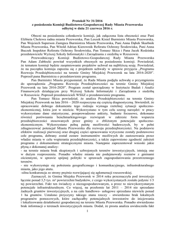 Protokół Nr 31/2016 z posiedzenia Komisji Budżetowo-Gospodarczej Rady Miasta Przeworska odbytej w dniu 21 czerwca 2016 r. Obecni na posiedzeniu członkowie komisji, jak załączona lista obecności oraz Pani Elżbieta Cholewa radna miasta Przeworska, Pan Leszek Kisiel Burmistrz Miasta Przeworska, Pan Wojciech Superson Zastępca Burmistrza Miasta Przeworska, Pani Anna Dąbek Skarbnik Miasta Przeworska, Pan Witold Adrian Kierownik Referatu Ochrony Środowiska, Pani Anna Buczek Inspektor Referatu Ochrony Środowiska, Pan Tomasz Skica i Pana Jacek Rodzinka przedstawiciele Wyższej Szkoły Informatyki i Zarządzania z siedzibą w Rzeszowie. Przewodniczący Komisji Budżetowo-Gospodarczej Rady Miasta Przeworska Pan Adam Zabłocki powitał wszystkich obecnych na posiedzeniu komisji. Powiedział, że tematem komisji będzie zaopiniowanie projektów uchwał na najbliższą sesję. Powiedział, że na początku komisja zapozna się z projektem uchwały w sprawie przyjęcia „Programu Rozwoju Przedsiębiorczości na terenie Gminy Miejskiej Przeworsk na lata 2016-2020”. Poprosił pana Burmistrza o przedstawienie programu. Pan Burmistrz Miasta przypomniał, że Rada Miasta podjęła uchwałę o przystąpieniu do sporządzenia „Programu Rozwoju Przedsiębiorczości na terenie Gminy Miejskiej Przeworsk na lata 2016-2020”. Program został sporządzony w Instytucie Badań i Analiz Finansowych działającym przy Wyższej Szkole Informatyki i Zarządzania z siedzibą w Rzeszowie. Poprosił przedstawicieli WSIiZ o przedstawienie programu. Pan Tomasz Skica powiedział, że analiza Przedsiębiorczości na terenie Gminy Miejskiej Przeworsk na lata 2016 – 2020 rozpoczyna się częścią diagnostyczną. Stwierdził, że opracowanie dobrego dokumentu tego rodzaju wymaga rzetelnej sytuacji społecznoekonomicznej, która jest w mieście. Wykorzystano w tym celu szereg narzędzi: w pracy wykorzystano dane statystyczne, przeprowadzono ankiety, badanie focusowe, dokonano również porównania benchmarkingowego rozwiązań w zakresie form wsparcia przedsiębiorczości stosowanych przez gminy o zbliżonym potencjale społecznoekonomicznym. Wykorzystano pełną paletę możliwości badawczych, by w pełni zdiagnozować potencjał Miasta Przeworska dla rozwoju przedsiębiorczości. Na podstawie efektów realizacji pierwszej oraz drugiej części opracowania wytyczone zostały podstawowe cele programu, dobrany został zestaw instrumentów możliwych do zastosowania przez władze miasta w celu wspierania przedsiębiorczości, a także zapewniono zgodność założeń programu z dokumentami strategicznymi miasta. Następnie zaprezentował wnioski jakie płyną z dokonanej analizy: - na terenie miasta brak skupionych i uzbrojonych terenów inwestycyjnych, istnieją one w dużym rozproszeniu. Ponadto władze miasta nie podejmowały rozmów z gminami ościennymi, w sprawie spójnej polityki w sprawach zagospodarowania przestrzennego terenów. - nie wykorzystuje się położenia geograficznego i komunikacyjnego, infrastrukturalnego miasta, jako jego atutu. -silna konkurencja ze strony prężnie rozwijającej się aglomeracji rzeszowskiej. Zaznaczył, że Gmina Miejska Przeworsk w 2014 roku przeznaczyła pod inwestycje łącznie ponad 3,5 tys. m² powierzchni budynków, z czego wykorzystanych zostało jedynie 1/3 tej powierzchni. Fakt ten świadczy o niezagospodarowanym, a przez to niewykorzystanym potencjale infrastrukturalnym. Co więcej, na przełomie lat 2011 – 2014 nie sprzedano żadnych gruntów inwestycyjnych, a na cale handlowo- usługowe sprzedano niewiele ponad 1 ha gruntów. Ustalono przyczyny takiego stanu rzeczy - stwierdzono brak lokalnych programów pomocowych, które zachęcałby potencjalnych inwestorów do inicjowania i lokalizowania działalności gospodarczej na terenie Miasta Przeworska. Ponadto stwierdzono brak informacji o terenach inwestycyjnych miasta. Dodał, że prosta analiza uwidoczniła fakt 1 bardzo niskiej świadomości nawet wśród mieszkańców Przeworska istnienia terenów inwestycyjnych. Analiza gospodarki lokalnej również wykazuje wiele niedomagań. Stwierdzono, że na terenie miasta znacząca ilość podmiotów gospodarczych ( 94%) stanowią mikroprzedsiębiorstwa, zatrudniające do 9 osób. Najwięcej takich firm stanowią te, które świadczą usługi w branży usługowej i budowlanej. Pracodawcy najczęściej poszukują pracowników z wykształceniem średnim, ukierunkowanym branżowo, zawodowo. Miasto dotykają ponadto problemy demograficzne. Rośnie liczba osób w wieku poprodukcyjnym. Pojawia się również problem z wyspecjalizowana kadrą. Zaznaczył, że młodzi, dobrze wykształceni ludzie wyjeżdżają z miejscowości w poszukiwaniu pracy do większych aglomeracji miejskich bądź za granicę Polski. Naturalnym partnerem dla wspierania przedsiębiorczości są organizacje III sektora. Na terenie miasta jest kilka podmiotów, które klasyfikuje się jako organizacje pozarządowe, ale nie są to instytucje otoczenia biznesu. Powiedział, że samorząd nie ma naturalnego partnera dla tworzenia uwarunkowań rozwojowych. Analizowano wszystkie wyżej wskazane aspekty. Wysunięto z ww. analizy następujące wnioski : - władze miasta poprzednich kadencji stosowały tylko doraźnie środki w postaci rozwiązań infrastrukturalnych. - władze miasta nie podejmowały rozmów z gminami ościennymi, w sprawie spójnej polityki w sprawach zagospodarowania przestrzennego terenów. - wskazywano ponadto prowadzenie stabilnej polityki podatkowej, ale założenie to nie znalazło odzwierciedlenia w żadnym dokumencie: brak założeń, działań i przełożenia na budżet miejski polityki fiskalnej. Wprowadzano jedynie doraźne, krótkotrwałe preferencje fiskalne, dbano o przepływ informacji między środowiskami przedsiębiorców. Zaznaczył, iż zawierano partnerstwa na rzecz pozyskiwania środków finansowych, podejmowano działania o charakterze gospodarczym, ale władze miasta