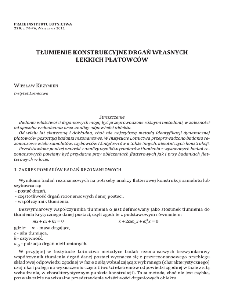 PRACE iNSTYTUTU LOTNiCTWA 220, s. 70-76, Warszawa 2011 TłUmiENiE kONSTRUkCYjNE dRgAń WłASNYCh LEkkiCh PłATOWCóW WIeSłaW KrzymIeń Instytut Lotnictwa Streszczenie Badania właściwości drganiowych mogą być przeprowadzone różnymi metodami, w zależności od sposobu wzbudzania oraz analizy odpowiedzi obiektu. Od wielu lat skuteczną i dokładną, choć nie najszybszą metodą identyfikacji dynamicznej płatowców pozostają badania rezonansowe. W Instytucie Lotnictwa przeprowadzono badania rezonansowe wielu samolotów, szybowców i śmigłowców a także innych, nielotniczych konstrukcji. Przedstawione poniżej wnioski z analizy wyników pomiarów tłumienia z wykonanych badań rezonansowych powinny być przydatne przy obliczeniach flatterowych jak i przy badaniach flatterowych w locie. 1. zaKreS pomIaróW badań rezoNaNSoWych Wynikami badań rezonansowych na potrzeby analizy flatterowej konstrukcji samolotu lub szybowca są: - postać drgań, - częstotliwość drgań rezonansowych danej postaci, - współczynnik tłumienia. bezwymiarowy współczynnika tłumienia α jest definiowany jako stosunek tłumienia do tłumienia krytycznego danej postaci, czyli zgodnie z podstawowym równaniem: mx + cx + kx = 0 x + 2o x + o2 x = 0 gdzie: m - masa drgająca, c - siła tłumiąca, k - sztywność, ωo - pulsacja drgań nietłumionych. W przyjętej w Instytucie Lotnictwa metodyce badań rezonansowych bezwymiarowy współczynnik tłumienia drgań danej postaci wyznacza się z przyrezonansowego przebiegu składowej odpowiedzi zgodnej w fazie z siłą wzbudzającą z wybranego (charakterystycznego) czujnika i polega na wyznaczeniu częstotliwości ekstremów odpowiedzi zgodnej w fazie z siłą wzbudzenia, w charakterystycznym punkcie konstrukcji). Taka metoda, choć nie jest szybka, pozwala także na wizualne przedstawienie właściwości drganiowych obiektu. TłumIeNIe KoNSTruKcyjNe drgań WłaSNych LeKKIch płaToWcóW 71 rys. 1. przedstawia wykres ustalonej odpowiedzi, rozdzielonej na składową zgodną i przesuniętą w fazie o π/2 względem siły wzbudzającej, liniowego obiektu na wzbudzenie stałą siłą monoharmoniczną. rys. 1. Ilustracja metody wyznaczania współczynnika tłumienia drgań α analizie poddano wyniki badań rezonansowych: – 3 modeli dynamicznie podobnych (dpmS) – 8 szybowców (kompozytowych), – 4 samolotów kompozytowych, – 12 samolotów metalowych. Wszystkie pomiary zostały wykonane w ciągu ostatnich lat przy zastosowaniu tej samej, opisanej metody badań. W analizie pominięto pomiary dla postaci sprzężonych, tj dla postaci bardzo niewiele różniących się częstotliwościami (w zależności od wielkości tłumienia, praktycznie poniżej 3% różnicy częstotliwości). podczas badan rezonansowych obiekt jest podwieszany na elastycznym zawieszeniu (np. gumowych sznurach), które eliminuje wpływ sztywności i tłumienia podparcia na obiekt, symulując stan obiektu „w locie”. 2. WSpółczyNNIK TłumIeNIa a poSTacIe drgań do analizy wybrano podstawowe, typowe postacie drgań występujące we wszystkich płatowcach o klasycznym układzie. W tabelach zestawiono podstawowe postacie drgań rezonansowych badanych konstrukcji w czterech grupach: – postacie symetryczne (typu „zginanie” i „skręcanie”), – postacie antysymetryczne (typu „zginanie” i „skręcanie”), – wychylanie powierzchni sterowych, – skręcanie sterów. Typową postacią drgań sterów jest także zginanie, jednak ze względu na stosunkowo duży wpływ ich zawieszenia (sztywność napędu, liczba i usytuowanie zawiasów) oraz udział pozostałej części konstrukcji płatowca (skrzydeł, stateczników), do analizy wybrano tylko skręcanie. ponadto wśród postaci symetrycznych i antysymetrycznych jest łącznie tylko 5 postaci typu „skręcanie”. ponieważ stery są zwykle wykonane w tej samej technologii co kadłub i skrzydła, wyniki te można więc przyrównać do pozostałych postaci typu „skręcanie”. badania rezonansowe układów sterowania wykonuje się zwykle „ze swobodnym drążkiem” lub „z zablokowanym drążkiem” (w różnych konfiguracjach). do analizy przyjęto tylko podstawową postać, jaką jest wychylenie powierzchni sterowej bez blokady sterownicy czyli „z jednym węzłem w układzie sterowania”. 72 WIeSłaW KrzymIeń W tabelach 1 - 4 w kolumnach zestawiono średnie arytmetyczne wartości współczynnika tłumienia z wyników pomiarów wszystkich wybranych samolotów, szybowców i modeli dynamicznie podobnych: – współczynnika tłumienia α (wyrażonego w %), – wartości odchylenia standardowego σ, – ilości pomiarów n (na podstawie których obliczono wartość średnią i odchylenie standardowe) dla typowych postaci drgań. Tab. 1. postacie symetryczne Tab. 2. postacie antysymetryczne Tab. 3. postacie drgań sterów Tab. 4. postacie układów sterowania TłumIeNIe KoNSTruKcyjNe drgań WłaSNych LeKKIch płaToWcóW 73 analizując powyższe wielkości można zauważyć, że: – nie ma istotnej różnicy pomiędzy współczynnikami tłumienia postaci symetrycznych i antysymetrycznych, – współczynnik tłumienia drgań pierwszej postaci symetrycznej oraz antysymetrycznej (t.j. o najniższych częstotliwościach) jest niższy od pozostałych; tłumienie pozostałych postaci jest na podobnym poziomie, – współczynnik tłumienia drgań jest niższy w przypadku postaci, gdy odkształca się jeden (główny) element np. statecznik poziomy, ster wysokości lub kierunku, – współczynniki tłumienia podstawowych rezonansów układów sterowania są większe od innych postaci. 3. WSpółczyNNIK TłumIeNIa a KoNSTruKcja płaToWca badane konstrukcje można podzielić na trzy grupy ze względu na ich konstrukcję: – belkową konstrukcję dynamicznie podobnych modeli samolotów, – segmentowa (skorupową) konstrukcję samolotów oraz szybowców laminatowych, – elementową (półskorupową) konstrukcję samolotów metalow