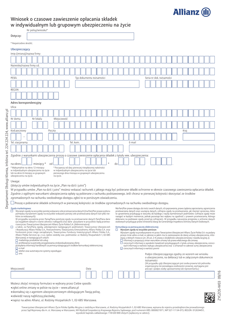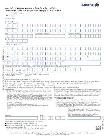 Wniosek o czasowe zawieszenie opłacania składek w indywidualnym lub grupowym ubezpieczeniu na życie Nr polisy/wniosku* Dotyczy: * Niepotrzebne skreślić. Ubezpieczający Imię (imiona)/nazwa firmy Nazwisko/nazwa firmy cd. PESEL Typ dokumentu tożsamości Seria nr dok. tożsamości REGON Adres korespondencyjny Nr domu Nr lokalu Miejscowość Poczta Kod pocztowy Kraj – Tel. stacjonarny Tel. kom. E-mail Zgodnie z warunkami ubezpieczenia proszę o czasowe zawieszenie opłacania składek z tytułu ww. ubezpieczenia: na okres miesięcy * * Maksymalnie na okres 12 miesięcy w indywidualnym ubezpieczeniu na życie lub na okres 6 miesięcy w grupowym ubezpieczeniu na życie. od * do . * Począwszy od daty pierwszej nieopłaconej należności w indywidualnym ubezpieczeniu na życie lub pierwszego dnia miesiąca w grupowym ubezpieczeniu na życie. Uwaga: (dotyczy umów indywidualnych na życie „Plan na dziś i jutro”) W przypadku umów „Plan na dziś i jutro” możesz wskazać rachunek z jakiego mają być pobierane składki ochronne w okresie czasowego zawieszenia opłacania składek. Zgodnie z ogólnymi warunkami ubezpieczenia opłaty są pobierane z rachunku podstawowego. Jeśli chcesz w pierwszej kolejności skorzystać ze środków zgromadzonych na rachunku swobodnego dostępu zgłoś to w poniższym oświadczeniu. Proszę o pobieranie składek ochronnych w pierwszej kolejności ze środków zgromadzonych na rachunku swobodnego dostępu. Zgoda marketingowa: Wyrażam zgodę na wszystkie poniżej wskazane cele przetwarzania danych (ma Pani/Pan prawo wyboru pomiędzy wyrażeniem zgody na wszystkie wskazane poniżej cele przetwarzania danych lub tylko niektóre ze wskazanych): W przypadku wyrażenia przez Panią/Pana poniższej zgody na przetwarzanie danych Pani/Pana dane (za wyjątkiem danych o stanie zdrowia i nałogach) oraz dane pozyskane w przyszłości będą przetwarzane przez Towarzystwo Ubezpieczeń Allianz Życie Polska S.A. (Administratora) a także, za Pani/Pana zgodą, udostępniane następującym podmiotom: Towarzystwo Ubezpieczeń i Reasekuracji Allianz Polska S.A., Powszechnemu Towarzystwu Emerytalnemu Allianz Polska S.A. oraz funduszom przez niego zarządzanym, Towarzystwu Funduszy Inwestycyjnych Allianz Polska S.A., Allianz Polska Services sp. z o.o. (adres siedziby ww. podmiotów: ul. Rodziny Hiszpańskich 1, 02-685 Warszawa), w następujących celach: marketingu produktów lub usług profilowania na potrzeby przygotowania zindywidualizowanej oferty przesyłania informacji handlowych za pomocą następujących środków komunikacji elektronicznej: e-mail telefon oraz automatyczne systemy wywołujące sms Miejscowość Data Ma Pani/Pan prawo dostępu do treści swoich danych, ich poprawiania, prawo żądania zaprzestania, ograniczenia przetwarzania danych oraz usunięcia danych, cofnięcia zgody na przetwarzanie, jak również sprzeciwu, które to uprawnienia przysługują w stosunku do każdego z wyżej wymienionych podmiotów. Cofnięcie zgody może nastąpić w każdym momencie, jednak pozostaje bez wpływu na zgodność z prawem przetwarzania, którego dokonano na podstawie zgody przed jej cofnięciem. W przypadku naruszenia przepisów o ochronie danych osobowych przysługuje prawo wniesienia skargi do Generalnego Inspektora Ochrony Danych Osobowych. Komunikacja za pomocą poczty elektronicznej: Wyrażam zgodę na wszystkie poniższe: Wyrażam zgodę na przekazywanie mi przez Towarzystwo Ubezpieczeń Allianz Życie Polska S.A. na podany przeze mnie adres e-mail, w zakresie w jakim ma to zastosowanie do danej umowy ubezpieczenia, informacji, o których mowa w art. 20 ust. 2-4 ustawy o działalności ubezpieczeniowej i reasekuracyjnej, tj: informacji o propozycji zmian warunków umowy lub prawa właściwego dla umowy corocznych informacji o wysokości świadczeń przysługujących z tytułu umowy ubezpieczenia, corocznych informacji o wartości wykupu ubezpieczenia oraz o zmianach w zakresie sumy ubezpieczenia corocznych informacji o wartości premii Podpis Ubezpieczającego zgodny ze wzorem we wniosku o ubezpieczenie, na deklaracji lub w załączonym dokumencie tożsamości (W przypadku gdy Ubezpieczającym jest osoba prawna lub jednostka organizacyjna nie posiadająca osobowości prawnej, wymagana jest pieczęć i podpis osoby upoważnionej lub reprezentanta.) Możesz złożyć niniejszy formularz w wybrany przez Ciebie sposób: •zgłoś online zmiany w polisie na życie – www.allianz.pl •skontaktuj się z agentem ubezpieczeniowym obsługującym Twoją polisę, •odwiedź naszą najbliższą placówkę, •napisz na adres Allianz, ul. Rodziny Hiszpańskich 1, 02-685 Warszawa. Towarzystwo Ubezpieczeń Allianz Życie Polska Spółka Akcyjna z siedzibą w Warszawie, ul. Rodziny Hiszpańskich 1, 02-685 Warszawa, wpisana do rejestru przedsiębiorców prowadzonego przez Sąd Rejonowy dla m. st. Warszawy w Warszawie, XIII Wydział Gospodarczy Krajowego Rejestru Sądowego, pod numerem KRS: 0000021971, NIP 527-17-54-073, REGON 012634451, wysokość kapitału zakładowego: 118 630 000 złotych (wpłacony w całości). ZYGZOS-W03 09/16 Departament Obsługi Klienta, Infolinia tel. 224 224 224, www.allianz.pl Ulica