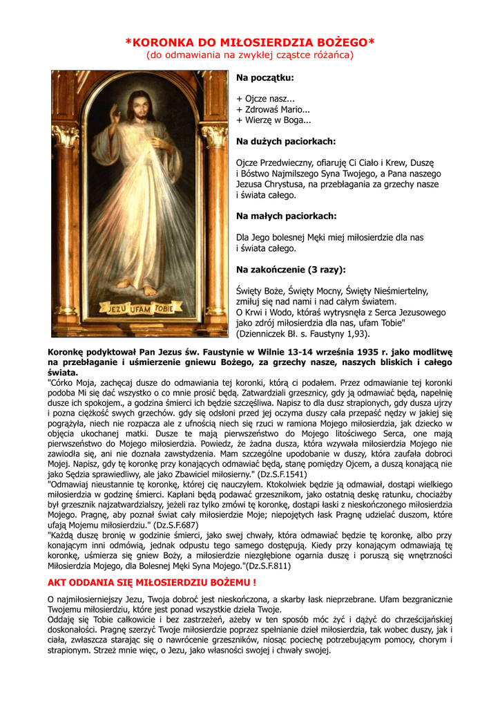 *KORONKA DO MIŁOSIERDZIA BOŻEGO* (do odmawiania na zwykłej cząstce różańca) Na początku: + Ojcze nasz... + Zdrowaś Mario... + Wierzę w Boga... Na dużych paciorkach: Ojcze Przedwieczny, ofiaruję Ci Ciało i Krew, Duszę i Bóstwo Najmilszego Syna Twojego, a Pana naszego Jezusa Chrystusa, na przebłagania za grzechy nasze i świata całego. Na małych paciorkach: Dla Jego bolesnej Męki miej miłosierdzie dla nas i świata całego. Na zakończenie (3 razy): Święty Boże, Święty Mocny, Święty Nieśmiertelny, zmiłuj się nad nami i nad całym światem. O Krwi i Wodo, któraś wytrysnęła z Serca Jezusowego jako zdrój miłosierdzia dla nas, ufam Tobie" (Dzienniczek Bł. s. Faustyny 1,93). Koronkę podyktował Pan Jezus św. Faustynie w Wilnie 13-14 września 1935 r. jako modlitwę na przebłaganie i uśmierzenie gniewu Bożego, za grzechy nasze, naszych bliskich i całego świata. "Córko Moja, zachęcaj dusze do odmawiania tej koronki, którą ci podałem. Przez odmawianie tej koronki podoba Mi się dać wszystko o co mnie prosić będą. Zatwardziali grzesznicy, gdy ją odmawiać będą, napełnię dusze ich spokojem., a godzina śmierci ich będzie szczęśliwa. Napisz to dla dusz strapionych, gdy dusza ujrzy i pozna ciężkość swych grzechów. gdy się odsłoni przed jej oczyma duszy cała przepaść nędzy w jakiej się pogrążyła, niech nie rozpacza ale z ufnością niech się rzuci w ramiona Mojego miłosierdzia, jak dziecko w objęcia ukochanej matki. Dusze te mają pierwszeństwo do Mojego litościwego Serca, one mają pierwszeństwo do Mojego miłosierdzia. Powiedz, że żadna dusza, która wzywała miłosierdzia Mojego nie zawiodła się, ani nie doznała zawstydzenia. Mam szczególne upodobanie w duszy, która zaufała dobroci Mojej. Napisz, gdy tę koronkę przy konających odmawiać będą, stanę pomiędzy Ojcem, a duszą konającą nie jako Sędzia sprawiedliwy, ale jako Zbawiciel miłosierny." (Dz.S.F.1541) "Odmawiaj nieustannie tę koronkę, której cię nauczyłem. Ktokolwiek będzie ją odmawiał, dostąpi wielkiego miłosierdzia w godzinę śmierci. Kapłani będą podawać grzesznikom, jako ostatnią deskę ratunku, chociażby był grzesznik najzatwardzialszy, jeżeli raz tylko zmówi tę koronkę, dostąpi łaski z nieskończonego miłosierdzia Mojego. Pragnę, aby poznał świat cały miłosierdzie Moje; niepojętych łask Pragnę udzielać duszom, które ufają Mojemu miłosierdziu." (Dz.S.F.687) "Każdą duszę bronię w godzinie śmierci, jako swej chwały, która odmawiać będzie tę koronkę, albo przy konającym inni odmówią, jednak odpustu tego samego dostępują. Kiedy przy konającym odmawiają tę koronkę, uśmierza się gniew Boży, a miłosierdzie niezgłębione ogarnia duszę i poruszą się wnętrzności Miłosierdzia Mojego, dla Bolesnej Męki Syna Mojego."(Dz.S.F.811) AKT ODDANIA SIĘ MIŁOSIERDZIU BOŻEMU ! O najmiłosierniejszy Jezu, Twoja dobroć jest nieskończona, a skarby łask nieprzebrane. Ufam bezgranicznie Twojemu miłosierdziu, które jest ponad wszystkie dzieła Twoje. Oddaję się Tobie całkowicie i bez zastrzeżeń, ażeby w ten sposób móc żyć i dążyć do chrześcijańskiej doskonałości. Pragnę szerzyć Twoje miłosierdzie poprzez spełnianie dzieł miłosierdzia, tak wobec duszy, jak i ciała, zwłaszcza starając się o nawrócenie grzeszników, niosąc pociechę potrzebującym pomocy, chorym i strapionym. Strzeż mnie więc, o Jezu, jako własności swojej i chwały swojej.