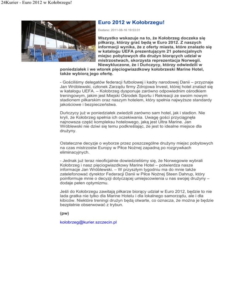 24Kurier - Euro 2012 w KołobrzegX Euro 2012 w Kołobrzegu! Dodano: 2011-08-16 19:53:01 Wszystko wskazuje na to, że Kołobrzeg doczeka się piłkarzy, którzy grać będą w Euro 2012. Z naszych informacji wynika, że z oferty miasta, które znalazło się w katalogu UEFA prezentującym 21 potencjalnych miejsc pobytowych dla drużyn biorących udział w mistrzostwach, skorzysta reprezentacja Norwegii. Niewykluczone, że i Duńczycy, którzy odwiedzili w poniedziałek i we wtorek pięciogwiazdkowy kołobrzeski Marine Hotel, także wybiorą jego ofertę. - Gościliśmy delegatów federacji futbolowej i kadry narodowej Danii – przyznaje Jan Wróblewski, członek Zarządu firmy Zdrojowa Invest, której hotel znalazł się w katalogu UEFA. – Kołobrzeg dysponuje zarówno odpowiednim ośrodkiem treningowym, jakim jest Miejski Ośrodek Sportu i Rekreacji ze swoim nowym stadionem piłkarskim oraz naszym hotelem, który spełnia najwyższe standardy jakościowe i bezpieczeństwa. Duńczycy już w poniedziałek zwiedzili zarówno sam hotel, jak i stadion. Nie kryli, że Kołobrzeg spełnia ich oczekiwania. Uwagę gości przyciągnęła najnowsza część kompleksu hotelowego, jaką jest Ultra Marine. Jan Wróblewski nie dziwi się temu podkreślając, że jest to idealne miejsce dla drużyny. Ostateczne decyzje o wyborze przez poszczególne drużyny miejsc pobytowych na czas mistrzostw Europy w Piłce Nożnej zapadną po rozgrywkach eliminacyjnych. - Jednak już teraz nieoficjalnie dowiedzieliśmy się, że Norwegowie wybrali Kołobrzeg i nasz pięciogwiazdkowy Marine Hotel – potwierdza nasze informacje Jan Wróblewski. – W przyszłym tygodniu ma do mnie także zatelefonować dyrektor Federacji Danii w Piłce Nożnej Steen Dahrup, który poinformuje mnie o decyzji dotyczącej umiejscowienia u nas swojej drużyny – dodaje pełen optymizmu. Jeśli do Kołobrzegu zawitają piłkarze biorący udział w Euro 2012, będzie to nie lada gratka nie tylko dla Marine Hotelu i dla lokalnego samorządu, ale i dla kibiców. Niektóre treningi drużyn będą otwarte, co oznacza, że można je będzie bezpłatnie obserwować z trybun. (pw) [email protected]