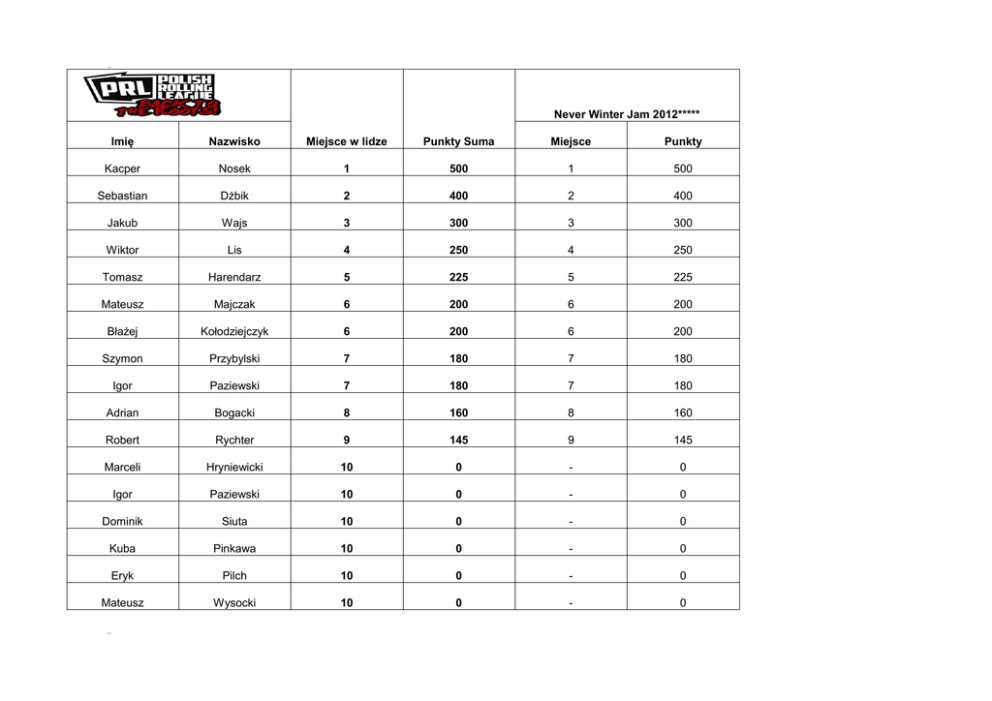 Arkusz1 Never Winter Jam 2012***** Imię Nazwisko Miejsce w lidze Punkty Suma Miejsce Punkty Kacper Nosek 1 500 1 500 Sebastian Dżbik 2 400 2 400 Jakub Wajs 3 300 3 300 Wiktor Lis 4 250 4 250 Tomasz Harendarz 5 225 5 225 Mateusz Majczak 6 200 6 200 Błażej Kołodziejczyk 6 200 6 200 Szymon Przybylski 7 180 7 180 Igor Paziewski 7 180 7 180 Adrian Bogacki 8 160 8 160 Robert Rychter 9 145 9 145 Marceli Hryniewicki 10 0 - 0 Igor Paziewski 10 0 - 0 Dominik Siuta 10 0 - 0 Kuba Pinkawa 10 0 - 0 Eryk Pilch 10 0 - 0 Mateusz Wysocki 10 0 - 0 Strona 1 Arkusz1 Bartosz Malec 10 0 - 0 Krzysztof Czerkas 10 0 - 0 Strona 2