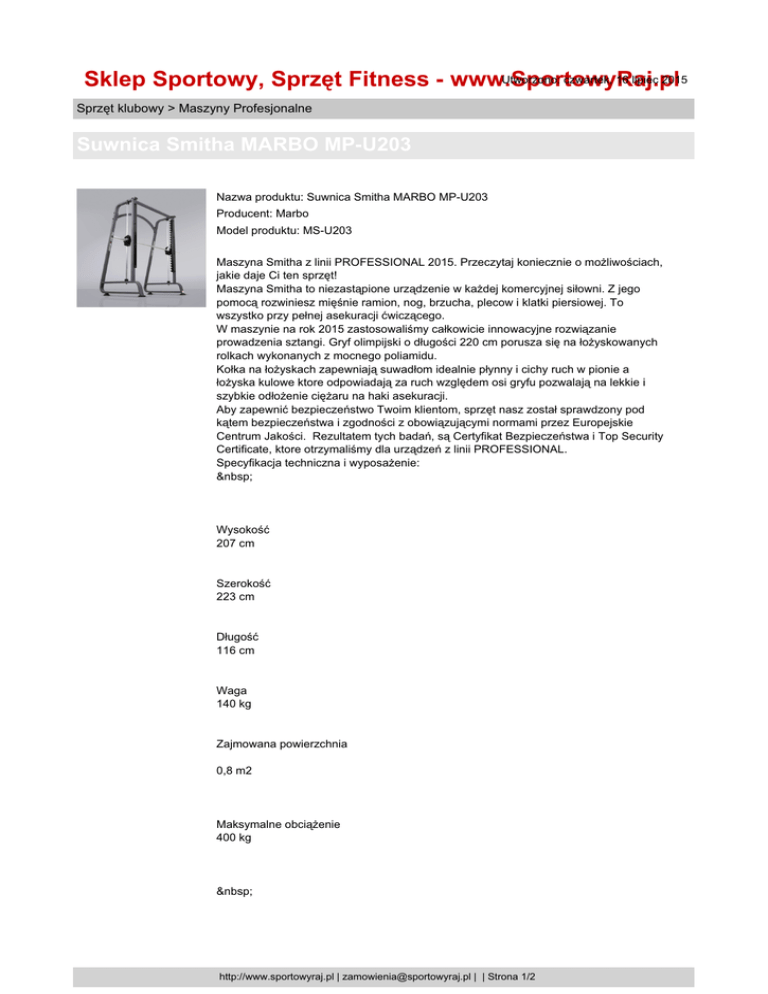 Utworzono: czwartek, 16 lipiec 2015 Sklep Sportowy, Sprzęt Fitness - www.SportowyRaj.pl Sprzęt klubowy > Maszyny Profesjonalne Suwnica Smitha MARBO MP-U203 Nazwa produktu: Suwnica Smitha MARBO MP-U203 Producent: Marbo Model produktu: MS-U203 Maszyna Smitha z linii PROFESSIONAL 2015. Przeczytaj koniecznie o możliwościach, jakie daje Ci ten sprzęt! Maszyna Smitha to niezastąpione urządzenie w każdej komercyjnej siłowni. Z jego pomocą rozwiniesz mięśnie ramion, nog, brzucha, plecow i klatki piersiowej. To wszystko przy pełnej asekuracji ćwiczącego. W maszynie na rok 2015 zastosowaliśmy całkowicie innowacyjne rozwiązanie prowadzenia sztangi. Gryf olimpijski o długości 220 cm porusza się na łożyskowanych rolkach wykonanych z mocnego poliamidu. Kołka na łożyskach zapewniają suwadłom idealnie płynny i cichy ruch w pionie a łożyska kulowe ktore odpowiadają za ruch względem osi gryfu pozwalają na lekkie i szybkie odłożenie ciężaru na haki asekuracji. Aby zapewnić bezpieczeństwo Twoim klientom, sprzęt nasz został sprawdzony pod kątem bezpieczeństwa i zgodności z obowiązującymi normami przez Europejskie Centrum Jakości. Rezultatem tych badań, są Certyfikat Bezpieczeństwa i Top Security Certificate, ktore otrzymaliśmy dla urządzeń z linii PROFESSIONAL. Specyfikacja techniczna i wyposażenie: Wysokość 207 cm Szerokość 223 cm Długość 116 cm Waga 140 kg Zajmowana powierzchnia 0,8 m2 Maksymalne obciążenie 400 kg http://www.sportowyraj.pl | [email protected] | | Strona 1/2 Utworzono: czwartek, 16 lipiec 2015 Sklep Sportowy, Sprzęt Fitness - www.SportowyRaj.pl Sprzęt klubowy > Maszyny Profesjonalne Suwnica Smitha MARBO MP-U203 Cena: 3999.00zł Dostępność: Ten produkt został dodany do sklepu w dniu środa, 25 kwiecień 2012 http://www.sportowyraj.pl | [email protected] | | Strona 2/2