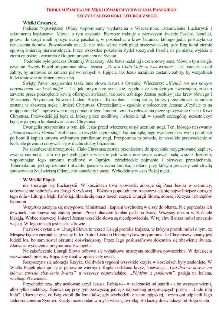 TRIDUUM PASCHALNE MĘKI I ZMARTWYCHWSTANIA PAŃSKIEGO SZCZYT CAŁEGO ROKU LITURGICZNEGO. Wielki Czwartek. Podczas Najświętszej Ofiary wspominamy wydarzenia z Wieczernika: ustanowienie Eucharystii i sakramentu kapłaństwa. Mówią o tym czytania: Pierwsze traktuje o pierwszym święcie Paschy. Izraelici, gotowi do drogi mieli spożyć ucztę paschalną w pośpiechu, a krew baranka, którego jedli, posłużyła do oznaczenia domów. Powodowała ona, że nie było wśród nich plagi niszczycielskiej, gdy Bóg karał ziemię egipską śmiercią pierworodnych. Przez wszystkie pokolenia Żydzi spożywali Paschę na pamiątkę wyjścia z ziemi egipskiej i zawarcia z Bogiem przymierza na Synaju. Podobnie było podczas Ostatniej Wieczerzy. Ale Jezus nadał tej uczcie nowy sens. Mówi o tym drugie czytanie. Święty Paweł przypomina słowa Jezusa: „To jest Ciało Moje za was wydane”. Jak baranek został zabity, by uratować od śmierci pierworodnych w Egipcie, tak Jezus nazajutrz zostanie zabity, by wszystkich ludzi uratować od śmierci wiecznej. Święty Paweł przypomina także inne słowa Jezusa z Ostatniej Wieczerzy: „Kielich ten jest nowym przymierzem we krwi mojej”. Tak jak przymierze synajskie, zgodnie ze starożytnym zwyczajem, zostało zawarte przez pokropienie krwią ofiarnych zwierząt, tak krew zabitego Jezusa posłuży jako krew Nowego i Wiecznego Przymierza. Nowym Ludem Bożym - Kościołem - staną się ci, którzy przez chrzest zanurzeni zostaną w zbawczą mękę i śmierć Chrystusa. Chrześcijanie - zgodnie z poleceniem Jezusa: „Czyńcie to na moją pamiątkę” - sprawować mają pamiątkę Jego śmierci i zmartwychwstania przez spożywanie Ciała i Krwi Chrystusa. Przewodzić jej będą ci, którzy przez modlitwę i włożenie rąk w sposób szczególny uczestniczyć będą w jedynym kapłaństwie Jezusa Chrystusa. Ewangelia przypomina o tym, jak Jezus przed wieczerzą umył uczniom nogi. Ten, którego nazywamy „Nauczycielem i Panem” zrobił coś, co zwykle czynił sługa. Na pamiątkę tego wydarzenia w wielu parafiach po homilii kapłan umywa wybranym parafianom nogi. Przypomina to prawdę, że wszelkie przewodzenie w Kościele powinno odbywać się w duchu służby bliźniemu... Na zakończenie uroczystości Ciało Chrystusa zostaje przeniesione do specjalnie przygotowanej kaplicy, zwanej ciemnicą. Tam do późnych godzin wieczornych wierni uczniowie czuwać będą wraz z Jezusem, wspominając Jego samotną modlitwę w Ogrójcu, zdradzieckie pojmanie i pierwsze przesłuchania. Tabernakulum jest opróżnione i otwarte, gaśnie wieczna lampka, a ołtarz, przy którym jeszcze przed chwilą sprawowano Najświętszą Ofiarę, stoi obnażony i pusty. Wchodzimy w czas Bożej męki... W Wielki Piątek nie sprawuje się Eucharystii. W kościołach trwa spowiedź, adoruje się Pana Jezusa w ciemnicy, odbywają się nabożeństwa Drogi Krzyżowej... Późnym popołudniem rozpoczynają się najważniejsze obrzędy tego dnia - Liturgia Męki Pańskiej. Składa się ona z trzech części: Liturgii Słowa, adoracji Krzyża i obrzędów Komunii. Wszystko zaczyna się nietypowo. Ministranci i kapłani wychodzą w ciszy do ołtarza. Nie poprzedza ich dzwonek, nie śpiewa się żadnej pieśni. Przed ołtarzem kapłan pada na twarz. Wszyscy obecni w Kościele klękają. Wobec zbawczej śmierci Jezusa wszelkie słowa są nieodpowiednie. W tej chwili cisza mówi znacznie więcej. W Jego ranach jest nasze zdrowie... Pierwsze czytanie w Liturgii Słowa to tekst z Księgi proroka Izajasza, w którym prorok mówi o tym, że Mesjasz będzie cierpiał za grzechy ludzi. Autor Listu do Hebrajczyków przypomina, że Chrystusowi znany jest ludzki los, bo sam został okrutnie doświadczony. Przez Jego posłuszeństwo dokonało się zbawienie świata. Zbawcze wydarzenia przypomina Ewangelia. Na zakończenie Liturgii Słowa odbywa się wyjątkowo uroczysta modlitwa powszechna. W dziesięciu wezwaniach prosimy Boga, aby miał w opiece cały świat. Rozpoczyna się adoracja Krzyża. Od dwóch tygodni wszystkie krzyże w kościołach były zasłonięte. W Wielki Piątek ukazuje się je ponownie wiernym. Kapłan odsłania krzyż, śpiewając: „Oto drzewo krzyża, na którym zawisło zbawienie świata”, a wszyscy odpowiadając: „Pójdźmy z pokłonem”, padają na kolana, wielbiąc Zbawiciela. Przychodzi czas, aby ucałować krzyż Jezusa. Robią to - w zależności od parafii - albo wszyscy wierni, albo tylko niektórzy. Śpiewa się przy tym zazwyczaj jedną z najbardziej przejmujących pieśni - „Ludu mój ludu”. Ukazuje ona, co Bóg zrobił dla Izraelitów, gdy wychodzili z ziemi egipskiej, i czym oni odpłacili Jego Jednorodzonemu Synowi. Każdy może dodać w myśli własną zwrotkę. Bo każdy doświadczył od Boga wielu dobrodziejstw, a często odpłaca Mu grzechem. Po adoracji Krzyża następuje Komunia święta. Nie ma przeistoczenia. Rozdaje się Ciało Chrystusa, konsekrowane poprzedniego dnia. Karmimy się pokarmem, który daje życie wieczne... Wielkopiątkową liturgię kończy przeniesienie Najświętszego Sakramentu do kaplicy, zwanej Bożym Grobem. Monstrancja jest przykryta białym welonem na pamiątkę całunu, którym spowito doczesne szczątki Jezusa. Tego wieczora i przez cały następny dzień trwa adoracja. Wielu przyjdzie także ucałować krzyż. Bo „na drzewie rajskim śmierć wzięła początek, na drzewie krzyża powstało nowe życie, a szatan, który na drzewie zwyciężył, na drzewie również został pokonany przez Jezusa Chrystusa, naszego Pana”. Wielka Sobota Wydawało się, że wszystko się skończyło. Bo zazwyczaj śmierć kończy wszystko. Ale nie w tym przypadku. Trzeciego dnia Jezus powstaje z grobu. Pokazuje, że nadzieje w Nim pokładane nie były daremne. Chrystus, zwyciężywszy śmierć, też obiecuje zmartwychwstanie wierzącym w Niego. Te prawdy przeżywamy podczas Liturgii Wielkiej Soboty. To, co w tym dniu najważniejsze, roz
