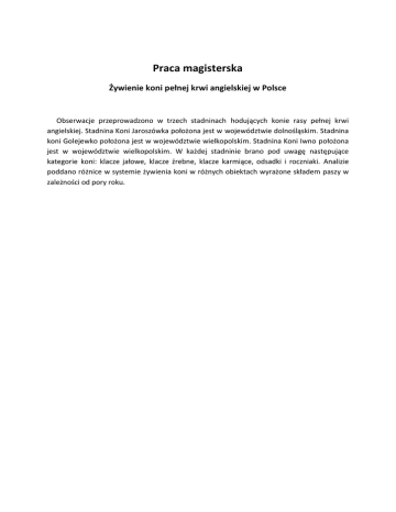 Praca magisterska Żywienie koni pełnej krwi angielskiej w Polsce Obserwacje przeprowadzono w trzech stadninach hodujących konie rasy pełnej krwi angielskiej. Stadnina Koni Jaroszówka położona jest w województwie dolnośląskim. Stadnina koni Golejewko położona jest w województwie wielkopolskim. Stadnina Koni Iwno położona jest w województwie wielkopolskim. W każdej stadninie brano pod uwagę następujące kategorie koni: klacze jałowe, klacze źrebne, klacze karmiące, odsadki i roczniaki. Analizie poddano różnice w systemie żywienia koni w różnych obiektach wyrażone składem paszy w zależności od pory roku.
