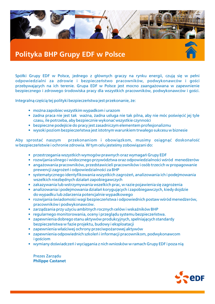 Polityka BHP Grupy EDF w Polsce Spółki Grupy EDF w Polsce, jednego z głównych graczy na rynku energii, czują się w pełni odpowiedzialni za zdrowie i bezpieczeństwo pracowników, podwykonawców i gości przebywających na ich terenie. Grupa EDF w Polsce jest mocno zaangażowana w zapewnienie bezpiecznego i zdrowego środowiska pracy dla wszystkich pracowników, podwykonawców i gości. Integralną częścią tej polityki bezpieczeństwa jest przekonanie, że: • można zapobiec wszystkim wypadkom i urazom • żadna praca nie jest tak ważna, żadna usługa nie tak pilna, aby nie móc poświęcić jej tyle czasu, ile potrzeba, aby bezpiecznie wykonać wszystkie czynności • bezpieczne podejście do pracy jest zasadniczym elementem profesjonalizmu • wysoki poziom bezpieczeństwa jest istotnym warunkiem trwałego sukcesu w biznesie Aby sprostać naszym przekonaniom i obowiązkom, musimy osiągnąć doskonałość w bezpieczeństwie i ochronie zdrowia. W tym celu jesteśmy zobowiązani do: • przestrzegania wszystkich wymogów prawnych oraz wymagań Grupy EDF • rozwijania silnego i widocznego przywództwa oraz odpowiedzialności wśród menedżerów • angażowania pracowników, przedstawicieli pracowników i osób trzecich w propagowanie prewencji zagrożeń i odpowiedzialności za BHP • systematycznego identyfikowania wszystkich zagrożeń, analizowania ich i podejmowania wszelkich niezbędnych działań zapobiegawczych • zakazywania lub wstrzymywania wszelkich prac, w razie pojawienia się zagrożenia • analizowania i podejmowania działań korygujących i zapobiegawczych, kiedy dojdzie do wypadku lub zdarzenia potencjalnie wypadkowego • rozwijania świadomości wagi bezpieczeństwa i odpowiednich postaw wśród menedżerów, pracowników i podwykonawców. • zarządzania przy użyciu ambitnych rocznych celów i wskaźników BHP • regularnego monitorowania, oceny i przeglądu systemu bezpieczeństwa. • zapewnienia dobrego stanu aktywów produkcyjnych, spełniających standardy bezpieczeństwa w fazie projektu, budowy i eksploatacji • zapewnienia właściwej ochrony przeciwpożarowej aktywów • zapewnienia odpowiednich szkoleń i informacji pracownikom, podwykonawcom i gościom • wymiany doświadczeń i wyciągania z nich wniosków w ramach Grupy EDF i poza nią Prezes Zarządu Philippe Castanet The EDF Group in Poland Health and Safety Policy EDF Group companies in Poland, as a main player in the energy sector, recognizes that the health and safety of employees, contractors and visitors present at our sites is its responsibility. We are strongly committed to ensuring a safe and healthy working environment for all employees, subcontractors and visitors. As an integral part of this policy, we believe that: • all accidents and injuries can be prevented. • no job is so important, no service so urgent that we cannot take the time to perform all work safely • a safe attitude is an essential part of professionalism • a high level of safety is an important condition for sustainable business success To meet our beliefs and responsibilities we want to achieve excellence in Health and Safety performance. For this purpose, we are obliged to: • comply with all legal and EDF Group requirements • develop strong and visible leadership and accountability for managers • involve employees, employee representatives and third parties to promote risk prevention and health and safety responsibilities • systematically identify all workplace hazards, undertake assessments and take all necessary preventative actions • prohibit or stop any work as soon as a risk is detected • analyse and take corrective and preventive actions when an accident or a near missed accident occur • develop the safety awareness and attitude of managers, staff and subcontractors • manage using challenging annual health and safety objectives and indicators. • regularly monitor, assess and review the safety system • ensure assets are in good condition and comply with safety standards during design, construction and operation phases • provide proper fire protection for our assets • provide proper training and information to employees, subcontractors and visitors • share and learn from experience within the EDF Group and beyond CEO Philippe Castanet