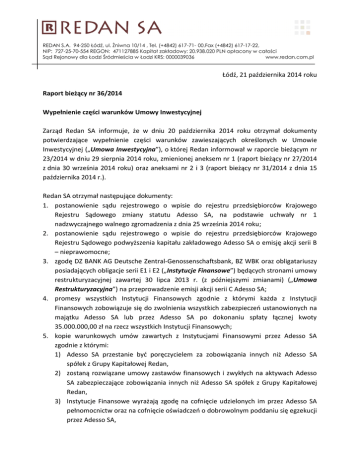 REDAN S.A. 94-250 Łódź, ul. Żniwna 10/14 , Tel. (+4842) 617-71- 00,Fax (+4842) 617-17-22, NIP: 727-25-70-554 REGON: 471127885 Kapitał zakładowy: 20.938.020 PLN opłacony w całości Sąd Rejonowy dla Łodzi Śródmieścia w Łodzi KRS: 0000039036 www.redan.com.pl Łódź, 21 października 2014 roku Raport bieżący nr 36/2014 Wypełnienie części warunków Umowy Inwestycyjnej Zarząd Redan SA informuje, że w dniu 20 października 2014 roku otrzymał dokumenty potwierdzające wypełnienie części warunków zawieszających określonych w Umowie Inwestycyjnej („Umowa Inwestycyjna”), o której Redan informował w raporcie bieżącym nr 23/2014 w dniu 29 sierpnia 2014 roku, zmienionej aneksem nr 1 (raport bieżący nr 27/2014 z dnia 30 września 2014 roku) oraz aneksami nr 2 i 3 (raport bieżący nr 31/2014 z dnia 15 października 2014 r.). Redan SA otrzymał następujące dokumenty: 1. postanowienie sądu rejestrowego o wpisie do rejestru przedsiębiorców Krajowego Rejestru Sądowego zmiany statutu Adesso SA, na podstawie uchwały nr 1 nadzwyczajnego walnego zgromadzenia z dnia 25 września 2014 roku; 2. postanowienie sądu rejestrowego o wpisie do rejestru przedsiębiorców Krajowego Rejestru Sądowego podwyższenia kapitału zakładowego Adesso SA o emisję akcji serii B – nieprawomocne; 3. zgodę DZ BANK AG Deutsche Zentral-Genossenschaftsbank, BZ WBK oraz obligatariuszy posiadających obligacje serii E1 i E2 („Instytucje Finansowe”) będących stronami umowy restrukturyzacyjnej zawartej 30 lipca 2013 r. (z późniejszymi zmianami) („Umowa Restrukturyzacyjna”) na przeprowadzenie emisji akcji serii C Adesso SA; 4. promesy wszystkich Instytucji Finansowych zgodnie z którymi każda z Instytucji Finansowych zobowiązuje się do zwolnienia wszystkich zabezpieczeń ustanowionych na majątku Adesso SA lub przez Adesso SA po dokonaniu spłaty łącznej kwoty 35.000.000,00 zł na rzecz wszystkich Instytucji Finansowych; 5. kopie warunkowych umów zawartych z Instytucjami Finansowymi przez Adesso SA zgodnie z którymi: 1) Adesso SA przestanie być poręczycielem za zobowiązania innych niż Adesso SA spółek z Grupy Kapitałowej Redan, 2) zostaną rozwiązane umowy zastawów finansowych i zwykłych na aktywach Adesso SA zabezpieczające zobowiązania innych niż Adesso SA spółek z Grupy Kapitałowej Redan, 3) Instytucje Finansowe wyrażają zgodę na cofnięcie udzielonych im przez Adesso SA pełnomocnictw oraz na cofnięcie oświadczeń o dobrowolnym poddaniu się egzekucji przez Adesso SA, REDAN S.A. 94-250 Łódź, ul. Żniwna 10/14 , Tel. (+4842) 617-71- 00,Fax (+4842) 617-17-22, NIP: 727-25-70-554 REGON: 471127885 Kapitał zakładowy: 20.938.020 PLN opłacony w całości Sąd Rejonowy dla Łodzi Śródmieścia w Łodzi KRS: 0000039036 www.redan.com.pl 4) DZ BANK AG Deutsche Zentral-Genossenschaftsbank oraz Bank Zachodni WBK SA warunkowo rozwiązują umowę dotyczącą obowiązku realizowania określonych przepływów na rachunkach bankowych spółek z Grupy Redan, w tym Adesso SA, 5) warunkowo zostaje dokonany zwrotny przelew praw z polis ubezpieczeniowych, które zostały przez Adesso SA scedowane na Instytucje Finansowe. Jedynym warunkiem wejścia w życie wymienionych w pkt. 5 umów jest dokonanie na rzecz Instytucji Finansowych łącznej spłaty w wysokości 35.000.000,00 zł. Ponadto, w związku z otrzymaniem przez Redan aneksów do umów bilateralnych z DZ BANK AG Deutsche Zentral-Genossenschaftsbank (o którym Redan SA poinformował w raporcie bieżącym nr 32/2014 z 21 października 2014 r.) oraz BZ WBK SA (o którym Redan SA poinformował w raporcie bieżącym nr 33/2014 z 21 października 2014 r.) w życie weszły postanowienia aneksu nr 2 do Umowy Restrukturyzacyjnej z dnia 29 września 2014 r. (o którym Redan SA poinformował w raporcie bieżącym nr 28/2014 z 2 października 2014 r.), zgodnie z którym w momencie dokonania spłaty w wysokości 35.000.000,00 zł na rzecz Instytucji Finansowych Umowa Restrukturyzacyjna ulegnie rozwiązaniu. Jednym z warunków zawieszających Umowy Inwestycyjnej był także obowiązek, aby Adesso SA przestało być jej stroną. Warunek ten wypełni się w momencie rozwiązania Umowy Restrukturyzacyjnej. W związku z powyższym pozostałymi do wypełnienia warunkami zawieszającymi Umowy Inwestycyjnej są: 1) uprawomocnienie się postanowienia o rejestracji podwyższenia kapitału Adesso SA o akcje serii B; 2) postanowienie o rejestracji podwyższenia kapitału Adesso SA o akcje serii C; 3) zawarcie przez Carrisonio Limited Partnership (spółkę zależną Redan SA, która będzie sprzedawała na rzecz 21 Concordia 1 S.a.r.l. akcje Adesso SA) umowy rachunku escrow służącego do rozliczenia ceny sprzedaży; 4) Adesso SA nabędzie wszystkie udziały w Adesso TXM s.r.o. oraz w Adesso Slovakia s.r.o. – spółkach prowadzących sklepy Textilmarket w Czechach i na Słowacji; 5) Adesso SA otrzyma od Redan SA bezwarunkową i nieodwołaną ofertę nabycia wszystkich udziałów w Adesso Sp. z o.o – spółce wynajmującej magazyn obsługujący sieć sklepów Textilmarket; 6) Redan SA i Adesso SA złożą zapewnienia i oświadczenia dotyczące sprzedawanych akcji i stanu Adesso SA na dzień transakcji sprzedaży; 7) Gravacinta Ltd (spółka zależna od Redan SA) oraz 21 Concorida 1 S.a.r.l. zawrą umowę zastawu na akcjach serii B Adesso SA na zabezpieczenie roszczeń 21 Concordia 1 S.a.r.l. do czasu uprawomocnienia się postanowienia o rejestracji akcji serii C Adesso SA. REDAN S.A. 94-250 Łódź, ul. Żniwna 10/14 , Tel. (+4842) 617-71- 00,Fax (+4842) 617-17-22, NIP: 727-25-70-554 REGON: 471127885 Kapitał zakładowy: 20.938.020 PLN opłacony w całości Sąd Rejonowy dla Łodzi Śródmieścia w Łodzi KRS: 0000039036 www.redan.com.pl Szczegółowo powyższe warunki są opisane w raporcie bieżącym nr 23/2014 opublikowanym w dniu 29 sierpnia 2014 roku oraz w raporcie bieżącym nr 31/2014 opublikowanym w dniu 15 październik