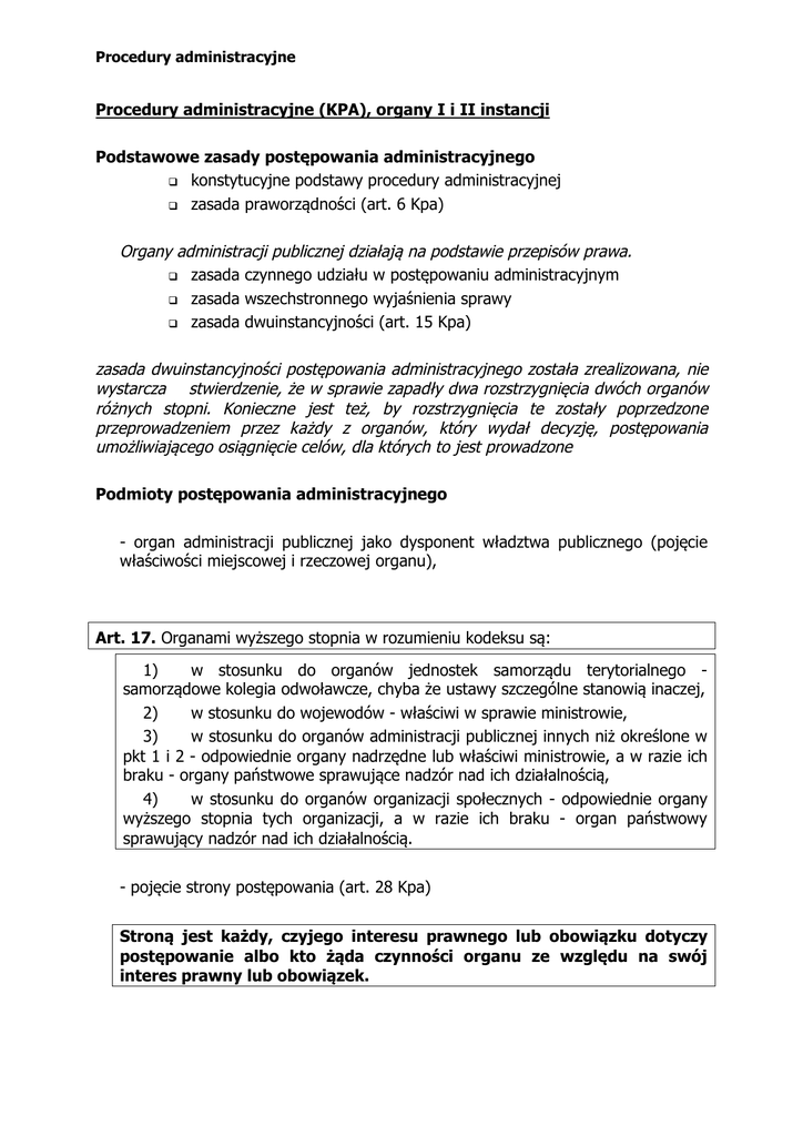Procedury administracyjne Procedury administracyjne (KPA), organy I i II instancji Podstawowe zasady postępowania administracyjnego konstytucyjne podstawy procedury administracyjnej zasada praworządności (art. 6 Kpa) Organy administracji publicznej działają na podstawie przepisów prawa. zasada czynnego udziału w postępowaniu administracyjnym zasada wszechstronnego wyjaśnienia sprawy zasada dwuinstancyjności (art. 15 Kpa) zasada dwuinstancyjności postępowania administracyjnego została zrealizowana, nie wystarcza stwierdzenie, że w sprawie zapadły dwa rozstrzygnięcia dwóch organów różnych stopni. Konieczne jest też, by rozstrzygnięcia te zostały poprzedzone przeprowadzeniem przez każdy z organów, który wydał decyzję, postępowania umożliwiającego osiągnięcie celów, dla których to jest prowadzone Podmioty postępowania administracyjnego - organ administracji publicznej jako dysponent władztwa publicznego (pojęcie właściwości miejscowej i rzeczowej organu), Art. 17. Organami wyższego stopnia w rozumieniu kodeksu są: 1) w stosunku do organów jednostek samorządu terytorialnego samorządowe kolegia odwoławcze, chyba że ustawy szczególne stanowią inaczej, 2) w stosunku do wojewodów - właściwi w sprawie ministrowie, 3) w stosunku do organów administracji publicznej innych niż określone w pkt 1 i 2 - odpowiednie organy nadrzędne lub właściwi ministrowie, a w razie ich braku - organy państwowe sprawujące nadzór nad ich działalnością, 4) w stosunku do organów organizacji społecznych - odpowiednie organy wyższego stopnia tych organizacji, a w razie ich braku - organ państwowy sprawujący nadzór nad ich działalnością. - pojęcie strony postępowania (art. 28 Kpa) Stroną jest każdy, czyjego interesu prawnego lub obowiązku dotyczy postępowanie albo kto żąda czynności organu ze względu na swój interes prawny lub obowiązek. Procedury administracyjne - organizacja społeczna jako uczestnik postępowania - prokurator, Rzecznik Praw Obywatelskich (art. 183-189 Kpa) Terminy załatwiania spraw administracyjnych pojęcie bezczynności organu zażalenie na bezczynność skarga na bezczynność do sądu administracyjnego - Postępowanie przed organem I instancji wszczęcie postępowania (wszczęcie z urzędu, wszczęcie na wniosek) przekazanie podania zgodnie z właściwością postępowanie wyjaśniające zawieszenie postępowania (art. 97 -101 Kpa) postanowienia wydawane w trakcie postępowania Decyzja administracyjna - pojęcie decyzji „decyzja administracyjna jest to oświadczenie woli kompetentnego organu administrującego, podjęte w wyniku zastosowania norm materialnego prawa administracyjnego lub w określonym zakresie normy prawa procesowego do ustalonego stanu faktycznego, w trybie, formie, strukturze uregulowanej prawem procesowym, zakomunikowanym stronie, w celu wywołania skutku prawnego w sferze stosunku materialnoprawnego (decyzja rozstrzygająca sprawę co do jej istoty w całości lub w części) bądź w sferze stosunku procesowego (decyzja w inny sposób kończąca sprawę w danej instancji” (B. Adamiak) - rodzaje decyzji (konstytutywna, deklaratoryjna), kompetencja do wydania decyzji, elementy decyzji, uzupełnianie decyzji, zmiana decyzji Procedury administracyjne Postępowanie odwoławcze - dopuszczalność wniesienia odwołania wniosek o ponowne rozpatrzenie sprawy termin wniesienia odwołania wykonanie decyzji o wniesienie odwołania tryb i termin wniesienia odwołania postępowanie przed organem II instancji rodzaje rozstrzygnięć odwoławczych (art. 138 Kpa) zakaz orzekania na niekorzyść strony Postępowanie zażaleniowe - kiedy można wnieść zażalenie - termin i tryb wniesienia zażalenia Wznowienie postępowania (art. 145-152 Kpa) - przesłanki wznowienia postępowania, - organ właściwy do wznowienia postępowania - decyzja o odmowie wznowienia - postanowienie o wznowieniu Stwierdzenie nieważności decyzji (art. 156-159 Kpa) - przesłanki nieważności - organ właściwy do stwierdzenia nieważności - rodzaje decyzji wydawanych w tym postępowaniu - skutki stwierdzenia nieważności Wydawanie zaświadczeń administracyjnych Postępowanie skargowo-wnioskowe Procedury administracyjne Postępowanie sądowo-administracyjne Struktura sądownictwa administracyjnego wojewódzkie sądy administracyjne, Naczelny Sąd Administracyjny Art. 3 Prawa o ustroju sądów administracyjnych § 1. Sprawy należące do właściwości sądów administracyjnych rozpoznają, w pierwszej instancji, wojewódzkie sądy administracyjne. § 2. Naczelny Sąd Administracyjny sprawuje nadzór nad działalnością wojewódzkich sądów administracyjnych w zakresie orzekania w trybie określonym ustawami, a w szczególności rozpoznaje środki odwoławcze od orzeczeń tych sądów i podejmuje uchwały wyjaśniające zagadnienia prawne oraz rozpoznaje inne sprawy należące do właściwości Naczelnego Sądu Administracyjnego na mocy innych ustaw. Dopuszczalność skargi do sądu administracyjnego - w jakich sytuacjach skarga przysługuje, konieczne elementy skargi (art. 3 i art. 4 Prawa o postępowaniu przed sądami administracyjnymi) Sąd orzeka w sprawach skarg na: 1) decyzje administracyjne; 2) postanowienia wydane w postępowaniu administracyjnym, na które przysługuje zażalenie albo kończące postępowanie lub też rozstrzygające sprawę co do istoty; 3) postanowienia wydane w postępowaniu egzekucyjnym i zabezpieczającym, na które przysługuje zażalenie; 4) inne niż decyzja czy postanowienie akty lub czynności z zakresu administracji publicznej dotyczące uprawnień lub obowiązków wynikających z przepisów prawa; 5) akty nienormatywne organów jednostek samorządu terytorialnego i ich związków, podejmowane w sprawach z zakresu administracji publicznej; 6) akty prawa miejscowego, wydawane przez terenowe organy administracji rządowej lub organy jednostek samorządu terytorialnego; 7) akty nadzoru nad działa