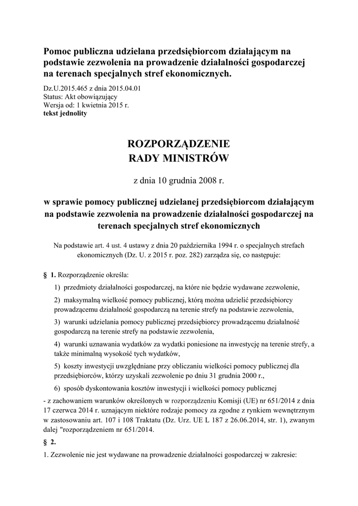 Pomoc publiczna udzielana przedsiębiorcom działającym na podstawie zezwolenia na prowadzenie działalności gospodarczej na terenach specjalnych stref ekonomicznych. Dz.U.2015.465 z dnia 2015.04.01 Status: Akt obowiązujący Wersja od: 1 kwietnia 2015 r. tekst jednolity ROZPORZĄDZENIE RADY MINISTRÓW z dnia 10 grudnia 2008 r. w sprawie pomocy publicznej udzielanej przedsiębiorcom działającym na podstawie zezwolenia na prowadzenie działalności gospodarczej na terenach specjalnych stref ekonomicznych Na podstawie art. 4 ust. 4 ustawy z dnia 20 października 1994 r. o specjalnych strefach ekonomicznych (Dz. U. z 2015 r. poz. 282) zarządza się, co następuje: § 1. Rozporządzenie określa: 1) przedmioty działalności gospodarczej, na które nie będzie wydawane zezwolenie, 2) maksymalną wielkość pomocy publicznej, którą można udzielić przedsiębiorcy prowadzącemu działalność gospodarczą na terenie strefy na podstawie zezwolenia, 3) warunki udzielania pomocy publicznej przedsiębiorcy prowadzącemu działalność gospodarczą na terenie strefy na podstawie zezwolenia, 4) warunki uznawania wydatków za wydatki poniesione na inwestycję na terenie strefy, a także minimalną wysokość tych wydatków, 5) koszty inwestycji uwzględniane przy obliczaniu wielkości pomocy publicznej dla przedsiębiorców, którzy uzyskali zezwolenie po dniu 31 grudnia 2000 r., 6) sposób dyskontowania kosztów inwestycji i wielkości pomocy publicznej - z zachowaniem warunków określonych w rozporządzeniu Komisji (UE) nr 651/2014 z dnia 17 czerwca 2014 r. uznającym niektóre rodzaje pomocy za zgodne z rynkiem wewnętrznym w zastosowaniu art. 107 i 108 Traktatu (Dz. Urz. UE L 187 z 26.06.2014, str. 1), zwanym dalej "rozporządzeniem nr 651/2014. § 2. 1. Zezwolenie nie jest wydawane na prowadzenie działalności gospodarczej w zakresie: 1) wytwarzania materiałów wybuchowych, wyrobów tytoniowych, przetwarzania paliw silnikowych, a także wyrobu, rozlewu i przetwarzania napojów alkoholowych oraz spirytusu przeznaczonego na cele inne niż produkcja biokomponentów; 2) prowadzenia ośrodków gier, o których mowa w ustawie z dnia 19 listopada 2009 r. o grach hazardowych (Dz. U. Nr 201, poz. 1540, z późn. zm.); 3) usług instalowania, napraw, konserwacji i remontu maszyn i urządzeń wykorzystywanych do prowadzenia działalności gospodarczej na terenie strefy; 4) usług związanych z odprowadzaniem i oczyszczaniem ścieków; osadów ze ścieków kanalizacyjnych, określonych w sekcji E w dziale 37 Polskiej Klasyfikacji Wyrobów i Usług ustanowionej rozporządzeniem Rady Ministrów z dnia 29 października 2008 r. w sprawie Polskiej Klasyfikacji Wyrobów i Usług (PKWiU) (Dz. U. Nr 207, poz. 1293, z późn. zm.), zwanej dalej "PKWiU"; 5) usług związanych ze zbieraniem, przetwarzaniem i unieszkodliwianiem odpadów; odzysku surowców wtórnych, określonych w sekcji E w dziale 38 PKWiU, z wyjątkiem: a) odpadów innych niż niebezpieczne nadających się do recyklingu określonych w kategorii 38.11.5, b) odpadów niebezpiecznych określonych w pozycjach: 38.12.22.0, 38.12.24.0, 38.12.25.0 oraz w podkategorii 38.12.27, c) odpadów rozpuszczalników organicznych określonych w kategorii 38.21.3, d) usług w zakresie odzysku surowców; surowców wtórnych określonych w grupie 38.3; 6) usług związanych z rekultywacją i pozostałych usług związanych z gospodarką odpadami, określonych w sekcji E w dziale 39 PKWiU; 7) obiektów budowlanych i robót budowlanych, określonych w sekcji F PKWiU; 8) handlu hurtowego i detalicznego, naprawy pojazdów samochodowych, włączając motocykle, oraz usług związanych z zakwaterowaniem i usług gastronomicznych, określonych w sekcjach G i I PKWiU; 9) usług holowania w transporcie drogowym, określonych w sekcji H w podkategorii 52.21.25 PKWiU; 10) usług licencyjnych w zakresie informacji i komunikacji, określonych w sekcji J PKWiU, związanych z: a) nabywaniem praw do książek, broszur, ulotek, map określonych w kategorii 58.11.6, b) nabywaniem praw do korzystania z wykazów i list, w szczególności adresowych, telefonicznych określonych w kategorii 58.12.3, c) nabywaniem praw do czasopism i pozostałych periodyków określonych w kategorii 58.14.4, d) nabywaniem praw do pozostałych wyrobów drukowanych określonych w kategorii 58.19.3, e) nabywaniem praw do korzystania z gier komputerowych określonych w kategorii 58.21.4, f) nabywaniem praw do korzystania z programów komputerowych określonych w kategorii 58.29.5; 11) usług w zakresie informacji i komunikacji, określonych w sekcji J PKWiU, związanych z: a) produkcją filmów, nagrań wideo, programów telewizyjnych, nagrań dźwiękowych i muzycznych, określonych w dziale 59, z wyjątkiem usług związanych z wydawaniem nagrań dźwiękowych i muzycznych określonych w kategorii 59.20.3, b) nadawaniem programów ogólnodostępnych i abonamentowych określonych w dziale 60, c) pozostałych usług w zakresie informacji określonych w grupie 63.9; 12) usług finansowych i ubezpieczeniowych oraz usług związanych z obsługą rynku nieruchomości, określonych w sekcjach K i L PKWiU; 13) usług profesjonalnych, naukowych i technicznych, określonych w sekcji M PKWiU, z wyjątkiem: a) usług w zakresie audytu finansowego określonych w kategorii 69.20.1, b) usług rachunkowo-księgowych określonych w kategorii 69.20.2, c) usług w zakresie badań i analiz technicznych określonych w grupie 71.2, d) usług w zakresie badań naukowych i prac rozwojowych określonych w dziale 72; 14) usług administrowania i usług wspierających, określonych w sekcji N PKWiU, z wyjątkiem usług centrów telefonicznych (call center) określonych w grupie 82.2; 15) usług administracji publicznej i obrony narodowej; usług w zakresie obowiązkowych zabezpieczeń społecznych, oraz edukacji, usług w zakresie opieki zdrowotnej i pomocy społecznej, usług kulturalnych, rozrywkowych, sportowych i rekreacyj