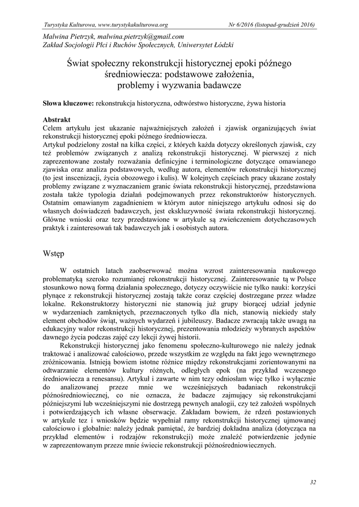 Turystyka Kulturowa, www.turystykakulturowa.org Nr 6/2016 (listopad-grudzień 2016) Malwina Pietrzyk, [email protected] Zakład Socjologii Płci i Ruchów Społecznych, Uniwersytet Łódzki Świat społeczny rekonstrukcji historycznej epoki późnego średniowiecza: podstawowe założenia, problemy i wyzwania badawcze Słowa kluczowe: rekonstrukcja historyczna, odtwórstwo historyczne, żywa historia Abstrakt Celem artykułu jest ukazanie najważniejszych założeń i zjawisk organizujących świat rekonstrukcji historycznej epoki późnego średniowiecza. Artykuł podzielony został na kilka części, z których każda dotyczy określonych zjawisk, czy też problemów związanych z analizą rekonstrukcji historycznej. W pierwszej z nich zaprezentowane zostały rozważania definicyjne i terminologiczne dotyczące omawianego zjawiska oraz analiza podstawowych, według autora, elementów rekonstrukcji historycznej (to jest inscenizacji, życia obozowego i kulis). W kolejnych częściach pracy ukazane zostały problemy związane z wyznaczaniem granic świata rekonstrukcji historycznej, przedstawiona została także typologia działań podejmowanych przez rekonstruktorów historycznych. Ostatnim omawianym zagadnieniem w którym autor niniejszego artykułu odnosi się do własnych doświadczeń badawczych, jest ekskluzywność świata rekonstrukcji historycznej. Główne wnioski oraz tezy przedstawione w artykule są zwieńczeniem dotychczasowych praktyk i zainteresowań tak badawczych jak i osobistych autora. Wstęp W ostatnich latach zaobserwować można wzrost zainteresowania naukowego problematyką szeroko rozumianej rekonstrukcji historycznej. Zainteresowanie tą w Polsce stosunkowo nową formą działania społecznego, dotyczy oczywiście nie tylko nauki: korzyści płynące z rekonstrukcji historycznej zostają także coraz częściej dostrzegane przez władze lokalne. Rekonstruktorzy historyczni nie stanowią już grupy biorącej udział jedynie w wydarzeniach zamkniętych, przeznaczonych tylko dla nich, stanowią niekiedy stały element obchodów świąt, ważnych wydarzeń i jubileuszy. Badacze zwracają także uwagą na edukacyjny walor rekonstrukcji historycznej, prezentowania młodzieży wybranych aspektów dawnego życia podczas zajęć czy lekcji żywej historii. Rekonstrukcji historycznej jako fenomenu społeczno-kulturowego nie należy jednak traktować i analizować całościowo, przede wszystkim ze względu na fakt jego wewnętrznego zróżnicowania. Istnieją bowiem istotne różnice między rekonstrukcjami zorientowanymi na odtwarzanie elementów kultury różnych, odległych epok (na przykład wczesnego średniowiecza a renesansu). Artykuł i zawarte w nim tezy odniosłam więc tylko i wyłącznie do analizowanej przeze mnie we wcześniejszych badaniach rekonstrukcji późnośredniowiecznej, co nie oznacza, że badacze zajmujący się rekonstrukcjami późniejszymi lub wcześniejszymi nie dostrzegą pewnych analogii, czy też założeń wspólnych i potwierdzających ich własne obserwacje. Zakładam bowiem, że rdzeń postawionych w artykule tez i wniosków będzie wypełniał ramy rekonstrukcji historycznej ujmowanej całościowo i globalnie: należy jednak pamiętać, że bardziej dokładna analiza (dotycząca na przykład elementów i rodzajów rekonstrukcji) może znaleźć potwierdzenie jedynie w zaprezentowanym przeze mnie świecie rekonstrukcji późnośredniowiecznych. 32 Nr 6/2016 (listopad-grudzień 2016) Turystyka Kulturowa, www.turystykakulturowa.org Z uwagi na złożoność zjawiska rekonstrukcji historycznej, określone tezy i założenia zostały ujęte w formę problemów: każdy rozdział ukazuje bowiem możliwości odmiennego rozumienia i interpretowania określonych aspektów tego zjawiska, wskazuje także na trudności jakie może napotkać badacz zajmujący się tą problematyką. Przede wszystkim jednak omawiane przeze mnie problemy ukazują złożoność i wieloaspektowość prezentowanego świata rekonstrukcji historycznej. Zdecydowałam się na odniesienie swojej analizy do koncepcji społecznych światów, reprezentowanej przede wszystkim przez Anselma Straussa1, Adele Clark2 oraz Alfreda Schütza3, takie rozumienie rekonstrukcji historycznej pozwala bowiem najpełniej ująć jej płynność i zróżnicowanie. Wnioski zawarte w niniejszej pracy stanowią zwieńczenie mojej dotychczasowej pracy badawczej, a także doświadczeń zdobytych podczas pięcioletniego uczestnictwa w grupie rekonstruującej epokę późnego średniowiecza. Rekonstrukcja historyczna - rozważania definicyjne Rozważania nad problemami definicyjnymi powinniśmy rozpocząć od rozstrzygnięcia, czy rekonstrukcję historyczną potraktujemy jako pewną formę pokazu, inscenizacji, czy też, w rozumieniu szerszym, ogół działań zogniskowanych na odtwarzaniu określonych wytworów kultury materialnej i niematerialnej dawnych epok. Problem ten przedstawiony będzie dokładniej w dalszej części artykułu: w tym miejscu należy jednak wyraźnie zaznaczyć, że większość definicji (w tym także ta zaproponowana poniżej przez Michała Bogackiego) ujmuje rekonstrukcję jedynie jako formę pewnej prezentacji. W definicjach takich pomija się więc całe spektrum przygotowań do rekonstrukcji (szycia historycznych strojów, wykonywania przedmiotów, treningów technik walki itp.) a więc wszystkich tych działań, których efektem finalnym jest „wizualna prezentacja różnych dziedzin życia człowieka” [Bogacki 2010, s. 16]. Na tendencje do tworzenia ogólnych definicji zwraca uwagę przede wszystkim Szymon Markowski w swoim artykule Rekonstrukcje historyczne w wychowaniu młodzieży: autor zaznacza, że [definicja ogólna rekonstrukcji historycznej] „dotyczy jedynie działań zmierzających do przedstawienia wydarzeń, zjawisk, mających miejsce w historii lub prezentacji przedmiotów, strojów, architektury i sposobu życia” [Markowski 2009, s. 70]. Proponuję, aby