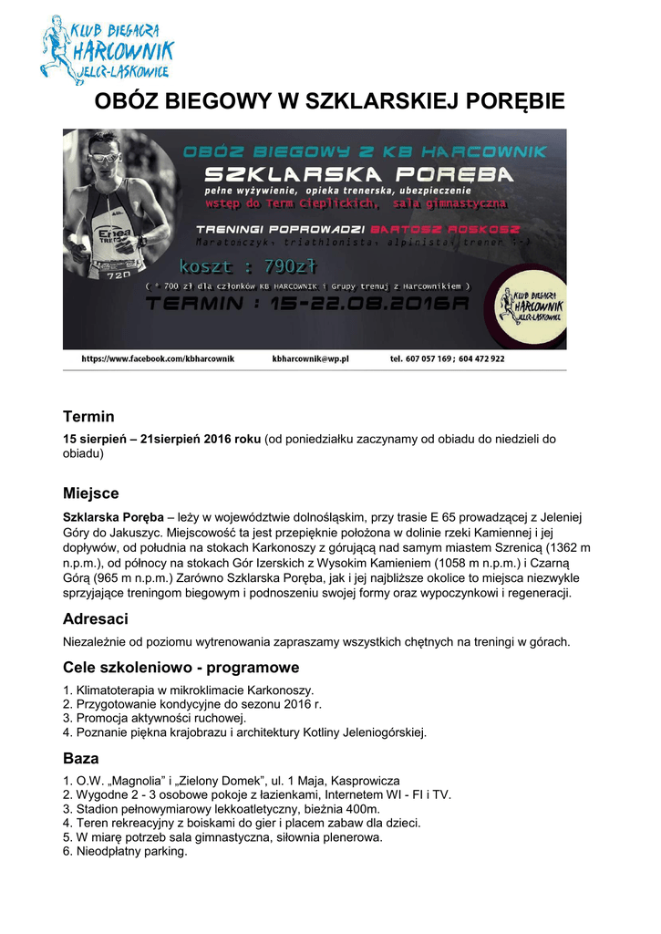 OBÓZ BIEGOWY W SZKLARSKIEJ PORĘBIE Termin 15 sierpień – 21sierpień 2016 roku (od poniedziałku zaczynamy od obiadu do niedzieli do obiadu) Miejsce Szklarska Poręba – leży w województwie dolnośląskim, przy trasie E 65 prowadzącej z Jeleniej Góry do Jakuszyc. Miejscowość ta jest przepięknie położona w dolinie rzeki Kamiennej i jej dopływów, od południa na stokach Karkonoszy z górującą nad samym miastem Szrenicą (1362 m n.p.m.), od północy na stokach Gór Izerskich z Wysokim Kamieniem (1058 m n.p.m.) i Czarną Górą (965 m n.p.m.) Zarówno Szklarska Poręba, jak i jej najbliższe okolice to miejsca niezwykle sprzyjające treningom biegowym i podnoszeniu swojej formy oraz wypoczynkowi i regeneracji. Adresaci Niezależnie od poziomu wytrenowania zapraszamy wszystkich chętnych na treningi w górach. Cele szkoleniowo - programowe 1. Klimatoterapia w mikroklimacie Karkonoszy. 2. Przygotowanie kondycyjne do sezonu 2016 r. 3. Promocja aktywności ruchowej. 4. Poznanie piękna krajobrazu i architektury Kotliny Jeleniogórskiej. Baza 1. O.W. „Magnolia” i „Zielony Domek”, ul. 1 Maja, Kasprowicza 2. Wygodne 2 - 3 osobowe pokoje z łazienkami, Internetem WI - FI i TV. 3. Stadion pełnowymiarowy lekkoatletyczny, bieżnia 400m. 4. Teren rekreacyjny z boiskami do gier i placem zabaw dla dzieci. 5. W miarę potrzeb sala gimnastyczna, siłownia plenerowa. 6. Nieodpłatny parking. Opieka trenerska Bartosz Roskosz –trener II klasy Lekkoatletyki, absolwent Szkoły Mistrzostwa Sportowego w lekkoatletyce i AWF we Wrocławiu, członek kadry wojewódzkiej z 10 letnim stażem treningowym. Trener programu „Trenuj z Harcownikiem” oraz „Lekkoatletyka dla każdego”. Formy zajęć Poranny rozruch + 2 treningi dziennie (rano i popołudniu). Trening regeneracyjny – pobyty w saunie oraz wyjazd do Aquaparku w Cieplicach. Wycieczka biegowa na Szrenicę, Śnieżne Kotły, treningi biegowe na zakręcie śmierci, stadionie, trasie pod Reglami. Treningi na siłowni. Wieczorny pokaz filmów o tematyce sportowej, wspólna integracja. Indywidualne konsultacje trenerskie. Środek transportu Dojazd uczestników we własnym zakresie(możliwość wspólnego dojazdu po wcześniejszej konsultacji). Koszt udziału Przy zgłoszeniu do 31 lipca 2016r koszt obozu 790zł / 700 zł dla członków KB Harcownik. Zgłoszenie do 10 sierpnia 2016r koszt 849zł. Cena obejmuje: nocleg + pełne wyżywienie(śniadanie, obiad, kolacja) ubezpieczenie NNW, pełną opiekę trenerską bilet wstępu do Aquaparku Koszt pobytu dla osób towarzyszących 580zł (nocleg + wyżywienie) przy zgłoszeniu do 10 sierpnia. Formy płatności (do wyboru) 1. Gotówką u Organizatora na dowód wpłaty. 2. Przelewem na rachunek rozliczeniowy: Klub Biegacza HARCOWNIK Jelcz-Laskowice 55-220 Jelcz-Laskowice, ul. Hirszfelda 3e/9 NIP: 9121873163 Bank Spółdzielczy: 73958500070020020057870001 3. W przypadku rezygnacji z udziału w akcji przed rozpoczęciem turnusu, rezygnujący poniesie koszty organizacyjne w wysokości 25 % kwoty naliczonej do zapłaty. Za niewykorzystane dni nie przysługuje zwrot poniesionych kosztów. 4. W przypadku zjazdu z obozu w trakcie trwania turnusu, zjeżdżającemu nie przysługuje zwrot poniesionych kosztów (wyjątki to leczenie szpitalne albo nagłe losowe przypadki rodzinne). Informacje dodatkowe MAKSYMALNA LICZBA UCZESTNIKÓW TRENUJĄCYCH NA OBOZIE OGRANICZONA DO 15 OSÓB, DECYDUJE KOLEJNOŚĆ ZGŁOSZEŃ I WPŁATY. MINIMALNA LICZBA OSÓB ABY OBÓZ SIĘ ODBYŁ TO 8 OSÓB. MOŻLIWOŚĆ PRZYJAZDU NA WYBRANE DNI PO WCZEŚNIEJSZEJ KONSULTACJI Z ORGANIZATOREM. Wszelkie dodatkowe pytania proszę kierować bezpośrednio do organizatora. Szczegółów na temat obozu udzieli Wam: Arek Tołłoczko - 607057169 Jacek Załubski - 604472922 Zgłoszenia, podając imię i nazwisko, prosimy przesyłać na adres: [email protected]