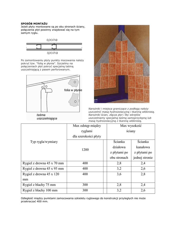 SPOSÓB MONTAŻU Jeżeli płyty montowane są po obu stronach ściany, połączenia płyt powinny znajdować się na tym samym ryglu. Po zamontowaniu płyty punkty mocowania należy pokryć tzw. "folią w płynie". Szczeliny na połączeniach płyt pokryć specjalną taśmą uszczelniającą z pasem perforowanym. Narożniki i miejsca graniczące z podłogą należy uszczelnić masą hydroizolacyjną i tkaniną włóknistą. Narożniki ścian, złącza płyt i łby wkrętów uszczelniamy specjalną taśmą samoprzylepną lub masą hydroizolacyjną z tkaniną włóknistą. Max odstęp między ryglami dla szerokości płyty Max wysokość ściany 1200 Ścianka działowa z płytami po obu stronach Ścianka kanałowa z płytami po jednej stronie Rygiel z drewna 45 x 70 mm 400 2,8 2,4 Rygiel z drewna 45 x 95 mm 400 3,2 2,6 Rygiel z drewna 45 x 120 mm 400 3,6 2,8 Rygiel z blachy 75 mm 300 2,8 2,4 Rygiel z blachy 100 mm 300 3,2 2,6 Typ rygla/wymiary Odległość między punktami zamocowania szkieletu ryglowego do konstrukcji przyległych nie może przekraczać 400 mm. NA RYGLACH DREWNIANYCH Płyty powinny być sztywno podparte, dlatego rygle powinny mieć minimalne wymiary 45 x 75 mm. Odstęp między ryglami powinien wynosić maksymalnie 400 mm dla płyt o szerokości 1200 i 450 mm dla płyt o szerokości 900 mm. NA RYGLACH Z BLACHY Minimalny rozmiar rygli to 75 x 51 mm, a maksymalny odstęp między ryglami powinien wynosić 300 mm niezależnie od szerokości płyty. NWIERCANIE OTWORÓW I WKRĘTY Płyty należy mocować wkrętami 4,2 x 35 mm. Wkręty należy dokręcać do poziomu powierzchni płyty. Przycinane kawałki płyt nawierca się na miejscu montażu wiertłem o średnicy 4 mm wzdłuż krawędzi płyty w odległości min 12 mm od jej brzegu. Mocowanie płyty należy rozpocząć od dołu, od środka jej szerokości. ZAWIESZENIA Dzięki wysokiej wytrzymałości płyty Minerit SP, można na niej łatwo i pewnie mocować oraz zawieszać różne przedmioty. Cięższe wyposażenie np. umywalki, wymagają dodatkowego wzmocnienia zamocowanego w odpowiednich miejscach szkieletu ściany. Obok zamieszczamy przykłady różnego rodzaju zawieszek wg obciążeń dopuszczalnych na ścianie. Podane wartości przedstawiają średnie wyniki prób; współczynnik pewności pomiarów wynosi - 2. Wskazane wartości dotyczą płyt przed położeniem płytek ceramicznych. Najważniejsze wymiary przy mocowaniu płyt na szkielecie z rygli drewnianych lub blachy. Wkręt dokręcić do poziomu powierzchni płyty. Spoiny między kafelkami umieścić w jednej linii z brzegami otworu w ścianie. Wokół drzwi i okien nie należy stosować wcięć. Montować oddzielnie przycięte płyty. KONTROLA Przed ułożeniem glazury należy sprawdzić warstwę uszczelniającą płyty i uszczelnić ewentualne uszkodzenia specjalną taśmą uszczelniającą lub preparatem uszczelniającym tzw. folią w płynie. Ewentualnie można całą powierzchnię pokryć dodatkową warstwą uszczelniającą (rozcieńczone tworzywo lub mocująca masa hydroizolacyjna). MONTAŻ KAFELKÓW USZCZELNIANIE OTWORÓW Małe otwory i otwory przelotowe należy uszczelnić starannie, zgodnie z instrukcją producenta masy uszczelniającej. Otwory przelotowe na rury itp. należy uszczelniać masą uszczelniającą pod króćcem lub podkładką uszczelniającą. 1. 2. 3. 4. 5. Płyta do pomieszczeń wilgotnych. Spoina między kafelkami. Taśma uszczelniająca. Przyklejać do czystej, odkurzonej powierzchni. Klej do glazury, trwale elastyczny. Glazura. Przejścia instalacji wypełniamy dokładnie masą hydroizolacyjną lub wykonujemy specjalne węzły przejściowe. ŚCIANY ZEWNĘTRZNE Szczelne płyty w połączeniu z taśmą uszczelniającą zastępują warstwę paroszczelną w ścianie zewnętrznej. Złącze na styk, hydroizolacyjna taśma, zaprawa klejąca, płytki ceramiczne.