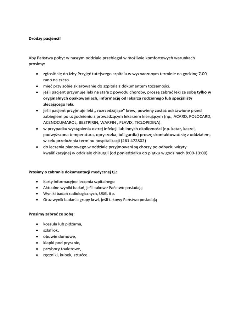 Drodzy pacjenci! Aby Państwa pobyt w naszym oddziale przebiegał w możliwie komfortowych warunkach prosimy: zgłosić się do Izby Przyjęć tutejszego szpitala w wyznaczonym terminie na godzinę 7.00 rano na czczo. mieć przy sobie skierowanie do szpitala z dokumentem tożsamości. jeśli pacjent przyjmuje leki na stałe z powodu choroby, proszę zabrać leki ze sobą tylko w oryginalnych opakowaniach, informację od lekarza rodzinnego lub specjalisty zlecającego leki. jeśli pacjent przyjmuje leki „ rozrzedzające” krew, powinny zostać odstawione przed zabiegiem po uzgodnieniu z prowadzącym lekarzem kierującym (np., ACARD, POLOCARD, ACENOCUMAROL, BESTPIRIN, WARFIN , PLAVIX, TICLOPIDINA). w przypadku wystąpienia ostrej infekcji lub innych okoliczności (np. katar, kaszel, podwyższona temperatura, opryszczka, ból gardła) proszę skontaktować się z oddziałem, w celu przełożenia terminu hospitalizacji (261 472802) do leczenia planowego w oddziale przyjmowani są chorzy po odbyciu wizyty kwalifikacyjnej w oddziale chirurgii (od poniedziałku do piątku w godzinach 8:00-13:00) Prosimy o zabranie dokumentacji medycznej tj.: Karty informacyjne leczenia szpitalnego Aktualne wyniki badań, jeśli takowe Państwo posiadają Wyniki badań radiologicznych, USG, itp. Oraz wynik badania grupy krwi, jeśli takowy Państwo posiadają Prosimy zabrać ze sobą: koszula lub pidżama, szlafrok, obuwie domowe, klapki pod prysznic, przybory toaletowe, ręczniki, kubek, sztućce.