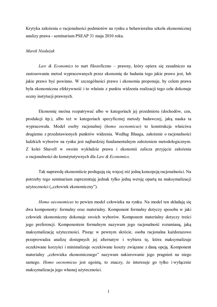 Krytyka założenia o racjonalności podmiotów na rynku a behawioralna szkoła ekonomicznej analizy prawa - seminarium PSEAP 31 maja 2010 roku. Marek Niedużak Law & Economics to nurt filozoficzno – prawny, który opiera się zasadniczo na zastosowaniu metod wypracowanych przez ekonomię do badania tego jakie prawo jest, lub jakie prawo być powinno. W szczególności prawo i ekonomia proponuje, by celem prawa była ekonomiczna efektywność i to właśnie z punktu widzenia realizacji tego celu dokonuje oceny instytucji prawnych. Ekonomię można rozpatrywać albo w kategoriach jej przedmiotu (dochodów, cen, produkcji itp.), albo też w kategoriach specyficznej metody badawczej, jaką nauka ta wypracowała. Model osoby racjonalnej (homo oecnomicus) to konstrukcja właściwa drugiemu z przedstawionych punktów widzenia. Według Blauga, założenie o racjonalności ludzkich wyborów na rynku jest najbardziej fundamentalnym założeniem metodologicznym. Z kolei Shavell w swoim wykładzie prawa i ekonomii zalicza przyjęcie założenia o racjonalności do konstytutywnych dla Law & Economics. Tak naprawdę ekonomiście posługują się więcej niż jedną koncepcją racjonalności. Na potrzeby tego seminarium zaprezentuję jednak tylko jedną wersję opartą na maksymalizacji użyteczności („człowiek ekonomiczny”). Homo oeconomicus to pewien model człowieka na rynku. Na model ten składają się dwa komponenty: formalny oraz materialny. Komponent formalny dotyczy sposobu w jaki człowiek ekonomiczny dokonuje swoich wyborów. Komponent materialny dotyczy treści jego preferencji. Komponentem formalnym nazywam jego racjonalność rozumianą, jaką maksymalizację użyteczności. Pisząc w pewnym skrócie, osoba racjonalna każdorazowo przeprowadza analizę dostępnych jej alternatyw i wybiera tę, która maksymalizuje oczekiwane korzyści i minimalizuje oczekiwane koszty związane z daną opcją. Komponent materialny „człowieka ekonomicznego” nazywam nakierowanie jego pragnień na niego samego. Homo oecnomicus jest egoistą, to znaczy, że interesuje go tylko i wyłącznie maksymalizacja jego własnej użyteczności. 1 Ekonomia posługuje się przy tym miarą tych „korzyści” i „strat”, którą jest „użyteczność”. Pojęcie to obejmuje subiektywne odczucie satysfakcji i zadowolenia z czynności lub przedmiotów, które niekoniecznie mają charakter majątkowy. W istocie jest to sposób opisania preferencji, które mają charakter uporządkowany, zupełny, spójny i przechodni. Z założeniem o racjonalności wiąże się jedno z podstawowych twierdzeń przyjmowanych przez zwolenników prawa i ekonomii – twierdzeniem Coase’a. Zgodnie z jego treścią, jeżeli koszty transakcyjne są równe zeru, wówczas efektywna alokacja danego uprawnienia nastąpi niezależnie od tego, komu uprawnienie to zostało początkowo przyznane przepisem prawa lub orzeczeniem sądu. Oznacza to, że gdy koszty transakcyjne (rozumiane przez Coase’a szeroko, jako przeszkody na drodze do zawarcia porozumienia) są minimalne, to działający racjonalnie ludzie drogą wzajemnych porozumień sami przekażą uprawnienia tym, którzy najwyżej je cenią (wykazują najwyższą gotowość do płacenia za nie). W pewnym uproszczeniu, to na tym twierdzeniu ufundowane są poglądy zwolenników szkoły ekonomicznej na funkcję, jakie pełnić powinien system prawny (mając za swój cel ekonomiczną efektywność). Są one dwojakie: Po pierwsze, prawo powinno obniżać koszty transakcyjne. Po drugie, tam gdzie koszty te są zbyt wysokie, prawo powinno naśladować „rynkową” alokację uprawnień. Rzeczywistość bywa jednak bardziej skomplikowana niż najbardziej eleganckie modele ekonomiczne. Na Uniwersytecie Cornell przeprowadzono serię eksperymentów badających funkcjonowanie zależności opisanych przez Coase’a w praktyce. Pewnej części uczestników rozdano żetony, a każdemu z biorących udział w badaniu podano kwotę pieniężną stanowiącą „cenę”, za jaką powinien być gotowy sprzedać żeton (jeśli go otrzymał) lub kupić żeton (jeśli go nie otrzymał). Następnie dano badanym możliwość dobijania targów. Okazało się, zgodnie z oczekiwaniami, że połowa żetonów zmieniła właścicieli. Sprawdziły się zatem przewidywania oparte na twierdzeniu Coase’a – początkowa alokacja żetonów o tyle nie miała znaczenia, że ostatecznie trafiały one do tych, którzy cenili je najbardziej. Oznaczało to również, że w warunkach w jakich prowadzono badanie uzyskano efekt minimalnych kosztów transakcyjnych. 2 Powyższy eksperyment powtórzono, z tą jednak różnicą, że zamiast żetonów rozdano kubki z logo uniwersytetu. Po etapie zawierania tragów okazało się, że doszło do niewielu transakcji. Ci, którzy otrzymali kubki nie chcieli się ich pozbywać, a ci którzy ich nie otrzymali nie chcieli ich nabywać. Okazuje się bowiem, że wartość jaką ludzie przypisują danemu dobru, zależy od tego, czy są w posiadaniu tego dobra, czy też nie: wartość, jaką przypisują dobru, które posiadają, jest często wyższa od wartości, jaką przypisują temu samemu dobru, kiedy go nie posiadają. Zjawisko to nazwano „efektem posiadania”. Jego występowanie podważa przydatność twierdzenia Coase’a do przewidywania zachowania się ludzi na realnie istniejących rynkach. Występowanie „efektu posiadania” nie jest jedynym zjawiskiem, które podważa założenie o racjonalności rozumianej jako maksymalizacja użyteczności. Wydaje się dziś, że jednostki działające na rynku „naruszają” warunki modelu homo oeconomicus na wiele sposobów, dając liczne przykłady ograniczonej racjonalności, ograniczonej siły woli oraz ograniczonego egoizmu. Przykładem ograniczonej racjonalności jest przedstawiony powyżej „efekt posiadania”. Ale są również inne. Badania wskazują, że większość z nas jest zbyt optymistyczna oceniając ryzyko wypa
