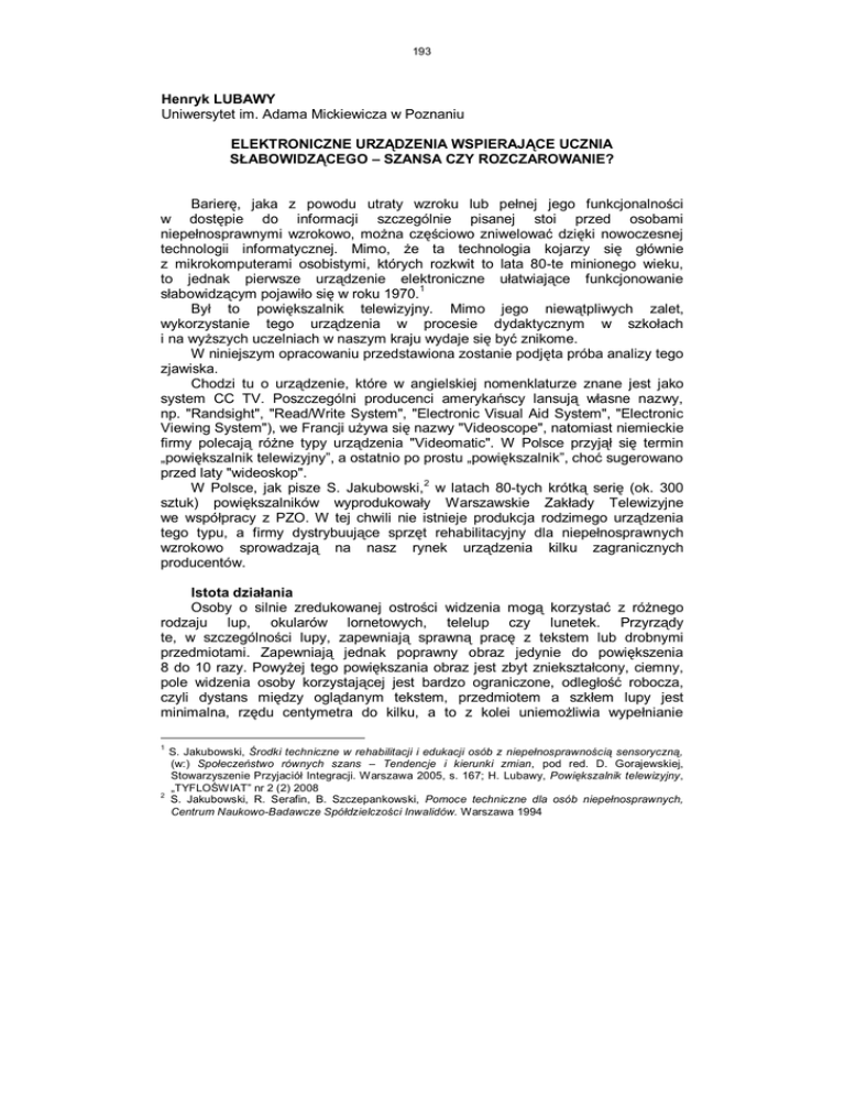 193 Henryk LUBAWY Uniwersytet im. Adama Mickiewicza w Poznaniu ELEKTRONICZNE URZĄDZENIA WSPIERAJĄCE UCZNIA SŁABOWIDZĄCEGO – SZANSA CZY ROZCZAROWANIE? Barierę, jaka z powodu utraty wzroku lub pełnej jego funkcjonalności w dostępie do informacji szczególnie pisanej stoi przed osobami niepełnosprawnymi wzrokowo, można częściowo zniwelować dzięki nowoczesnej technologii informatycznej. Mimo, że ta technologia kojarzy się głównie z mikrokomputerami osobistymi, których rozkwit to lata 80-te minionego wieku, to jednak pierwsze urządzenie elektroniczne ułatwiające funkcjonowanie słabowidzącym pojawiło się w roku 1970.1 Był to powiększalnik telewizyjny. Mimo jego niewątpliwych zalet, wykorzystanie tego urządzenia w procesie dydaktycznym w szkołach i na wyższych uczelniach w naszym kraju wydaje się być znikome. W niniejszym opracowaniu przedstawiona zostanie podjęta próba analizy tego zjawiska. Chodzi tu o urządzenie, które w angielskiej nomenklaturze znane jest jako system CC TV. Poszczególni producenci amerykańscy lansują własne nazwy, np. "Randsight", "Read/Write System", "Electronic Visual Aid System", "Electronic Viewing System"), we Francji używa się nazwy "Videoscope", natomiast niemieckie firmy polecają różne typy urządzenia "Videomatic". W Polsce przyjął się termin „powiększalnik telewizyjny”, a ostatnio po prostu „powiększalnik”, choć sugerowano przed laty "wideoskop". W Polsce, jak pisze S. Jakubowski,2 w latach 80-tych krótką serię (ok. 300 sztuk) powiększalników wyprodukowały Warszawskie Zakłady Telewizyjne we współpracy z PZO. W tej chwili nie istnieje produkcja rodzimego urządzenia tego typu, a firmy dystrybuujące sprzęt rehabilitacyjny dla niepełnosprawnych wzrokowo sprowadzają na nasz rynek urządzenia kilku zagranicznych producentów. Istota działania Osoby o silnie zredukowanej ostrości widzenia mogą korzystać z różnego rodzaju lup, okularów lornetowych, telelup czy lunetek. Przyrządy te, w szczególności lupy, zapewniają sprawną pracę z tekstem lub drobnymi przedmiotami. Zapewniają jednak poprawny obraz jedynie do powiększenia 8 do 10 razy. Powyżej tego powiększania obraz jest zbyt zniekształcony, ciemny, pole widzenia osoby korzystającej jest bardzo ograniczone, odległość robocza, czyli dystans między oglądanym tekstem, przedmiotem a szkłem lupy jest minimalna, rzędu centymetra do kilku, a to z kolei uniemożliwia wypełnianie 1 2 S. Jakubowski, Środki techniczne w rehabilitacji i edukacji osób z niepełnosprawnością sensoryczną, (w:) Społeczeństwo równych szans – Tendencje i kierunki zmian, pod red. D. Gorajewskiej, Stowarzyszenie Przyjaciół Integracji. Warszawa 2005, s. 167; H. Lubawy, Powiększalnik telewizyjny, „TYFLOŚWIAT” nr 2 (2) 2008 S. Jakubowski, R. Serafin, B. Szczepankowski, Pomoce techniczne dla osób niepełnosprawnych, Centrum Naukowo-Badawcze Spółdzielczości Inwalidów. Warszawa 1994 194 formularzy, odpowiedzi w testach czy złożenie podpisu. Większy dystans do oglądanego przedmiotu zapewniają telelupy, monookulary i lunetki. Są to jednak przyrządy optyczne składające się z wielu szkieł, co powoduje, że bywają stosunkowo ciężkie. Bez statywu, podstawki lub umocowania na głowie obraz jest drżący, a ręce i uwaga pracującego są skupione na utrzymaniu takiego przyrządu. Nie tylko mała odległość robocza, ale i konieczność przysunięcia szkła bardzo blisko oka może powodować nieprawidłową i męczącą postawę ciała. Ponadto, korzystając z wymienionych tu przyrządów optycznych przy silnych powiększeniach możliwa jest jedynie praca jednym okiem, co dodatkowo może powodować zmęczenie i frustrację u obuocznych użytkowników. Każdy przyrząd optyczny dostarcza do oka tylko tyle światła, ile przez niego przechodzi. Nieco więcej światła mogą dostarczyć lupy z podświetleniem jednak sytuacja odwrotna, czyli ograniczenie nadmiaru światła jest w nich zupełnie niemożliwa. Zupełnie inny sposób powstawania obrazu w powiększalniku nie ma tych wad, choć oczywiście używanie przyrządów optycznych we wszystkich sytuacjach, w których mogą być przydatne, jest umiejętnością nie do przecenienia. Jednak, gdy ostrość wzroku spada poniżej 5%, czytanie normalnego tekstu jest niemożliwe nawet przy ich użyciu. Zdjęcie nr 1: Powiększalnik Magni link Penguin daje płynne powiększenie od 4 do 20 razy Metoda powstawania powiększenia Przyrządy optyczne rzutują powiększony obraz na siatkówkę oka wykorzystując do tego celu optykę samego oka. System telewizyjny pozwala na uzyskiwanie powiększenia tekstu w zupełnie inny sposób. W powiększalniku oglądany obraz powstaje na ekranie monitora. Rzutowany jest nie bezpośrednio 195 przez układ optyczny, a powstaje w sposób elektroniczny na ekranie już jako powiększony. Sytuacja taka jest bardziej naturalna ze względu na bezpośredni kontakt oka z tekstem, bez pośrednictwa aparatów optycznych. Każdy element ekranu, piksel, emituje docierające do oka światło, którego ilość można regulować. Zastosowanie zamkniętego obwodu telewizyjnego sprawia, że rząd i powierzchnia powiększenia czy oddalenia odtwarzanego obrazu mogą być regulowane odpowiednio do ostrości wzroku oraz do indywidualnych potrzeb osoby niedowidzącej. Używanie powiększalnika telewizyjnego daje też możliwość jednoczesnego patrzenia obuocznego. Przy tym sposobie czytania istnieje większa swoboda poruszania głową i oczami, co zapewnia kontakt z otoczeniem. Monitor Jak już wspomniano, w pierwszych powiększalnikach, w charakterze monitorów urządzenia, stosowano najzwyklejsze telewizory. Innych rozwiązań po prostu nie było. Monitor telewizyjny nie jest przeznaczony do oglądania nieruchomych obrazów. Migotanie, szczególnie jasnej powierzchni, gdy czarne litery są wyświetlane na białym tle, jest bardzo męczące dla wzroku. Wprowadzono wobec tego możl