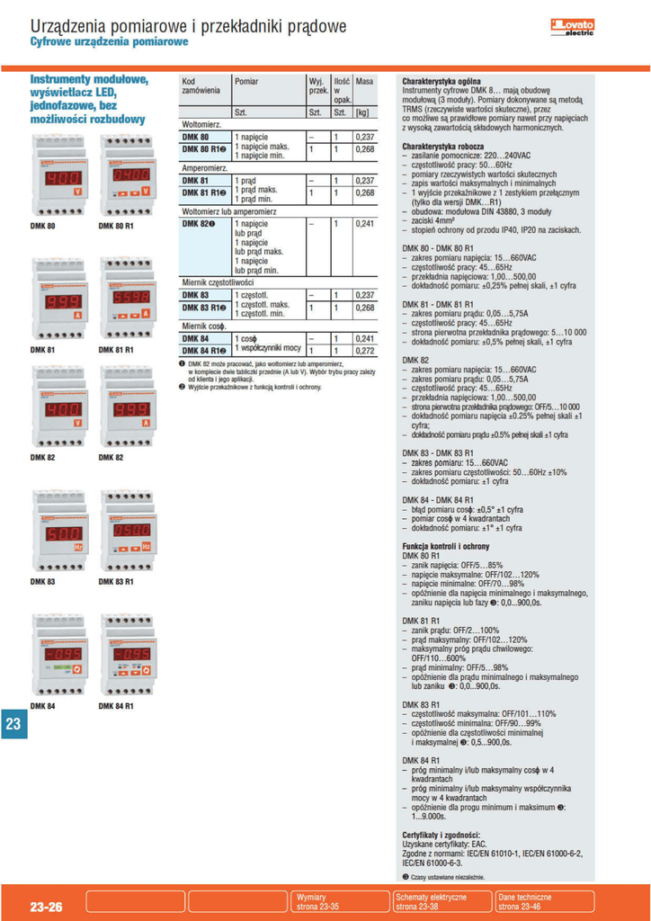 Urządzenia pomiarowe i przekładniki prądowe plectric Cyfrowe urządzenia pomiarowe Instrumenty modułowe, wyświetlacz LED, jednofazowe, bez możliwości rozbudowy Kod zamówienia Wyj. Ilość Masa przek. w opak. Szt. Szt. Szt. [kg] 1 napięcie 1 napięcie maks. 1 napięcie min. - 1 1 0,237 1 1 0,237 Woltomierz. DMK 30 DMK 30 m e s==- Pomiar 1 0,268 Amperomierz. - DMK 31 .aaD 1 prąd DMK 31 R1© 1 prąd maks. 1 prąd min. 1 0,268 Woltomierz lub amperomierz DMK BO DMK 320 DMK BO R1 » * ł ł « 1 napięcie lob prąd 1 napięcie lub prąd maks. 1 napięcie lub prąd min. 0,241 DMK 33 m e 1 częstotl. 1 częstotl. maks. 1 częstotl. min. - 1 созф 1 współczynniki mocy - 1 1 1 0,237 1 1 0,241 0,268 Miernik cos$. DMK 84 DMK 81 DMK 81 R1 DMK 84 R1© Charakterystyka robocza - zasilanie pomocnicze: 220...240VAC - częstotliwość pracy: 50...60Hz - pomiary rzeczywistych wartości skutecznych - zapis wartości maksymalnych i minimalnych - 1 wyjście przekaźnikowe z 1 zestykiem przełącznym (tylko dla wersji DMK..,R1) - obudowa: modułowa DIN 43880,3 moduły - zaciski 4mm ! - stopień ochrony od przodu IP40, IP20 na zaciskach. DMK 80 - DMK 80 R1 - zakres pomiaru napięcia: 15...660VAC - częstotliwość pracy: 45...65Hz - przekładnia napięciowa: 1,00.. .500,00 - dokładność pomiaru: ±0,25% pełnej skali, ±1 cyfra Miernik częstot iwości DMK 83 Charakterystyka a gul na Instrumenty cyfrowe DMK 8... mają obudowę modułową (3 moduły). Pomiary dokonywane są metodą TPiMS (rzeczywiste wartości skuteczne), przez co możliwe są prawidłowe pomiary nawet przy napięciach z wysoką zawartością składowych harmonicznych. 1 O DMK 81-DMK 81 R1 - zakres pomiaru prądu: 0,05.. .5.75A - częstotliwość pracy: 45...65Hz - strona pierwotna przektadnika prądowego: 5...10 000 - dokładność pomiaru: ±0,5% pełnej skali, ±1 cyfra 0,272 DMK 82 może pracować, jako woltomierz lub amperomierz. w komplecie dwie tabliczki przednie (A lob V). Wybór Lryhu pracy zależy od klienta i jego aplikacji. © Wyjście przekaźnikowe z funkcją kontroli i ochrony. DMK 82 - zakres pomiaru napięcia: 15...660VAC - zakres pomiaru prądu: 0,05. ..5,75A - częstotliwość pracy: 45...65Hz - przekładnia napięciowa: 1,00. ..500,00 - sironapierwotraprzekładnikaprądowego:OFT75... 10000 - dokładność pomiaru napięcia ±0.25% pełnej skali ±1 cyfra; - dokfednoścpom«anjprądu±0.5%pełnejskali±1 cyfra DMK 83 - DMK 83 R1 - zakres pomiaru: 15...66WAC - zakres pomiaru częstotliwości: 50...60Hz ±10% - dokładność pomiaru: ±1 cyfra DMK 84-DMK 84 R1 - błąd pomiaru совф: ±0,5" ±1 cyfra - pomiar совф w 4 kwadrantach - dokładność pomiaru: ±1°±1 cyfra Funkcja kontroli i ochrony DMK 80 R1 - zanik napięcia: OFF/5...85% - napięcie maksymalne: OFF/102...120% - napięcie minimalne: OFF/70...98% - opóźnienie dla napięcia minimalnego i maksymalnego, zaniku napięcia lub fazy ©: 0,0...900,0s. DMK 81 R1 - zanikprądu:OFF/2...100% - prąd maksymalny: OFF/102...120% - maksymalny próg prądu chwilowego: OFF/110...600% - prąd minimalny: OFF/5...98% - opóźnienie dla prądu minimalnego i maksymalnego lub zaniku « : 0,0...900,0s. DMK 83 R1 - częstotliwość maksymalna: OFF/101...11D% - częstotliwość minimalna: DFF/90...99% - opóźnienie dla częstotliwości minimalnej i maksymalnej ©: 0,5...900,0s. DMK 84 R1 - próg minimalny i/lub maksymalny совф w 4 kwadrantach - próg minimalny i/lub maksymalny współczynnika mocy w 4 kwadrantach - opóźnienie dla progu minimum i maksimum ©: 1...9.000S. Certyfikaty i zgodności: Uzyskane certyfikaty: EAC. Zgodne z normami: IEC/EN 61010-1, IEC/EN 61000-6-2, IEC/EN 61000-6-3. © Czasy ustawiane niezależnie. Wymiary strona 23-35 Schematy elektryczne strona 23-38 Dane techniczne strona 23-46