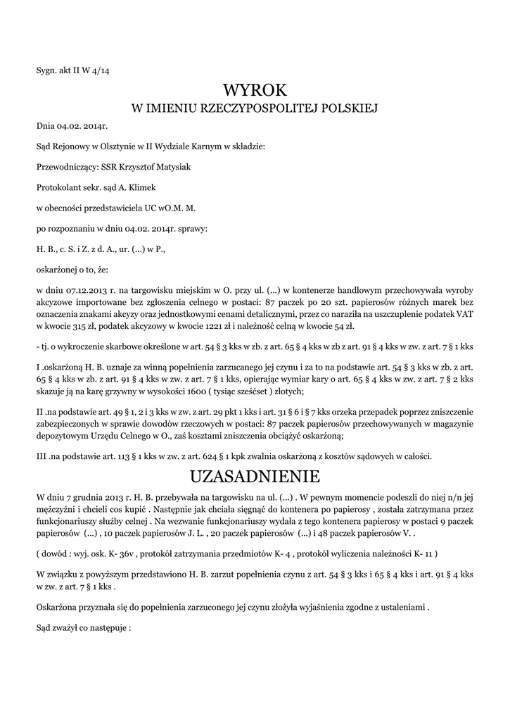 Sygn. akt II W 4/14 WYROK W IMIENIU RZECZYPOSPOLITEJ POLSKIEJ Dnia 04.02. 2014r. Sąd Rejonowy w Olsztynie w II Wydziale Karnym w składzie: Przewodniczący: SSR Krzysztof Matysiak Protokolant sekr. sąd A. Klimek w obecności przedstawiciela UC wO.M. M. po rozpoznaniu w dniu 04.02. 2014r. sprawy: H. B., c. S. i Z. z d. A., ur. (...) w P., oskarżonej o to, że: w dniu 07.12.2013 r. na targowisku miejskim w O. przy ul. (...) w kontenerze handlowym przechowywała wyroby akcyzowe importowane bez zgłoszenia celnego w postaci: 87 paczek po 20 szt. papierosów różnych marek bez oznaczenia znakami akcyzy oraz jednostkowymi cenami detalicznymi, przez co naraziła na uszczuplenie podatek VAT w kwocie 315 zł, podatek akcyzowy w kwocie 1221 zł i należność celną w kwocie 54 zł. - tj. o wykroczenie skarbowe określone w art. 54 § 3 kks w zb. z art. 65 § 4 kks w zb z art. 91 § 4 kks w zw. z art. 7 § 1 kks I .oskarżoną H. B. uznaje za winną popełnienia zarzucanego jej czynu i za to na podstawie art. 54 § 3 kks w zb. z art. 65 § 4 kks w zb. z art. 91 § 4 kks w zw. z art. 7 § 1 kks, opierając wymiar kary o art. 65 § 4 kks w zw. z art. 7 § 2 kks skazuje ją na karę grzywny w wysokości 1600 ( tysiąc sześćset ) złotych; II .na podstawie art. 49 § 1, 2 i 3 kks w zw. z art. 29 pkt 1 kks i art. 31 § 6 i § 7 kks orzeka przepadek poprzez zniszczenie zabezpieczonych w sprawie dowodów rzeczowych w postaci: 87 paczek papierosów przechowywanych w magazynie depozytowym Urzędu Celnego w O., zaś kosztami zniszczenia obciążyć oskarżoną; III .na podstawie art. 113 § 1 kks w zw. z art. 624 § 1 kpk zwalnia oskarżoną z kosztów sądowych w całości. UZASADNIENIE W dniu 7 grudnia 2013 r. H. B. przebywała na targowisku na ul. (...) . W pewnym momencie podeszli do niej n/n jej mężczyźni i chcieli cos kupić . Następnie jak chciała sięgnąć do kontenera po papierosy , została zatrzymana przez funkcjonariuszy służby celnej . Na wezwanie funkcjonariuszy wydała z tego kontenera papierosy w postaci 9 paczek papierosów (...) , 10 paczek papierosów J. L. , 20 paczek papierosów (...) i 48 paczek papierosów V. . ( dowód : wyj. osk. K- 36v , protokół zatrzymania przedmiotów K- 4 , protokół wyliczenia należności K- 11 ) W związku z powyższym przedstawiono H. B. zarzut popełnienia czynu z art. 54 § 3 kks i 65 § 4 kks i art. 91 § 4 kks w zw. z art. 7 § 1 kks . Oskarżona przyznała się do popełnienia zarzuconego jej czynu złożyła wyjaśnienia zgodne z ustaleniami . Sąd zważył co następuje : Sąd analizując materiał dowodowy uznał , iż okoliczności popełnienia czynu nie budzą wątpliwości . Przedmiotowe papierosy zostały ujawnione w kontenerze na targowisku przy ul. (...) gdzie przechowywane były przez oskarżoną. Potwierdziła ona fakt przechowywania papierosów w kontenerze oraz to , że należały do niej . Jak wynika z wyliczenia uszczuplonych wartości zachowanie to stanowi wykroczenie z art. 54 § 3 kks i 65 § 4 kks i art. 91 § 4 kks w zw. z art. 7 § 1 kks. Przy orzekaniu kary Sąd wziął pod uwagę : - uprzednia karalność K- 23 - wydruk z (...) K- 20-21 - ustalenia dotyczące danych osobowych K-8 Mając powyższe na uwadze Sąd uznając oskarżoną H. B. winną popełnienia zarzucanego jej czynu skazał ją na karę grzywny w wysokości 1600 ( tysiąc sześćset ) złotych uznając , iż jest ona odpowiednia do stopnia społecznej szkodliwości i zawinienia . Ponadto na podstawie art. 49 § 1, 2 i 3 kks w zw. z art. 29 pkt 1 kks i art. 31 § 6 i § 7 kks orzeczono przepadek poprzez zniszczenie zabezpieczonych w sprawie dowodów rzeczowych w postaci: 87 paczek papierosów przechowywanych w magazynie depozytowym Urzędu Celnego w O. a kosztami ich zniszczenia obciążono oskarżoną; Z uwagi na stan majątkowy oskarżonej zwolniono ją z kosztów sądowych w całości.
