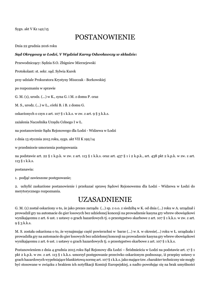 Sygn. akt V Kz 142/15 POSTANOWIENIE Dnia 22 grudnia 2016 roku Sąd Okręgowy w Łodzi, V Wydział Karny Odwoławczy w składzie: Przewodniczący: Sędzia S.O. Zbigniew Mierzejewski Protokolant: st. sekr. sąd. Sylwia Kurek przy udziale Prokuratora Krystyny Miszczak - Borkowskiej po rozpoznaniu w sprawie G. M. (1), urodz. (...) w K., syna G. i M. z domu P. oraz M. S., urodz. (...) w Ł., córki B. i B. z domu G. oskarżonych o czyn z art. 107 § 1 k.k.s. w zw. z art. 9 § 3 k.k.s. zażalenia Naczelnika Urzędu Celnego I w Ł. na postanowienie Sądu Rejonowego dla Łodzi - Widzewa w Łodzi z dnia 13 stycznia 2015 roku, sygn. akt VII K 192/14 w przedmiocie umorzenia postępowania na podstawie art. 22 § 1 k.p.k. w zw. z art. 113 § 1 k.k.s. oraz art. 437 § 1 i 2 k.p.k., art. 438 pkt 2 k.p.k. w zw. z art. 113 § 1 k.k.s. postanawia: 1. podjąć zawieszone postępowanie; 2. uchylić zaskarżone postanowienie i przekazać sprawę Sądowi Rejonowemu dla Łodzi - Widzewa w Łodzi do merytorycznego rozpoznania. UZASADNIENIE G. M. (1) został oskarżony o to, że jako prezes zarządu (...) sp. z o.o. z siedzibą w K. od dnia (...) roku w A. urządzał i prowadził gry na automacie do gier losowych bez udzielonej koncesji na prowadzenie kasyna gry wbrew obowiązkowi wynikającemu z art. 6 ust. 1 ustawy o grach hazardowych tj. o przestępstwo skarbowe z art. 107 § 1 k.k.s. w zw. z art. 9 § 3 k.k.s. M. S. została oskarżona o to, że wynajmując część powierzchni w barze (...) w A. w okresie(...) roku w Ł. urządzała i prowadziła gry na automacie do gier losowych bez udzielonej koncesji na prowadzenie kasyna gry wbrew obowiązkowi wynikającemu z art. 6 ust. 1 ustawy o grach hazardowych tj. o przestępstwo skarbowe z art. 107 § 1 k.k.s. Postanowieniem z dnia 4 grudnia 2015 roku Sąd Rejonowy dla Łodzi – Śródmieścia w Łodzi na podstawie art. 17 § 1 pkt 2 k.p.k. w zw. z art. 113 § 1 k.k.s. umorzył postępowanie przeciwko oskarżonym podnosząc, iż przepisy ustawy o grach hazardowych wypełniające blankietową normę art. 107 § 1 k.k.s. jako mające tzw. charakter techniczny nie mogły być stosowane w związku z brakiem ich notyfikacji Komisji Europejskiej, a nadto powołując się na brak umyślności działania oskarżonych wynikającą z posiadania prywatnych opinii technicznych o zręcznościowym, a nie losowym charakterze urządzeń do gier. Postanowienie Sądu Rejonowego zaskarżył w całości zażaleniem na niekorzyść oskarżonych oskarżyciel publiczny – Naczelnik Urzędu Celnego I w Ł. zarzucając zaskarżonemu orzeczeniu: 1. błędy w ustaleniach faktycznych przyjęte za jego podstawę i mające wpływ na jego treść polegające na: • dokonaniu ustaleń faktycznych w oparciu o prywatną opinię; • nieodniesieniu się przez Sąd Rejonowy do faktu, iż G. M. (1) był zobligowany do zastosowania trybu przewidzianego w art. 2 ust. 6 ustawy o grach hazardowych; • przyjęciu braku umyślności działania oskarżonego G. M. (1) co do losowego charakteru eksploatowanych urządzeń mimo, iż ich zręcznościowy charakter był kwestionowany przez organy kontroli od co najmniej 2011 roku; • uznaniu, iż oskarżeni od momentu rozpoczęcia współpracy nie mieli świadomości co do przestępczego charakteru swojego zachowania, podczas gdy taka świadomość wynikała z treści załącznika do zawartej pomiędzy nimi umowy; 2. obrazę przepisów postępowania mającą wpływ na treść orzeczenia tj. art. 4 k.p.k. w zw. z art. 113 § 1 k.k.s. polegającą na braku zachowania równego stosunku do obu stron postępowania poprzez pominięcie dowodów wskazanych przez oskarżyciela; w uzasadnieniu zażalenia zarzucono także wadliwość umorzenia postępowania w przedmiotowej sprawie na posiedzeniu mimo tego, że wymagała ona przeprowadzenia rozprawy; 3. obrazę przepisów prawa materialnego tj. art. 107 § 1 k.k.s., polegającą na błędnym przyjęciu, że przepis ten, jako mający charakter blankietowy, nie może być wypełniony przepisami art. 6 i 14 ustawy o grach hazardowych i jednocześnie nie może stać się podstawą odpowiedzialności oskarżonych. Podnosząc powyższe zarzuty oskarżyciel publiczny wniósł o uchylenie zaskarżonego postanowienia i przekazanie sprawy Sądowi Rejonowemu do ponownego rozpoznania. Postanowieniem z dnia 24 kwietnia 2015 roku Sąd Okręgowy w Łodzi zawiesił postępowanie w przedmiotowej sprawie do czasu udzielenia odpowiedzi przez Trybunał Sprawiedliwości Unii Europejskiej na pytanie prejudycjalne Sądu Okręgowego w Łodzi dotyczące możliwości zróżnicowania skutków braku notyfikacji przepisów technicznych ustawy o grach hazardowych. Sąd Okręgowy zważył, co następuje. W przedmiotowej sprawie odpadła przesłanka zawieszenia postępowania, bowiem w dniu 13 października 2016 r. Trybunał Sprawiedliwości Unii Europejskiej w sprawie C 303/15 udzielił odpowiedzi na pytanie prejudycjalne Sądu Okręgowego w Łodzi stwierdzając, iż art. 1 dyrektywy 98/34 Parlamentu Europejskiego i Rady z dnia 22 czerwca 1998 r. ustanawiającej procedurę udzielania informacji w dziedzinie norm i przepisów technicznych oraz zasad dotyczących usług społeczeństwa informacyjnego (Dz.U. 1998, L 204, s. 37 – wyd. spec. w jęz. polskim, rozdz. 13, t. 20, s. 337), zmienionej dyrektywą 98/48/WE Parlamentu Europejskiego i Rady z dnia 20 lipca 1998 r., należy interpretować w ten sposób, że przepis krajowy, taki jak art. 6 ustawy o grach hazardowych, nie wchodzi w zakres pojęcia „przepisów technicznych” w rozumieniu tej dyrektywy, podlegających obowiązkowi notyfikacji. Odnosząc się natomiast do zażalenia Naczelnika Urzędu Celnego I w Ł. należy uznać, że było ono zasadne. Argumenty podniesione w uzasadnieniu zaskarżonego postanowienia Sądu Rejonowego o braku możliwości stosowania wobec oskarżonego nienotyfikowanych przepisów technicznych ustawy o grach hazardowych siłą rzeczy nie mogą zostać uznane za trafn
