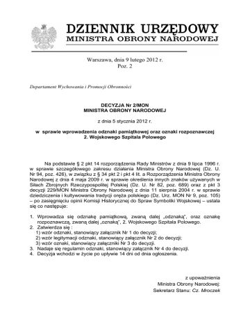 Warszawa, dnia 9 lutego 2012 r. Poz. 2 Departament Wychowania i Promocji Obronności DECYZJA Nr 2/MON MINISTRA OBRONY NARODOWEJ z dnia 5 stycznia 2012 r. w sprawie wprowadzenia odznaki pamiątkowej oraz oznaki rozpoznawczej 2. Wojskowego Szpitala Polowego Na podstawie § 2 pkt 14 rozporządzenia Rady Ministrów z dnia 9 lipca 1996 r. w sprawie szczegółowego zakresu działania Ministra Obrony Narodowej (Dz. U. Nr 94, poz. 426), w związku z § 34 pkt 2 i pkt 4 lit. a Rozporządzenia Ministra Obrony Narodowej z dnia 4 maja 2009 r. w sprawie określenia innych znaków używanych w Siłach Zbrojnych Rzeczypospolitej Polskiej (Dz. U. Nr 82, poz. 689) oraz z pkt 3 decyzji 229/MON Ministra Obrony Narodowej z dnia 11 sierpnia 2004 r. w sprawie dziedziczenia i kultywowania tradycji oręża polskiego (Dz. Urz. MON Nr 9, poz. 105) – po zasięgnięciu opinii Komisji Historycznej do Spraw Symboliki Wojskowej – ustala się co następuje: 1. Wprowadza się odznakę pamiątkową, zwaną dalej „odznaką”, oraz oznakę rozpoznawczą, zwaną dalej „oznaką”, 2. Wojskowego Szpitala Polowego. 2. Zatwierdza się : 1) wzór odznaki, stanowiący załącznik Nr 1 do decyzji; 2) wzór legitymacji odznaki, stanowiący załącznik Nr 2 do decyzji; 3) wzór oznaki, stanowiący załączniki Nr 3 do decyzji. 3. Nadaje się regulamin odznaki, stanowiący załącznik Nr 4 do decyzji. 4. Decyzja wchodzi w życie po upływie 14 dni od dnia ogłoszenia. z upoważnienia Ministra Obrony Narodowej: Sekretarz Stanu: Cz. Mroczek Załączniki do decyzji Nr 2/MON Ministra Obrony Narodowej z dnia 5 stycznia 2012 r. (poz. 2). Załącznik Nr 1 WZÓR GRAFICZNY ODZNAKI PAMIĄTKOWEJ 2. WOJSKOWEGO SZPITALA POLOWEGO Załącznik Nr 2 WZÓR GRAFICZNY LEGITYMACJI ODZNAKI PAMIĄTKOWEJ 2. WOJSKOWEGO SZPITALA POLOWEGO 2. WOJSKOWY SZPITAL POLOWY ................................. (stopień) ................................................ (imię i nazwisko) ARS QUA NULLA EST PRAESTANTIOR ATQUE DIFFICILIOR m.p. uchwałą Komisji Odznaki Pamiątkowej 2. Wojskowego Szpitala Polowego z dnia ……………….. jest uprawniony do posiadania Odznaki Pamiątkowej nr ………… wręczonej przez Komendanta 2 WSzP w dniu ……………….. (podpis) Nr rozkazu J.W……………………. Załącznik Nr 3 WZÓR GRAFICZNY OZNAKI ROZPOZNAWCZEJ 2. WOJSKOWEGO SZPITALA POLOWEGO Załącznik nr 4 REGULAMIN NADAWANIA ODZNAKI PAMIĄTKOWEJ 2. WOJSKOWEGO SZPITALA POLOWEGO 1. Odznaka pamiątkowa 2. Wojskowego Szpitala Polowego, zwana dalej „odznaką”, ustanowiona została jako forma wyróżnienia, dla podkreślenia szczególnych zasług żołnierzy zawodowych dla szpitala i dowód uznania ich ofiarnej oraz sumiennej służby. Odznaka jest także wyrazem więzi łączącej kadrę, u podstaw której leżą tradycje wojskowej służby zdrowia, etos służby, oraz duma z dotychczasowych dokonań i charakteru wykonywanych zadań. 2. Odznaka w kształcie wypukłego krzyża maltańskiego w swej kolorystyce nawiązuje do historycznych barw wojskowej służby zdrowia oraz charakteru działań 2. Wojskowego Szpitala Polowego, jako jednostki wojskowej działającej poza granicami kraju. Całość uzupełnia skrót nazwy szpitala . 3. Każda nadana odznaka posiada na odwrocie numer porządkowy. Potwierdzeniem nadania odznaki jest imienna legitymacja posiadacza, z wpisanym numerem odznaki. 4. W wypadku nadania odznaki osobie spoza szpitala, na jej odwrocie oraz w legitymacji oprócz numeru umieszcza się literę H, numer i napis „nadana honorowo”. 5. Odznakę nosi się na mundurze wyjściowym zgodnie z zasadami określonymi w przepisach ubiorczych żołnierzy Sił Zbrojnych Rzeczypospolitej Polskiej. 6. W okolicznościach, kiedy nie zakłada się odznaki, można nosić jej miniaturę. 7. Miniaturę odznaki można nosić do wizytowego ubioru cywilnego, w jego lewej klapie. 8. Prawo do otrzymana odznaki przysługuje: 1) Komendantowi 2. Wojskowego Szpitala Polowego – z tytułu objęcia stanowiska służbowego; 2) zastępcy komendanta i kierownikom zespołów – po przesłużeniu co najmniej roku w 2. Wojskowym Szpitalu Polowym; 3) żołnierzom zawodowym – po przesłużeniu w 2. Wojskowym Szpitalu Polowym co najmniej dwóch lat; 4) osobom fizycznym lub prawnym spoza szpitala – szczególnie zasłużonym dla 2. Wojskowego Szpitala Polowego na wniosek Komendanta lub organów przedstawicielskich żołnierzy zawodowych pełniących służbę wojskową w szpitalu, albo zainteresowanych środowisk cywilnych; 5) w szczególnych wypadkach a) po co najmniej sześciomiesięcznej służbie wojskowej poza granicami kraju w strukturze organizowanej przez 2. Wojskowy Szpital Polowy w strefie działań wojennych albo w razie odniesienia ran lub urazów w tej strefie (w tych przypadkach okresy wymienione w pkt 2 i 3 nie obowiązują), b) pośmiertnie; 9. Odznakę nadaje Komendant Szpitala, na wniosek Przewodniczącego Komisji ds. Odznaki Pamiątkowej, zwanej dalej „Komisją”. 10. Osobami upoważnionymi do występowania do Przewodniczącego Komisji z pisemnym wnioskiem o nadanie odznaki są: 1) Szef Sztabu Szpitala; 2) Szef Logistyki; 3) kierownicy zespołów medycznych; Wnioski w tej sprawie powinny być kierowane poprzez mężów zaufania poszczególnych korpusów osobowych kadry zawodowej 2. Wojskowego Szpitala Polowego. 11. Odznaka może być nadana tylko raz. 12. Nadanie odznaki odnotowuje się w rozkazie dziennym Szpitala oraz w kronice szpitala. 13. Posiadacze odznaki tracą prawo do jej noszenia w razie ukarania prawomocnym wyrokiem przestępstwo, wykroczenie sądu lub lub ukarania przewinienie dyscyplinarnego dyscyplinarne – za popełnione z niskich pobudek lub winy umyślnej. 14. W przypadkach, o których mowa w pkt 13 Komendant Szpitala ogłasza w rozkazie dziennym szpitala fakt utraty prawa do noszenia odznaki. W innych, szczególnie uzasadnionych przypadkach posiadacz odznaki może być pozbawienia prawa do jej noszenia; decyzję w tej sprawie podejm
