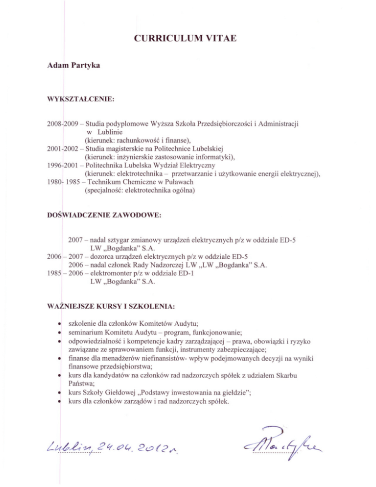 CURRICULUM VITAE I Adam Partyka WYKSZT ALCENIE: 2008ho09 - Studia podyplomowe Wyzsza Szkola Przedsiebiorczosci i Administracji w Lublinie (kierunek: rachunkowosc i finanse), 2001~2002 - Studia magisterskie na Politechnice Lubelskiej (kierunek: inzynierskie zastosowanie informatyki), 1996-2001 - Politechnika Lubelska Wydzial Elektryczny (kierunek: elektrotechnika - przetwarzanie i uzytkowanie energii elektrycznej), 198011985 - Technikum Chemiczne w Pulawach (specjalnosc: elektrotechnika ogólna) ,1 DOSWIADCZENIE ZAWODOWE: 2007 - nadal sztygar zmianowy urzadzen elektrycznych plz w oddziale ED-5 LW "Bogdanka" S.A. 2006 - 2007 - dozorca urzadzen elektrycznych plz w oddziale ED-5 2006 - nadal czlonek Rady Nadzorczej LW "LW "Bogdanka" S.A. 198512006 - elektromonter p/z w oddziale ED-1 LW "Bogdanka" S.A. 1 WAZNIEJSZE KURSY I SZKOLENIA: • szkolenie dla czlonków Komitetów Audytu; .1 seminarium Komitetu Audytu - program, funkcjonowanie; • odpowiedzialnosc i kompetencje kadry zarzadzajacej - prawa, obowiazki i ryzyko zawiazane ze sprawowaniem funkcji, instrumenty zabezpieczajace; • finanse dla menadzerów niefinansistów- wplyw podejmowanych decyzji na wyniki finansowe przedsiebiorstwa; • kurs dla kandydatów na czlonków rad nadzorczych spólek z udzialem Skarbu Panstwa; .1 kurs Szkoly Gieldowej "Podstawy inwestowania na gieldzie"; • kurs dla czlonków zarzadów i rad nadzorczych spólek.