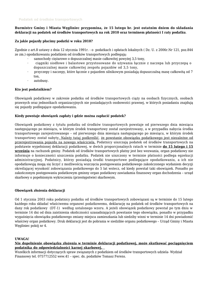 Podatek od środków transportowych Burmistrz Gminy i Miasta Węgliniec przypomina, że 15 lutego br. jest ostatnim dniem do składania deklaracji na podatek od środków transportowych na rok 2010 oraz terminem płatności I raty podatku. Za jakie pojazdy płacimy podatki w roku 2010? Zgodnie z art.8 ustawy z dnia 12 stycznia 1991r. - o podatkach i opłatach lokalnych ( Dz. U. z 2006r.Nr 121, poz.844 ze zm.) opodatkowaniu podatkiem od środków transportowych podlegają: · samochody ciężarowe o dopuszczalnej masie całkowitej powyżej 3,5 tony, · ciągniki siodłowe i balastowe przystosowane do używania łącznie z naczepa lub przyczepą o dopuszczalnej masie całkowitej zespołu pojazdów od 3,5 tony, · przyczepy i naczepy, które łącznie z pojazdem silnikowym posiadają dopuszczalną masę całkowitą od 7 ton, · autobusy. Kto jest podatnikiem? Obowiązek podatkowy w zakresie podatku od środków transportowych ciąży na osobach fizycznych, osobach prawnych oraz jednostkach organizacyjnych nie posiadających osobowości prawnej, w których posiadaniu znajdują się pojazdy podlegające opodatkowaniu. Kiedy powstaje obowiązek zapłaty i gdzie można zapłacić podatek? Obowiązek podatkowy z tytułu podatku od środków transportowych powstaje od pierwszego dnia miesiąca następującego po miesiącu, w którym środek transportowy został zarejestrowany, a w przypadku nabycia środka transportowego zarejestrowanego – od pierwszego dnia miesiąca następującego po miesiącu, w którym środek transportowy został nabyty. Należy tutaj podkreślić, że powstanie obowiązku podatkowego jest niezależne od przerejestrowania pojazdu na nowego właściciela. Podatnicy uiszczają podatek od środków transportowych na podstawie wypełnionej deklaracji podatkowej, w dwóch proporcjonalnych ratach w terminie do 15 lutego i 15 września na rachunek gminy. Podatek od środków transportowych płatny jest bez wezwania, organ podatkowy nie informuje o konieczności uiszczenia podatku. Podatek nie uiszczony w terminie płatności podlega egzekucji administracyjnej. Podatnicy, którzy posiadają środki transportowe podlegające opodatkowaniu, a ich nie opodatkowują mogą się liczyć z możliwością wszczęcia postępowania podatkowego zakończonego wydaniem decyzji określającej wysokość zobowiązania podatkowego do 5 lat wstecz, od kiedy powstał taki obowiązek. Ponadto po zakończonym postępowaniu podatkowym gminny organ podatkowy zawiadamia finansowy organ dochodzenia – urząd skarbowy o popełnionym wykroczeniu (przestępstwie) skarbowym. Obowiązek złożenia deklaracji Od 1 stycznia 2003 roku podatnicy podatku od środków transportowych zobowiązani są w terminie do 15 lutego każdego roku składać właściwemu organowi podatkowemu, deklarację na podatek od środków transportowych na dany rok podatkowy (DT-1) według ustalonego wzoru. A jeżeli obowiązek podatkowy powstał po tym dniu w terminie 14 dni od dnia zaistnienia okoliczności uzasadniających powstanie tego obowiązku, ponadto w przypadku wygaśnięcia obowiązku podatkowego zmiany miejsca zamieszkania lub siedziby winni w terminie 14 dni powiadomić właściwy organ podatkowy. Druk deklaracji jest do pobrania w siedzibie organu podatkowego – Urząd Gminy i Miasta Węgliniec pokój nr 4. UWAGA! Nie dopełnienie obowiązku złożenia w terminie deklaracji podatkowej, może skutkować pociągnięciem podatnika do odpowiedzialności karnej skarbowej. Wszelkich informacji dotyczących spraw związanych z podatkiem od środków transportowych udziela- Wydział Finansowy tel. 0757712552 wew.41 – spec. ds. podatków Tomasz Ferens.