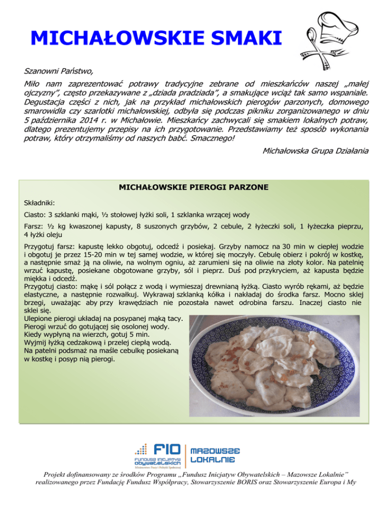 MICHAŁOWSKIE SMAKI Szanowni Państwo, Miło nam zaprezentować potrawy tradycyjne zebrane od mieszkańców naszej „małej ojczyzny”, często przekazywane z „dziada pradziada”, a smakujące wciąż tak samo wspaniale. Degustacja części z nich, jak na przykład michałowskich pierogów parzonych, domowego smarowidła czy szarlotki michałowskiej, odbyła się podczas pikniku zorganizowanego w dniu 5 października 2014 r. w Michałowie. Mieszkańcy zachwycali się smakiem lokalnych potraw, dlatego prezentujemy przepisy na ich przygotowanie. Przedstawiamy też sposób wykonania potraw, który otrzymaliśmy od naszych babć. Smacznego! Michałowska Grupa Działania MICHAŁOWSKIE PIEROGI PARZONE Składniki: Ciasto: 3 szklanki mąki, ½ stołowej łyżki soli, 1 szklanka wrzącej wody Farsz: ½ kg kwaszonej kapusty, 8 suszonych grzybów, 2 cebule, 2 łyżeczki soli, 1 łyżeczka pieprzu, 4 łyżki oleju Przygotuj farsz: kapustę lekko obgotuj, odcedź i posiekaj. Grzyby namocz na 30 min w ciepłej wodzie i obgotuj je przez 15-20 min w tej samej wodzie, w której się moczyły. Cebulę obierz i pokrój w kostkę, a następnie smaż ją na oliwie, na wolnym ogniu, aż zarumieni się na oliwie na złoty kolor. Na patelnię wrzuć kapustę, posiekane obgotowane grzyby, sól i pieprz. Duś pod przykryciem, aż kapusta będzie miękka i odcedź. Przygotuj ciasto: mąkę i sól połącz z wodą i wymieszaj drewnianą łyżką. Ciasto wyrób rękami, aż będzie elastyczne, a następnie rozwałkuj. Wykrawaj szklanką kółka i nakładaj do środka farsz. Mocno sklej brzegi, uważając aby przy krawędziach nie pozostała nawet odrobina farszu. Inaczej ciasto nie sklei się. Ulepione pierogi układaj na posypanej mąką tacy. Pierogi wrzuć do gotującej się osolonej wody. Kiedy wypłyną na wierzch, gotuj 5 min. Wyjmij łyżką cedzakową i przelej ciepłą wodą. Na patelni podsmaż na maśle cebulkę posiekaną w kostkę i posyp nią pierogi. Projekt dofinansowany ze środków Programu „Fundusz Inicjatyw Obywatelskich – Mazowsze Lokalnie” realizowanego przez Fundację Fundusz Współpracy, Stowarzyszenie BORIS oraz Stowarzyszenie Europa i My PRAŻUCHY Składniki:1 kg ziemniaków, 3 łyżki mąki ziemniaczanej, 3 łyżki mąki poznańskiej, 3 łyżki mąki krupczatki Trzy rodzaje mąki wymieszać ze sobą w misce. Ziemniaki obrać i gotować w osolonej wodzie. Po około 10-15 minutach wsypać mąkę go gotujących się ziemniaków. Najlepiej rozsypać ją równo. Zrobi się taka kołderka na górze. Należy gotować tę kluchę około 15-20 minut. Po tym czasie odcedzić wszystko, a wodę z gotowania odlać do miseczki. Utłuc ziemniaki razem z kluchą, dolewając odstawioną wodę w celu uzyskania pożądanej konsystencji. Podawać z cebulą lub z serem. LENIWE KLUSKI STRAŻACKIE Składniki: 50 dag twarogu, 4 jajka, 1 szklanka mąki pszennej, 1 łyżeczka cukru, sól, dodatkowo wg uznania stopione masło do polania i cukier do posypana Oddzielamy żółtka od białek. Bardzo dokładnie rozcieramy twaróg z żółtkami. Z białek ubijamy pianę, dodając pod koniec łyżeczkę cukru. Mieszamy pianę z masą twarogową przesypując po trochu mąką. Wrzucamy łyżką porcyjki masy do wrzącej, osolonej wody i po wypłynięciu gotujemy 5 minut. DOMOWE SMAROWIDŁO Składniki: 400g słoniny, 200g boczku, 300g wieprzowego mięsa mielonego (np. od szynki), 1 średnia cebula, 1 średnie kwaskowe jabłko, 4 ząbki czosnku, sól, pieprz, majeranek (opcjonalnie) Słoninę, boczek kroimy w drobną kostkę (aby łatwiej się kroiła można je zamrozić). Do przetopienia smalcu wybieramy garnek z grubym dnem lub solidną patelnię. Jako pierwsza na patelni ląduje słonina, wytapiamy ją na bardzo małym ogniu. Co jakiś czas mieszamy drewnianą łyżką, aby równomiernie się roztopiła. Gdy słonina jest już wytopiona, dodajemy pokrojony boczek, mieszamy. Po ok. 3-4 minutach, gdy skwarki się zarumienią, wrzucamy mięso mielone i dalej smażymy, mieszając wszystko drewnianą łyżką. Cebulę kroimy w piórka lub drobną kostkę (tak jak lubimy). Dodajemy cebulę oraz sól i pieprz. Smażymy do momentu, aż cebula się zeszkli. Jabłko obieramy ze skórki, ścieramy na tarce o grubych oczkach. Czosnek siekamy lub przeciskamy przez praskę. Patelnię zdejmujemy z ognia, dodajemy jabłko, czosnek i majeranek. Mieszamy, odstawiamy na kilkanaście minut. Przestudzony smalec przelewamy do słoika lub naczynia kamionkowego, wstawiamy do lodówki i czekamy aby stężał (najlepiej na noc). Projekt dofinansowany ze środków Programu „Fundusz Inicjatyw Obywatelskich – Mazowsze Lokalnie” realizowanego przez Fundację Fundusz Współpracy, Stowarzyszenie BORIS oraz Stowarzyszenie Europa i My Składniki: SZARLOTKA „MICHAŁÓWKA” Ciasto: 3 szklanki mąki, 1 łyżeczka proszku do pieczenia, 1 szklanka drobnego cukru, opakowanie cukru wanilinowego, 250 g zimnego masła roślinnego (może być masło lub margaryna), 4 jajka Jabłka: 2 kg jabłek (najlepiej szara reneta albo antonówka), około 12 łyżeczek cukru, 1 cukier waniliowy, 5-10 dag rodzynek, 1 łyżeczka cynamonu Jabłka obrać, pokroić na niewielkie kawałki i razem z cukrem oraz cukrem wanilinowym lekko podsmażyć tak, aby się nie rozpadły. Dodać rodzynki i cynamon. Przesiać mąkę razem z proszkiem do pieczenia bezpośrednio na stolnicę, dodać 3/4 szklanki cukru, cukier wanilinowy oraz masło. Całość posiekać nożem. Dodać 3 żółtka i 1 całe jajko. Zagnieść szybko ciasto i podzielić na 2 części. Zawinąć w folię i włożyć do lodówki na godzinę. Jedną część ciasta rozwałkować (najlepiej pomiędzy dwoma arkuszami papieru do pieczenia) i przełożyć do prostokątnej formy. Odkleić wierzchnią warstwę papieru. Wstawić do lodówki. Białka z 3 jaj ubić na pianę, następnie stopniowo dodawać resztę (1/4 szklanki) cukru, ciągle ubijając, aż piana będzie sztywna i błyszcząca. Piekarnik nagrza