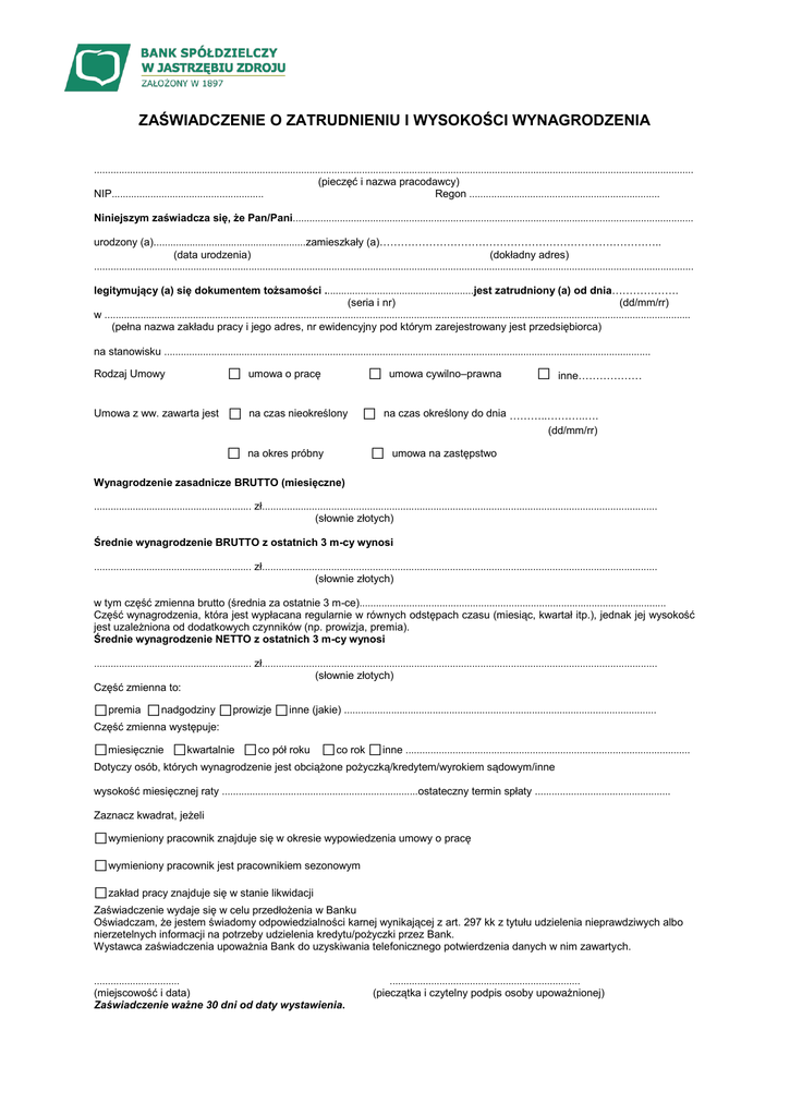 ZAŚWIADCZENIE O ZATRUDNIENIU I WYSOKOŚCI WYNAGRODZENIA ......................................................................................................................................................................................................................... NIP....................................................... (pieczęć i nazwa pracodawcy) Regon ..................................................................... Niniejszym zaświadcza się, że Pan/Pani................................................................................................................................................. urodzony (a).......................................................zamieszkały (a)…………………………………………………………………….. (data urodzenia) (dokładny adres) ......................................................................................................................................................................................................................... legitymujący (a) się dokumentem tożsamości ......................................................jest zatrudniony (a) od dnia………………. (seria i nr) (dd/mm/rr) w .................................................................................................................................................................................................................... (pełna nazwa zakładu pracy i jego adres, nr ewidencyjny pod którym zarejestrowany jest przedsiębiorca) na stanowisku ................................................................................................................................................................................ Rodzaj Umowy □ umowa o pracę □ umowa cywilno–prawna □ inne……………… Umowa z ww. zawarta jest □ na czas nieokreślony □ na czas określony do dnia ………..………..…. (dd/mm/rr) □ na okres próbny □ umowa na zastępstwo Wynagrodzenie zasadnicze BRUTTO (miesięczne) ......................................................... zł............................................................................................................................................... (słownie złotych) Średnie wynagrodzenie BRUTTO z ostatnich 3 m-cy wynosi ......................................................... zł............................................................................................................................................... (słownie złotych) w tym część zmienna brutto (średnia za ostatnie 3 m-ce)............................................................................................................... Część wynagrodzenia, która jest wypłacana regularnie w równych odstępach czasu (miesiąc, kwartał itp.), jednak jej wysokość jest uzależniona od dodatkowych czynników (np. prowizja, premia). Średnie wynagrodzenie NETTO z ostatnich 3 m-cy wynosi ......................................................... zł............................................................................................................................................... (słownie złotych) Część zmienna to: □premia □nadgodziny □prowizje □inne (jakie) ................................................................................................................. Część zmienna występuje: □miesięcznie □kwartalnie □co pół roku □co rok □inne ....................................................................................................... Dotyczy osób, których wynagrodzenie jest obciążone pożyczką/kredytem/wyrokiem sądowym/inne wysokość miesięcznej raty .......................................................................ostateczny termin spłaty ................................................. Zaznacz kwadrat, jeżeli □wymieniony pracownik znajduje się w okresie wypowiedzenia umowy o pracę □wymieniony pracownik jest pracownikiem sezonowym □zakład pracy znajduje się w stanie likwidacji Zaświadczenie wydaje się w celu przedłożenia w Banku Oświadczam, że jestem świadomy odpowiedzialności karnej wynikającej z art. 297 kk z tytułu udzielenia nieprawdziwych albo nierzetelnych informacji na potrzeby udzielenia kredytu/pożyczki przez Bank. Wystawca zaświadczenia upoważnia Bank do uzyskiwania telefonicznego potwierdzenia danych w nim zawartych. ............................... (miejscowość i data) Zaświadczenie ważne 30 dni od daty wystawienia. ..................................................................... (pieczątka i czytelny podpis osoby upoważnionej)