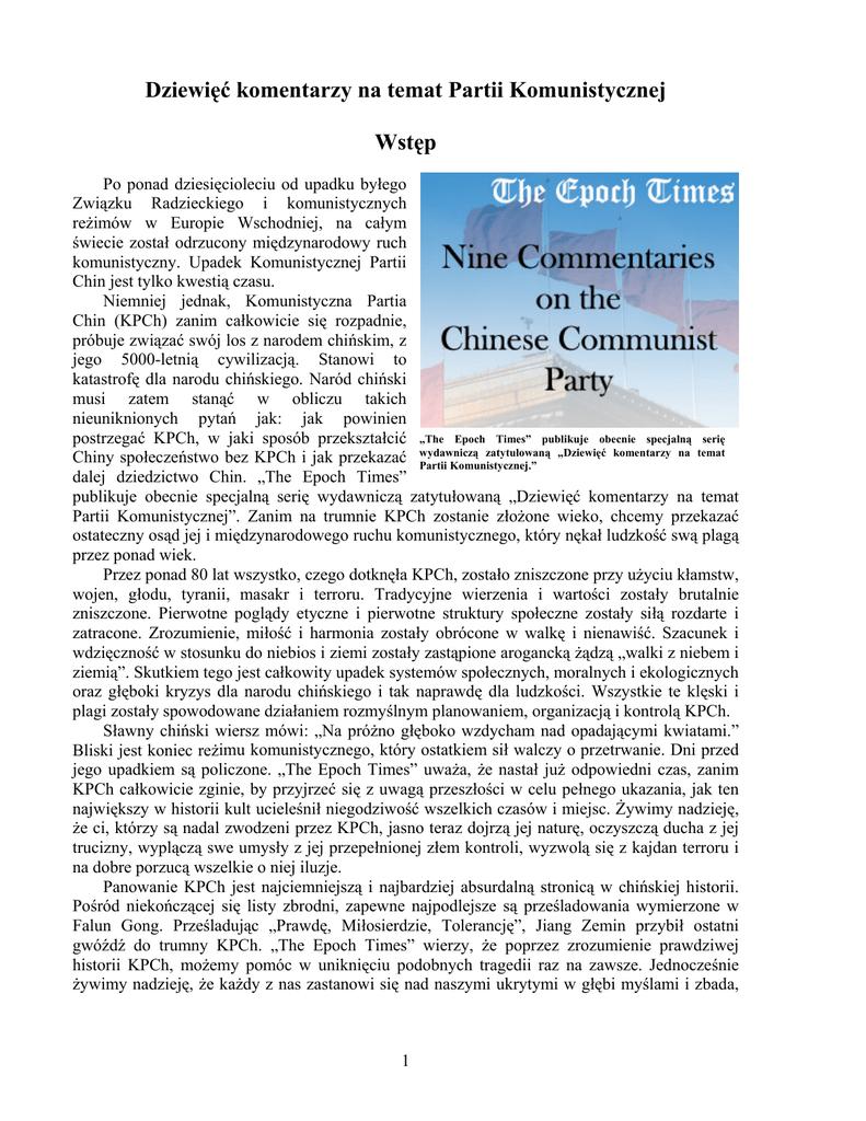 Dziewięć komentarzy na temat Partii Komunistycznej Wstęp Po ponad dziesięcioleciu od upadku byłego Związku Radzieckiego i komunistycznych reżimów w Europie Wschodniej, na całym świecie został odrzucony międzynarodowy ruch komunistyczny. Upadek Komunistycznej Partii Chin jest tylko kwestią czasu. Niemniej jednak, Komunistyczna Partia Chin (KPCh) zanim całkowicie się rozpadnie, próbuje związać swój los z narodem chińskim, z jego 5000-letnią cywilizacją. Stanowi to katastrofę dla narodu chińskiego. Naród chiński musi zatem stanąć w obliczu takich nieuniknionych pytań jak: jak powinien postrzegać KPCh, w jaki sposób przekształcić „The Epoch Times” publikuje obecnie specjalną serię zatytułowaną „Dziewięć komentarzy na temat Chiny społeczeństwo bez KPCh i jak przekazać wydawniczą Partii Komunistycznej.” dalej dziedzictwo Chin. „The Epoch Times” publikuje obecnie specjalną serię wydawniczą zatytułowaną „Dziewięć komentarzy na temat Partii Komunistycznej”. Zanim na trumnie KPCh zostanie złożone wieko, chcemy przekazać ostateczny osąd jej i międzynarodowego ruchu komunistycznego, który nękał ludzkość swą plagą przez ponad wiek. Przez ponad 80 lat wszystko, czego dotknęła KPCh, zostało zniszczone przy użyciu kłamstw, wojen, głodu, tyranii, masakr i terroru. Tradycyjne wierzenia i wartości zostały brutalnie zniszczone. Pierwotne poglądy etyczne i pierwotne struktury społeczne zostały siłą rozdarte i zatracone. Zrozumienie, miłość i harmonia zostały obrócone w walkę i nienawiść. Szacunek i wdzięczność w stosunku do niebios i ziemi zostały zastąpione arogancką żądzą „walki z niebem i ziemią”. Skutkiem tego jest całkowity upadek systemów społecznych, moralnych i ekologicznych oraz głęboki kryzys dla narodu chińskiego i tak naprawdę dla ludzkości. Wszystkie te klęski i plagi zostały spowodowane działaniem rozmyślnym planowaniem, organizacją i kontrolą KPCh. Sławny chiński wiersz mówi: „Na próżno głęboko wzdycham nad opadającymi kwiatami.” Bliski jest koniec reżimu komunistycznego, który ostatkiem sił walczy o przetrwanie. Dni przed jego upadkiem są policzone. „The Epoch Times” uważa, że nastał już odpowiedni czas, zanim KPCh całkowicie zginie, by przyjrzeć się z uwagą przeszłości w celu pełnego ukazania, jak ten największy w historii kult ucieleśnił niegodziwość wszelkich czasów i miejsc. Żywimy nadzieję, że ci, którzy są nadal zwodzeni przez KPCh, jasno teraz dojrzą jej naturę, oczyszczą ducha z jej trucizny, wyplączą swe umysły z jej przepełnionej złem kontroli, wyzwolą się z kajdan terroru i na dobre porzucą wszelkie o niej iluzje. Panowanie KPCh jest najciemniejszą i najbardziej absurdalną stronicą w chińskiej historii. Pośród niekończącej się listy zbrodni, zapewne najpodlejsze są prześladowania wymierzone w Falun Gong. Prześladując „Prawdę, Miłosierdzie, Tolerancję”, Jiang Zemin przybił ostatni gwóźdź do trumny KPCh. „The Epoch Times” wierzy, że poprzez zrozumienie prawdziwej historii KPCh, możemy pomóc w uniknięciu podobnych tragedii raz na zawsze. Jednocześnie żywimy nadzieję, że każdy z nas zastanowi się nad naszymi ukrytymi w głębi myślami i zbada, 1 czy nasze tchórzostwo i pójście na kompromis nie uczyniły z nas współwinnymi wielu tragedii, których można było uniknąć. Tytuły „Dziewięciu komentarzy na temat Partii Komunistycznej”: 1. Co to jest partia komunistyczna? 2. O początkach Komunistycznej Partii Chin 3. O tyranii Komunistycznej Partii Chin 4. O tym, jak Komunistyczna Partia Chin jest siłą sprzeciwiającą się wszechświatu 5. O zmowie Jiang Zemina z Komunistyczną Partią Chin, by prześladować Falun Gong 6. O tym, jak Komunistyczna Partia Chin zniszczyła tradycyjną kulturę 7. O historii mordowania przez Komunistyczną Partię Chin 8. O tym, jak Komunistyczna Partia Chin jest kultem zła 9. O pozbawionej skrupułów naturze Komunistycznej Partii Chin Zespół Redakcyjny „The Epoch Times” (Aktualizacja 06-07-2005) 2