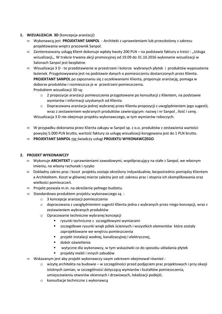 1. WIZUALIZACJA 3D (koncepcja aranżacji) • Wykonawcą jest PROJEKTANT SANPOL - Architekt z uprawnieniami lub przeszkolony z zakresu projektowania wnętrz pracownik Sanpol. • Zainteresowany usługą Klient dokonuje wpłaty kwoty 200 PLN – na podstawie faktury o treści : „Usługa wizualizacji„. W trakcie trwania akcji promocyjnej od 19.09 do 31.10.2016 wykonanie wizualizacji w Salonach Sanpol jest bezpłatne. • Wizualizacja 3 D - to przedstawienie w przestrzeni i kolorze wybranych płytek i produktów wyposażenia łazienek. Przygotowywana jest na podstawie danych o pomieszczeniu dostarczonych przez Klienta. PROJEKTANT SANPOL po zapoznaniu się z oczekiwaniami Klienta, proponuje aranżację, pomaga w doborze produktów i rozmieszcza je w przestrzeni pomieszczenia. Produktem wizualizacji 3D są: o 2 propozycje aranżacji pomieszczenia przygotowane po konsultacji z Klientem, na podstawie wymiarów i informacji uzyskanych od Klienta o Dopracowana aranżacja jednej wybranej przez Klienta propozycji z uwzględnieniem jego sugestii, wraz z zestawieniem wybranych produktów zawierającym: nazwę i nr Sanpol , ilość i cenę. Wizualizacja 3 D nie obejmuje projektu wykonawczego, w tym wymiarów roboczych. • • W przypadku dokonania przez Klienta zakupu w Sanpol sp. z o.o. produktów z zestawienia wartości powyżej 5.000 PLN brutto, wartość faktury za usługę wizualizacji korygowana jest do 1 PLN brutto. PROJEKTANT SANPOL nie świadczy usługi PROJEKTU WYKONAWCZEGO. 2. PROJEKT WYKONAWCZY • Wykonuje ARCHITEKT z uprawnieniami zawodowymi, współpracujący na stałe z Sanpol, we własnym imieniu, na własny rachunek i ryzyko • Dokładny zakres prac i koszt projektu zostaje określony indywidualnie, bezpośrednio pomiędzy Klientem a Architektem. Koszt w głównej mierze zależny jest od: zakresu prac i stopnia ich skomplikowania oraz wielkości pomieszczeń. • Projekt pozwala m.in. na określenie pełnego budżetu. • Standardowo produktem projektu wykonawczego są : o 3 koncepcje aranżacji pomieszczenia o dopracowana z uwzględnieniem sugestii Klienta jedna z wybranych przez niego koncepcji, wraz z zestawieniem wybranych produktów o Opracowanie techniczne wybranej koncepcji rysunki techniczne z szczegółowymi wymiarami szczegółowe rysunki wnęk półek ściennych i wszystkich elementów które zostały zaprojektowane we wnętrzu pomieszczenia projekt instalacji wodnej, kanalizacyjnej i elektrycznej, dobór oświetlenia wytyczne dla wykonawcy, w tym wskazówki co do sposobu układania płytek projekty mebli i innych zabudów • Wskazanym jest aby projekt wykonawczy swym zakresem obejmował również : o wizytę architekta na budowie – w szczególności przed podjęciem prac projektowych i przy okazji istotnych zamian, w szczególności dotyczącą wymiarów i kształtów pomieszczenia, umiejscowieniu otworów okiennych i drzwiowych, lokalizacji podejść. o konsultacje techniczne z wykonawcą