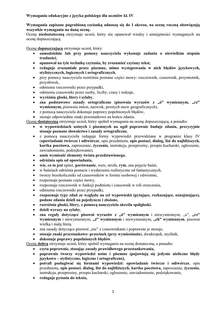 1 Wymagania edukacyjne z języka polskiego dla uczniów kl. IV