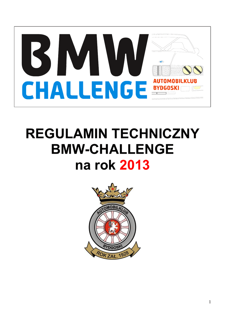 REGULAMIN TECHNICZNY BMW-CHALLENGE na rok 2013 1 Klasa pucharowa HOBBY (najniższe koszta): OPONY: Wszyscy uczestnicy klasy Hobby startują tylko i wyłącznie na jednym rodzaju opon, sprzedawanych przez firmę RT Sp. z o.o. Sp. k. właściciela www.RacingTires.pl, które są specjalnie oznakowane (opony bez oznakowania nie będą dopuszczane w cyklu). W 2013r. dopuszczone będą opony Federal 595 rozmiar 185/55 r15 (cena brutto sztuki 190zł). W awaryjnych sytuacjach dopuszcza się użycie 1 opony zapasowej innej niż przewidziana regulaminem. Cennik na 2013r. i dane kontaktowe do osoby zajmującej się sprzedażą opon znajdują się na stronie www.bmwchallenge.pl DOPUSZCZA SIĘ samochody: 1. Zgodne z regulaminem ramowym i uzupełniającym danej imprezy, przy której cykl jest klasyfikowany. 2. Marki BMW z napędem na tylną oś o pojemności do 2000 cm3 wolnossące, z wyłączeniem modelu M3, z silnikami pochodzącymi od BMW (bez instalacji nitro, turbo, kompresora lub innych układów podnoszących moc). 3. Dopuszczone do ruchu drogowego, posiadające ważne badanie techniczne oraz ubezpieczenie OC, a także samochody niezarejestrowane lub bez ważnego przeglądu lub OC pod warunkiem, że są wyposażone w klatkę bezpieczeństwa, min. 4 punktowe pasy bezpieczeństwa oraz sztywny fotel. Zaleca się montaż klatek bezpieczeństwa w specjalnie do tego przygotowanych warsztatach. Przy budowie klatki bezpieczeństwa zaleca się korzystanie z załącznika J FIA, który jest dostępny na stronie www.pzm.pl/samochody_regulaminy/rajdy oraz FIA. Jeśli klatka jest zamontowana to musi spełniać minimalne wymogi punktu „8.3.1 Konstrukcja bazowa” Załącznika J FIA oraz być zgodna z jednym z rysunków podanych w tym punkcie (rys. 253-1 lub 253-2 lub 253-3). Jeśli organizator uzna samochód za nieprawidłowo przygotowany, co mogłoby stwarzać niebezpieczeństwo (w tym klatkę bezpieczeństwa za wykonaną nieprawidłowo) może nie dopuścić samochodu do startu. 4. Z ograniczeniem maksymalnej mocy i momentu obrotowego w BMW serii 3 model E30, E36 Compact, Z3 oraz starszych do 145KM i 185NM, w pozostałych modelach BMW limit ten nie może przekroczyć 155KM i 200NM. Zamiast podawania wartości procentowej błędu pomiaru przyjmuje się możliwość 3 krotnego wykonania badania i branie pod uwagę pomiaru z najniższymi wynikami (jeśli zachodzi taka potrzeba). 5. Z odcięciem zapłonu przy obrotach zgodnych z seryjnie produkowanym modelem 6. Wyposażone w sprawne gniazdo diagnostyczne montowane seryjnie. 7. Wyposażone w sprawny: kolektor ssący, przepływomierz oraz przepustnicę seryjnie montowane w danym modelu i silniku. 8. Ze sztywnych dachem (niedopuszczone są modele o nadwoziu typu Cabrio). 9. Wyposażone w deskę rozdzielczą oraz boczne tapicerki drzwi. Boczne tapicerki drzwi można zastąpić innym elementem niepalnym. 10. Wyposażone w szyby i pokrycie nadwozia wykonane z oryginalnych materiałów. 11. Wyposażone w drzwi oraz wszystkie elementy karoserii seryjnej konstrukcji. 12. Wyposażone w tarcze oraz zaciski hamulcowe seryjnie montowane w danym modelu wraz z zamontowanym silnikiem (dopuszczone dodatkowo nacinane tarcze, oryginalnie wykonane przez producenta zamiennej części) 13. Wyposażone w jeden oryginalnie montowany sterownik silnika z jednym trybem pracy bez możliwości przełączania. 14. Wyposażone w części zamienne pochodzące z BMW lub przeznaczone przez producenta zamienników dla tej marki. 15. Z seryjnie montowaną w danym modelu ilością śrub mocujących koło (np. E30 – 4 śruby, E36 - 5śrub) 16. Wyposażone w maksymalnie jeden na danej osi seryjnie montowany stabilizator z danym silnikiem w danym modelu (w E30 z silnikiem M44 przyjmuje się stabilizatory dla silnika M42). ZABRANIA SIĘ: 1. Demontażu zderzaków (część z tworzywa sztucznego okrywająca zderzak nie jest traktowana jako zderzak!!!). 2. Używania urządzeń ogrzewających opony. 3. Przekładek silników z innych modeli czy też wersji nadwoziowych BMW. Wyjątkowo dopuszczony jest jednak montaż np. silnika 1,8 lub innej pojemności do karoserii od modelu 316, 320 czy tez innego z zachowaniem danej wersji nadwoziowej. Kolejny wyjątek stanowi możliwość montażu silnika m42 lub m44 wraz z osprzętem z modelu E36 do E30. Dozwolony jest montaż silników dostępnych w danym modelu bez względu na rok produkcji samochodu (przed i po liftingu). 4. Stosowania osprzętu silnika z wersji m-power. 5. Zmiany pojemności skokowej silników. 6. Stosowania amortyzatorów z dodatkowym zbiorniczkiem np. firmy Proflex, Ohlins itp. oraz montażu sprężyn i amortyzatorów w miejscach innych niż seryjne. 7. Stosowania amortyzatorów i sprężyn z jakimikolwiek regulacjami poza mechaniczną regulacją wysokości zawieszenia (talerz podtrzymujący sprężynę może być przekręcany kluczem w celu zwiększenia lub zmniejszenia prześwitu samochodu). Dodatkową regulację poziomu tłumienia (twardości amortyzatora), jednym seryjnie montowanym pokrętłem, wyjątkowo dopuszcza się w amortyzatorach KONI dostępnych powszechnie na rynku za max 600zł/1sztuka (nowy) w 3 różnych sklepach detalicznych. 8. Nawiercania konstrukcji samochodu oraz wycinania stałych elementów karoserii (poza przegrodą dzielącą bagażnik i kabinę pasażerską oraz szyberdachem) w celu obniżenia jego masy. 9. Demontażu przednich świateł mijania jak i tylnych lamp(reflektorów). 10. Stosowania paliwa innego niż powszechnie dostępne w dystrybutorach na stacji benzynowej. 11. Montowania dodatkowych (niemontowanych seryjnie w danym modelu) regulacji zbieżności oraz geometrii kół, (zezwala się jednak na stosowanie acentrycznych tulei mocujących wahacze) 12. Stosowania krótszych przełożeń dyferencjału niż 4,45 i montowania 6-biegowych skrzyń biegów (wyjątek to modele seryjnie wyposażone w takie skrzynie biegów). 13. Stosowania innych mocowań górnych amortyzatorów niż seryjne montowane (seryjne musz