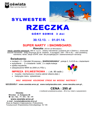 S Y LW E S T E R RZECZKA GÓRY SOWIE 3 dni 30.12.13. - 01.01.14. SUPER NARTY i SNOWBOARD: Rzeczka ( 90 km od Wrocławia ) stacja sportów zimowych 850 m n.p.m. , lokalny mikroklimat ( podobnie jak w Zieleńcu ), doskonałe warunki narciarskie , śnieg utrzymuje się do kwietnia , 5 wyciągów ( 300 - 700 m dł.) - stok oświetlony, naśnieżna, ratrak, stacja GOPR, stoki dla początkujących i zaawansowanych narciarzy. Świadczenia: noclegi x 2 – Ośrodek Wczasowy „ WARSZAWIANKA” pokoje 2, 3,4,5,6 os. z łazienkami wyżywienie - 2 x śniadanie bufet, 2 x ciepła kolacja opieka rezydenta, ubezpieczenie NNW do 2000 zł ( PZU ), IMPREZA SYLWESTROWA : ( ok. 90 osób ) muzyka mechaniczna ( można zabrać własne płyty ) tradycyjne menu sylwestrowe MILE WIDZIANE KOLOROWE STROJE NA WESOŁE NASTROJE ! SZCZEGÓŁY : www.oswiata.wroc.pl, www.nartyrzeczka.com , www.rzeczka.com.pl , CENA : 295 zł ( możliwość przedłużenia pobytu – 80 zł /os./ dzień z wyżywieniem) Oświata Wrocław ul. Kolejowa 36 tel. / fax. 71 372 – 52 – 91 www.oswiata.wroc.pl e–mail : [email protected] Wpis do Rejestru Organizatorów i Pośredników Turystycznych Województwa Dolnośląskiego Nr 145 Dodatkowe informacje : Zakwaterowanie : D.W. „WARSZAWIANKA „ duża sala balowa, sala kominkowa z TV i bufetem, kawiarenka, narciarnia Zakwaterowanie na podstawie skierowania i dowodu osobistego. Impreza sylwestrowa : realizowana na sali balowej Ośrodka przy muzyce mechanicznej Możliwości programowe : - narty i sanki w centrum narciarskim Rzeczka - Czechy – zakupy ( przejście graniczne Tłumaczów ok. 20km ) - rajd na Wielką Sowę - wieczory na nowoczesnym basenie w Słupcu lub Bielawie – „ Aqua Centrum „ - zwiedzanie kopalni węgla Nowa Ruda „ Piast „ ( przejażdżka kolejką górniczą, zwiedzanie z fabułą, spotkanie z duchem kopalni – Skarbnikiem ! ) Uwaga : uczestników obowiązuje regulamin Ośrodka, za stan pokoju odpowiada osoba pobierająca skierowanie. Istnieje możliwość płacenia w ratach Opłata rezerwacyjna - zaliczka 150 zł / os.) Rezerwacja miejsc : telefonicznie , e - mailem lub osobiście , Płatność na konto z dopiskiem Rzeczka : BZ WBK S.A. I O/ Wrocław 59 1090 2398 0000 0006 0800 0825 z dopiskiem : imię, nazwisko + nazwa miejscowości ! Biuro czynne : od poniedziałku do piątku w godz. 10.00 – 18.00 Życzymy Szampańskiej Zabawy !