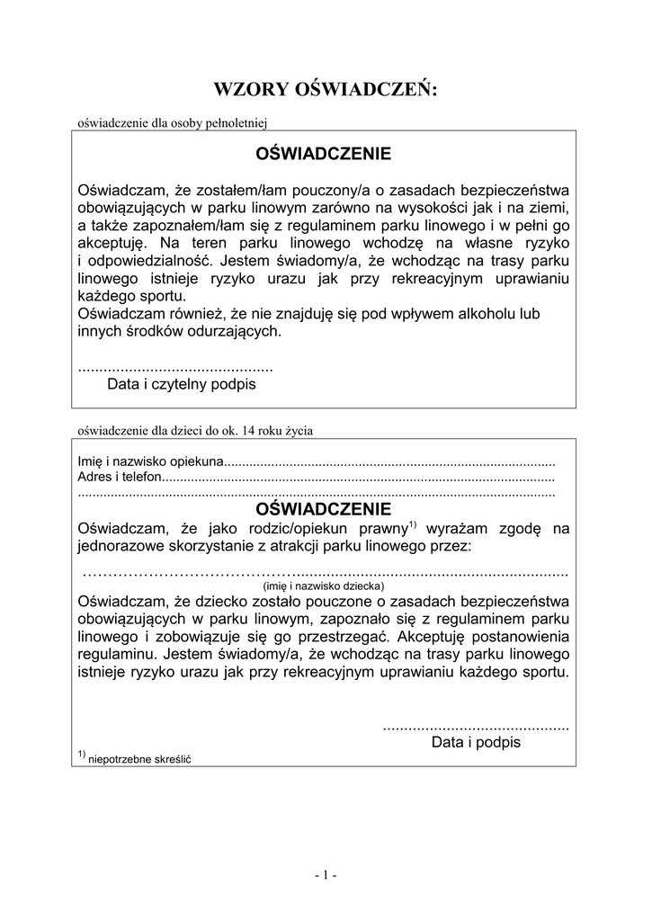WZORY OŚWIADCZEŃ: oświadczenie dla osoby pełnoletniej OŚWIADCZENIE Oświadczam, że zostałem/łam pouczony/a o zasadach bezpieczeństwa obowiązujących w parku linowym zarówno na wysokości jak i na ziemi, a także zapoznałem/łam się z regulaminem parku linowego i w pełni go akceptuję. Na teren parku linowego wchodzę na własne ryzyko i odpowiedzialność. Jestem świadomy/a, że wchodząc na trasy parku linowego istnieje ryzyko urazu jak przy rekreacyjnym uprawianiu każdego sportu. Oświadczam również, że nie znajduję się pod wpływem alkoholu lub innych środków odurzających. .............................................. Data i czytelny podpis oświadczenie dla dzieci do ok. 14 roku życia Imię i nazwisko opiekuna........................................................................................... Adres i telefon............................................................................................................ ................................................................................................................................... OŚWIADCZENIE Oświadczam, że jako rodzic/opiekun prawny1) wyrażam zgodę na jednorazowe skorzystanie z atrakcji parku linowego przez: ……………………………………................................................................ (imię i nazwisko dziecka) Oświadczam, że dziecko zostało pouczone o zasadach bezpieczeństwa obowiązujących w parku linowym, zapoznało się z regulaminem parku linowego i zobowiązuje się go przestrzegać. Akceptuję postanowienia regulaminu. Jestem świadomy/a, że wchodząc na trasy parku linowego istnieje ryzyko urazu jak przy rekreacyjnym uprawianiu każdego sportu. 1) ............................................ Data i podpis niepotrzebne skreślić -1- oświadczenie dla młodzieży od ok. 14 do 18 roku życia Imię i nazwisko opiekuna........................................................................................... Adres i telefon............................................................................................................ ................................................................................................................................... OŚWIADCZENIE Oświadczam, że jako rodzic/opiekun prawny1) zapoznałem/łam się ze sposobem funkcjonowania parku linowego. Wyrażam zgodę na jednorazowe skorzystanie z atrakcji parku linowego przez: ……………………………………................................................................ (imię i nazwisko dziecka) Oświadczam, że jestem świadomy/a, że wchodząc na trasy parku linowego istnieje ryzyko urazu jak przy rekreacyjnym uprawianiu każdego sportu. ............................................................... Data i czytelny podpis opiekuna Oświadczam, że zostałem/łam pouczony/a o zasadach bezpieczeństwa obowiązujących w parku linowym zarówno na wysokości jak i na ziemi, a także zapoznałem/łam się z regulaminem parku linowego i w pełni go akceptuję. Oświadczam również, że nie znajduję się pod wpływem alkoholu lub innych środków odurzających. ............................................................... Data i czytelny podpis klienta 1) niepotrzebne skreślić -2-