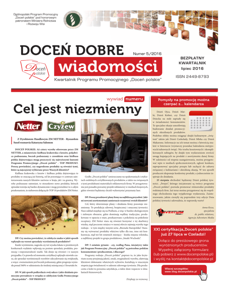 Ogólnopolski Program Promocyjny „Doceñ polskie” pod honorowym patronatem Ministra Rolnictwa i Rozwoju Wsi DOCEŃ DOBRE Numer 5/2016 BEZPŁATNY KWARTALNIK wiadomości lipiec 2016 Kwartalnik Programu Promocyjnego „Doceñ polskie” wywiad numeru Cel jest niezmienny Z Dyrektorem Handlowym ZM NETTER - Ryszardem Susoł rozmawia Katarzyna Salomon DOCEŃ POLSKIE: Aż cztery wyroby oferowane przez ZM NETTER, a mianowicie: kiełbasa krakowska z kresów, polędwica podsuszana, boczek podsuszany z czosnkiem oraz kiełbasa polska dojrzewająca mogą poszczycić się najwyższymi laurami Programu Promocyjnego „Doceń polskie” - TOP PRODUKT. Proszę powiedzieć, czy nagrodzone produkty są również tymi, które są najczęściej wybierane przez Waszych klientów? Kiełbasa krakowska z kresów i kiełbasa polska dojrzewająca to produkty ze znaczącą już historią, od lat pozostające w centrum zainteresowania naszych klientów zarówno w kraju, jak i za granicą. Wyroby podsuszane natomiast, to stosunkowo nowe produkty, których sprzedaż rozwija się bardzo dynamicznie i mogę powiedzieć to z całym przekonaniem, że niebawem dołączą do TOP 10 produktów ZM Netter. DP: Czy można powiedzieć, że zdobycie znaku w jakiś sposób wpłynęło na wzrost sprzedaży wyróżnionych produktów? Każde wyróżnienie, nagroda czy też wysoka lokata w prestiżowych konkursach wydatnie wpływają na poziom sprzedaży produktu, promocję i rozpoznawalność marki. Tak dzieje się również i w naszym przypadku. Co prawda od momentu certyfikacji upłynęło niewiele czasu, ale sprzedaż wyróżnionych wyrobów zdecydowanie się zwiększyła, a wręcz ewenementem jest boczek podsuszany, gdzie progresja wyniosła ponad 360% w odniesieniu do średniej miesięcznej z I kwartału br. DP: W jaki sposób podkreślacie swój sukces i jakie działania promocyjne prowadzicie w związku ze zdobyciem Godła Promocyjnego „Doceń polskie” – TOP PRODUKT? Godło „Doceń polskie” umieszczamy na opakowaniach i etykietach ozdobnych certyfikowanych produktów, a także na związanych z tymi produktami materiałach reklamowych firmy. W przygotowaniu jest ponadto poważny projekt reklamowy w mediach krajowych, gdzie również będziemy chcieli wykorzystać przyznany laur. DP: Proszę przedstawić plany firmy na najbliższą przyszłość. Jakimi nowymi asortymentami zamierzacie oczarować swoich klientów? Cel, który determinuje plany i działania firmy pozostaje niezmienny. To produkcja zdrowej, bezpiecznej i smacznej żywności. Nasz zakład znajduje się na Podlasiu, a więc w bardzo ekologicznym i zielonym obszarze, gdzie dominują wędliny tradycyjne, produkowane w oparciu o stare, przekazywane z pokolenia na pokolenie receptury. ZM Netter stara się również korzystać z tej skarbnicy wiedzy, stąd poczesne miejsce w naszej ofercie zajmują wyroby tego rodzaju - w tym między innymi seria „Biesiada Staropolska”. Staramy się wytwarzać produkty właściwe tylko dla nas, inne niż konkurencja, stąd też hit ostatnich miesięcy - kiszka mięsna wileńska, a najbliższy projekt to grupa produktowa „Smaki Wschodu”. DP: I ostatnie pytanie - czy, według Pana, inicjatywy takie jak Program Promocyjny „Doceń polskie” są potrzebne polskim konsumentom i producentom, i dlaczego? Programy rodzaju „Doceń polskie” poprzez to, że jako kryterium oceny przyjmują jakość, smak, oryginalność wyrobu, ułatwiają klientowi dokonanie właściwych wyborów, kształtują w znacznym stopniu jego świadomość w zakresie zdrowego żywienia. Dla producenta z kolei to poważna satysfakcja, a także duże wsparcie w działaniach biznesowych. Dziękuję za rozmowę. ISSN 2449-8793 Pomysły na promocję można czerpać z... kalendarza Dzień Ojca, Dzień Matki, Dzień Kobiet, czy Dzień Dziecka na stałe zapisały się w świadomości konsumentów. Te specjalne okazje umożliwiają budowanie działań promocyjnych określonych produktów. Podobne efekty można osiągnąć dzięki kulinarnym „świętom” takim jak Dzień Czekolady, Dzień Mleka czy Dzień Makaronu. Informacje na ich temat można z łatwością znaleźć w Internecie (wystarczy poszukać kalendarza nietypowych/zabawnych świąt). Nie trzeba kosztownych i skomplikowanych zabiegów, by dzięki tym wydarzeniom zwrócić uwagę kupujących na produkt z asortymentu danej firmy. W zależności od stopnia zaangażowania, można przygotować wpis w mediach społecznościowych, ogłosić konkurs, zaproponować specjalny przepis lub zachęcić do zabawy związanej z kulinariami i określoną okazją. W ten sposób producent eksponuje konkretny produkt, a jednocześnie inspiruje do działania. 25 sierpnia obchodzić będziemy Dzień polskiej żywności. „Święto”, którego inicjatorami są twórcy programu „Doceń polskie”, pozwala promować różnorodne produkty rodzimych firm. Już teraz można przygotować się do wspólnego obchodzenia tego wyjątkowego wydarzenia. Zainteresowanie, jakim cieszyły się poprzednie trzy edycje Dnia polskiej żywności udowadnia, że naprawdę warto! Anna Koza, specjalista ds. public relations, Agencja Adventure Media XXI certyfikacja„Doceń polskie” już 27 lipca w Czeladzi! Dołącz do presiżowego grona wyróżnionych producentów. Wypełnij załączony formularz (lub pobierz z www.docenpolskie.pl) i wyślij na [email protected] Więcej szczegółów: www.blog.docenpolskie.pl 2 DOCEŃ DOBRE wiadomości Rekomendacja Doceń polskie w pigułce Dla kogo i po co? Program „Doceń polskie” ma na celu promocję wysokiej jakości produktów dostępnych na polskim rynku oraz posiadających „polski akcent”. Skierowany jest do producentów dóbr konsumpcyjnych ze szczególnym naciskiem na produkty FMCG (produkty/ dobra szybko zbywalne). Uczestnictwo w programie „Doceń polskie” gwarantuje producentowi szerokie wsparcie promocyjne na różnych płaszczyznach i za pośrednictwem różnych nośników 