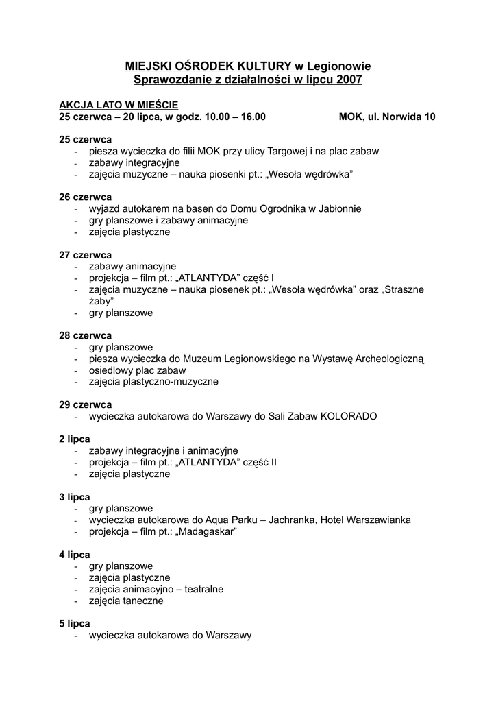 MIEJSKI OŚRODEK KULTURY w Legionowie Sprawozdanie z działalności w lipcu 2007 AKCJA LATO W MIEŚCIE 25 czerwca – 20 lipca, w godz. 10.00 – 16.00 MOK, ul. Norwida 10 25 czerwca - piesza wycieczka do filii MOK przy ulicy Targowej i na plac zabaw - zabawy integracyjne - zajęcia muzyczne – nauka piosenki pt.: „Wesoła wędrówka” 26 czerwca - wyjazd autokarem na basen do Domu Ogrodnika w Jabłonnie - gry planszowe i zabawy animacyjne - zajęcia plastyczne 27 czerwca - zabawy animacyjne - projekcja – film pt.: „ATLANTYDA” część I - zajęcia muzyczne – nauka piosenek pt.: „Wesoła wędrówka” oraz „Straszne żaby” - gry planszowe 28 czerwca - gry planszowe - piesza wycieczka do Muzeum Legionowskiego na Wystawę Archeologiczną - osiedlowy plac zabaw - zajęcia plastyczno-muzyczne 29 czerwca - wycieczka autokarowa do Warszawy do Sali Zabaw KOLORADO 2 lipca - zabawy integracyjne i animacyjne - projekcja – film pt.: „ATLANTYDA” część II - zajęcia plastyczne 3 lipca - gry planszowe - wycieczka autokarowa do Aqua Parku – Jachranka, Hotel Warszawianka - projekcja – film pt.: „Madagaskar” 4 lipca - gry planszowe - zajęcia plastyczne - zajęcia animacyjno – teatralne - zajęcia taneczne 5 lipca - wycieczka autokarowa do Warszawy ● Muzeum Geologiczne – wystawa dinozaurów i zwierząt drapieżnych ● interaktywna wystawa komunikacji ● panorama Warszawy - XXX piętro Pałacu Kultury i Nauki 6 lipca - gry planszowe - zajęcia plastyczne - projekcja – film pt.: „Pinokio” - zajęcia taneczne 9 lipca - zabawy integracyjne i animacyjne - osiedlowy plac zabaw - projekacja – film pt.: „Zorro” - zajęcia plastyczne 10 lipca - wycieczka autokarowa do Warszawy ● Kino CINEMA CITY – film pt.: “Shrek 3” ● kręgielnia 11 lipca - gry planszowe - zajęcia plastyczne - osiedlowy plac zabaw - zajęcia taneczne 12 lipca - wycieczka autokarowa do PEPELANDU w Łomiankach ● plac zabaw MAŁPI GAJ ● Mini ZOO ● zwiedzanie czołgu i helikoptera ● przejażdżka samochodem wojskowym ● sala zabaw ● ognisko z kiełbaskami 13 lipca - - projekcja – film pt.: „Opowieści z Narnii” osiedlowy plac zabaw zajęcia plastyczne 16 lipca - zabawy integracyjne i animacyjne - warsztaty plastyczne - projekcja – film pt.: „EKSPRESS POLARNY” - zajęcia muzyczne – nauka piosenki pt.:”Strażacki walc” 17 lipca - Wycieczka autokarowa do Portu Pilawa ● rejs tramwajem wodnym ● Mini ZOO ● gry i zabawy na świeżym powietrzu ● ognisko z kiełbaskami 18 lipca - zajęcia muzyczne – śpiewanie piosenek nauczonych podczas Akcji - nagranie płyty z przygotowanego materiału muzycznego - osiedlowy plac zabaw - projekcja – film pt.: ”Iniemamocni” - kąpiel w baseniku na terenie MOK 19 lipca - zajęcia plastyczne - wycieczka autokarowa do Aqua Parku – Jachranka, Hotel Warszawianka 20 lipca - wycieczka autokarowa do warszawskiego ZOO - zakończenie akcji LATO W MIEŚCIE Z oferty akcji LATO W MIEŚCIE tygodniowo skorzystało średnio 200 osób. 14 lipca, godz. 18.00 Impreza plenerowa - koncert zespołu KOMETY - dyskoteka Park przy ul. Handlowej 15 lipca, godz. 12.00 MOK, ul. Targowa 65 Koncert fortepianowy w wykonaniu Pawła Jankowskiego w ramach cyklicznych niedzielnych koncertów w Salonie Artystycznym im. Fryderyka Chopina 28 lipca, godz. 18.00 Impreza plenerowa - koncert zespołu DE FACTO - dyskoteka Osiedle Piaski ul. Długa 29 lipca, godz. 12.00 MOK, ul. Targowa 65 Koncert fortepianowy w wykonaniu Pawła Jankowskiego w ramach cyklicznych niedzielnych koncertów w Salonie Artystycznym im. Fryderyka Chopina