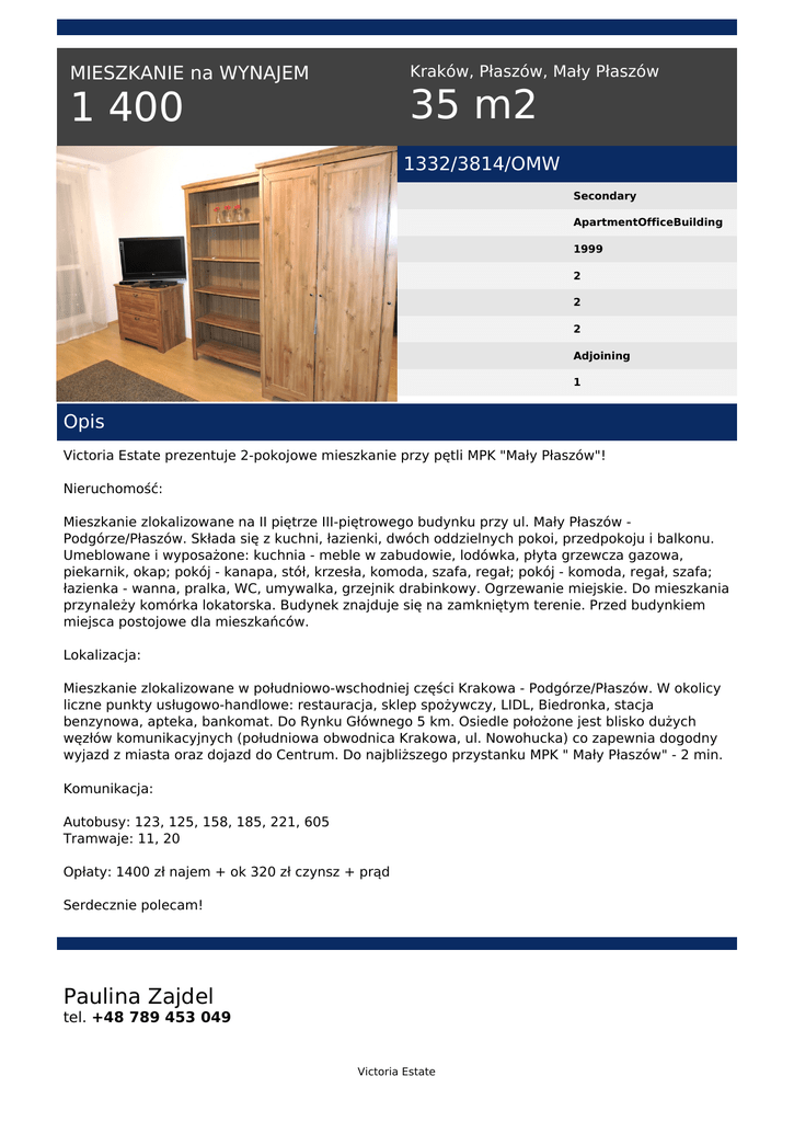 Kraków, Płaszów, Mały Płaszów MIESZKANIE na WYNAJEM 35 m2 1 400 1332/3814/OMW Secondary ApartmentOfficeBuilding 1999 2 2 2 Adjoining 1 Opis Victoria Estate prezentuje 2-pokojowe mieszkanie przy pętli MPK "Mały Płaszów"! Nieruchomość: Mieszkanie zlokalizowane na II piętrze III-piętrowego budynku przy ul. Mały Płaszów Podgórze/Płaszów. Składa się z kuchni, łazienki, dwóch oddzielnych pokoi, przedpokoju i balkonu. Umeblowane i wyposażone: kuchnia - meble w zabudowie, lodówka, płyta grzewcza gazowa, piekarnik, okap; pokój - kanapa, stół, krzesła, komoda, szafa, regał; pokój - komoda, regał, szafa; łazienka - wanna, pralka, WC, umywalka, grzejnik drabinkowy. Ogrzewanie miejskie. Do mieszkania przynależy komórka lokatorska. Budynek znajduje się na zamkniętym terenie. Przed budynkiem miejsca postojowe dla mieszkańców. Lokalizacja: Mieszkanie zlokalizowane w południowo-wschodniej części Krakowa - Podgórze/Płaszów. W okolicy liczne punkty usługowo-handlowe: restauracja, sklep spożywczy, LIDL, Biedronka, stacja benzynowa, apteka, bankomat. Do Rynku Głównego 5 km. Osiedle położone jest blisko dużych węzłów komunikacyjnych (południowa obwodnica Krakowa, ul. Nowohucka) co zapewnia dogodny wyjazd z miasta oraz dojazd do Centrum. Do najbliższego przystanku MPK " Mały Płaszów" - 2 min. Komunikacja: Autobusy: 123, 125, 158, 185, 221, 605 Tramwaje: 11, 20 Opłaty: 1400 zł najem + ok 320 zł czynsz + prąd Serdecznie polecam! Paulina Zajdel tel. +48 789 453 049 Victoria Estate email: [email protected] Victoria Estate Powered by TCPDF (www.tcpdf.org)