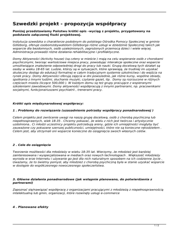 Szwedzki projekt - propozycja współpracy Poniżej przedstawiamy Państwu krótki opis –wyciąg z projektu, przygotowany na podstawie załączonej fiszki projektowej. Instytucja szwedzka o charakterze podobnym do polskiego Ośrodka Pomocy Społecznej w gminie Göteborg, oferuje osobom/obywatelom Göteborga różne usługi w dziedzinie Społecznej takich jak wsparcie dla bezdomnych, osób uzależnionych, zagrożonych przemocą dzieci i wiele więcej. Administracja prowadzi różne działania rehabilitacyjne i profilaktyczne. Domy Aktywności (Activity house) (są cztery w mieście ) mają na celu wspieranie osób z chorobami psychicznymi, tworząc wartościowe miejsca pracy, powodując interakcje społeczne oraz wsparcie umożliwiające znalezienie odpowiedniej drogi do pracy lub nauki. Grupą docelową tych działań są osoby w wieku 18-65 lat. Ludzie, którzy są w sytuacjach, które sprawiają, że trudniej im uzyskać skuteczny dostęp do edukacji formalnej w całym tradycyjnym systemie szkolnictwa i do wejścia na rynek pracy. Domy Aktywności oferują zajęcia w dni powszednie, jak różne kursy, wspólne obiady, spotkania z innymi ludźmi, słuchanie muzyki, czytanie gazet, itp. Domy są rozrzucone w różnych częściach miasta (liczące 500,000 ). W każdym domu są też grupy pracujące z wspieranymi szkoleniami zawodowymi. Domy aktywności współpracują z innymi partnerami, np. pracownikami socjalnymi, funkcjonariuszami psychiatrii , trenerami pracy. Krótki opis międzynarodowej współpracy: 1 . Problemy do rozwiązania (uzasadnienie potrzeby współpracy ponadnarodowej ) Celem projektu jest zwrócenie uwagi na naszą grupę docelową, osób z chorobą psychiczną lub niepełnosprawnych, wiek 18-35 . Chcemy pokazać, że wielu z nich jest twórcza i artystycznie uzdolniona.. Ci młodzi uczestnicy projektu potrzebują areny, gdzie ich umiejętności mogłyby być zauważone czy pokazane szerszej publiczności, umiejętności, które nie są konieczne rękodziełem . Celem jest, aby otrzymali oni wsparcie konieczne do osiągnięcia swoich własnych celów. 2 . Cele do osiągnięcia Tworzenie możliwości dla młodzieży w wieku 18-35 lat. Wierzymy, że młodzież jest bardziej zainteresowana i wyspecjalizowana w mediach oraz nowych technologiach . Większość młodzieży wyrosła w erze Internetu i używanie go jest dla nich naturalnym sposobem na ich codzienne życie . Uważamy, że to świetny pomysł, aby młodzież z chorobą psychiczną była w stanie uzyskać wsparcie w dostępie do współczesnego nowoczesnego społeczeństwa. 3. Główne działania ponadnarodowe (jak wstępnie planowano, do potwierdzenia z partnerami) Zapoznać się/nawiązać współpracę z organizacjami pracującymi z młodzieżą z niepełnosprawnością intelektualną lub gmin, organizacji, które rozwinęły usługi e-commerce 4 . Planowane efekty 1/2 Znalezienie organizacji do współpracy z innymi projektami, tworzenia kontaktów. Uczenie się od innych na temat pracy z ludźmi w grupach : 1) e-commerce, 2) tworzenia rękodzieła, 3) sprzedaży produktów, 4) Kolejny krok ( bliżej do pracy ), a także zapoznanie się metodami ich pracy . Wymiana informacji i doświadczeń. Instytucje zainteresowane współpracą ponadnarodową w ramach projektu proszę o kontakt z Zespołem ds. projektów innowacyjnych i projektów współpracy ponadnarodowej w ramach PO KL. E-mail: [email protected] 2/2