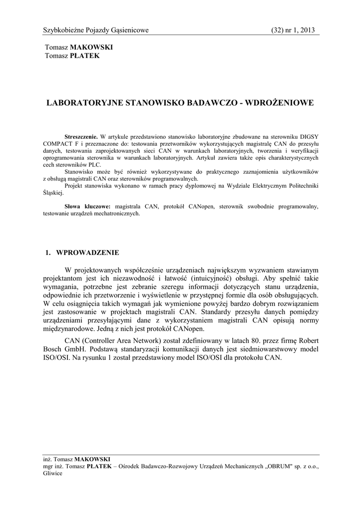 Szybkobieżne Pojazdy Gąsienicowe (32) nr 1, 2013 Tomasz MAKOWSKI Tomasz PŁATEK LABORATORYJNE STANOWISKO BADAWCZO - WDROŻENIOWE Streszczenie. W artykule przedstawiono stanowisko laboratoryjne zbudowane na sterowniku DIGSY COMPACT F i przeznaczone do: testowania przetworników wykorzystujących magistralę CAN do przesyłu danych, testowania zaprojektowanych sieci CAN w warunkach laboratoryjnych, tworzenia i weryfikacji oprogramowania sterownika w warunkach laboratoryjnych. Artykuł zawiera także opis charakterystycznych cech sterowników PLC. Stanowisko może być również wykorzystywane do praktycznego zaznajomienia użytkowników z obsługą magistrali CAN oraz sterowników programowalnych. Projekt stanowiska wykonano w ramach pracy dyplomowej na Wydziale Elektrycznym Politechniki Śląskiej. Słowa kluczowe: magistrala CAN, protokół CANopen, sterownik swobodnie programowalny, testowanie urządzeń mechatronicznych. 1. WPROWADZENIE W projektowanych współcześnie urządzeniach największym wyzwaniem stawianym projektantom jest ich niezawodność i łatwość (intuicyjność) obsługi. Aby spełnić takie wymagania, potrzebne jest zebranie szeregu informacji dotyczących stanu urządzenia, odpowiednie ich przetworzenie i wyświetlenie w przystępnej formie dla osób obsługujących. W celu osiągnięcia takich wymagań jak wymienione powyżej bardzo dobrym rozwiązaniem jest zastosowanie w projektach magistrali CAN. Standardy przesyłu danych pomiędzy urządzeniami przesyłającymi dane z wykorzystaniem magistrali CAN opisują normy międzynarodowe. Jedną z nich jest protokół CANopen. CAN (Controller Area Network) został zdefiniowany w latach 80. przez firmę Robert Bosch GmbH. Podstawą standaryzacji komunikacji danych jest siedmiowarstwowy model ISO/OSI. Na rysunku 1 został przedstawiony model ISO/OSI dla protokołu CAN. inż. Tomasz MAKOWSKI mgr inż. Tomasz PŁATEK – Ośrodek Badawczo-Rozwojowy Urządzeń Mechanicznych „OBRUM" sp. z o.o., Gliwice Tomasz MAKOWSKI, Tomasz PŁATEK Rys. 1. Model ISO/OSI dla protokołu CAN W protokole CAN FAST [3] wymiana danych odbywa się szeregowo na pojedynczej parze skrętnej z dopasowaniem falowym realizowanym poprzez terminację skrętki. Ramka komunikatu CAN posiada identyfikator nadawcy, lecz brak jest pola adresu odbiorcy wiadomości. Każde urządzenie CAN może więc śledzić cały ruch na magistrali i decydować, czy wiadomość jest dla niego interesująca, czy też nie. Każdy komunikat jest identyfikowany przez bity w ramce arbitrażu, które również określają priorytet wiadomości. Najwyższy priorytet ma ramka o najmniejszej wartości w polu arbitracji. Ramka protokołu CANopen została przedstawiona na rysunku 2, pole arbitrażu zawiera różną ilość bitów w zależności czy jest to ramka w wersji podstawowej (2.0A), czy rozszerzonej (2.0B). SOF 1 ARBITRATION 12/32 CONTROL 6 DATA 0-64 CRC 16 ACK 2 EOF 7 Rys. 2. Ramka protokołu CANOpen Objaśnienie pól ramki: SOF – początek ramki, Arbitration – pole arbitrażu zawiera w sobie identyfikator, Control – pole kontrolne zawierające informację o strukturze ramki danych, Data – pole danych, CRC – pole sumy kontrolnej, zabezpieczające transmitowane dane przed błędami, ACK – pole potwierdzenia poprawności odebranych danych, EOF – koniec ramki. Modułowe stanowisko diagnostyczne Najważniejszą cechą magistrali CAN jest odporność na błędy. Urządzenia charakteryzują się: zmniejszoną podatnością elektromagnetyczną (EMS) dzięki zastosowaniu różnicowej transmisji bitów, tak że suma napięć na przewodach (lub różnica zmian napięć) jest zawsze stała, zwiększoną odpornością na wyładowania elektrostatyczne, odpowiednio dużym tłumieniem sygnału współbieżnego (CMR), brakiem wprowadzania przez urządzenia zakłóceń w przypadku włączenia do działającej sieci, niezależnie od tego, czy są zasilane czy nie, możliwość zastosowania trzeciego przewodu (lub ekranu) w celu likwidacji zakłóceń zewnętrznych. Ponadto ramki CAN cechują się: posiadaniem sumy kontrolnej CRC-15. Według matematycznych obliczeń jeden przekłamany bit może zostać nie wykryty raz na 1000 lat ciągłej pracy magistrali (prawdopodobieństwo niewykrycia wynosi 10-11), na magistrali pojawiają się sygnały tylko z jednego węzła sieci (po arbitrażu); on sam powinien „słyszeć” swoje sygnały; niezgodność świadczy o błędnej transmisji, każde 5 kolejnych bitów o jednakowej wartości jest poprzedzone bitem komplementarnym (oprócz pola EOF); jeżeli sterownik odbiera więcej niż 5 bitów o jednakowej wartości, to jest to traktowane jako błąd, odbiornik sprzętowo realizuje kontrolę sumy, brak nadpisania bitu przerwy ACK jest traktowane przez nadajnik jako brak odbioru komunikatu przez inne węzły magistrali, kontrola stanu niektórych pól w ramce, które mają określoną wartość (ogranicznik CRC, ogranicznik ACK, pole EOF – bity recesywne). 2. CECHY CHARAKTERYSTYCZNE STEROWNIKÓW PLC Sterowniki PLC (Sterownik swobodnie programowalny - ang. Programmable Logic Controller) wprowadzono do użycia w układach sterowania i regulacji w celu zastąpienia jednym urządzeniem sztywno połączonych układów setek lub więcej przekaźników w szafach sterowniczych. Najistotniejszą cechą charakterystyczną PLC jest możliwość programowania w językach wyższego rzędu (IEC1131). Umożliwia to konfigurowanie odpowiednich wejść/wyjść sterownika PLC w zależności od potrzeb danego projektu, dając inżynierom dużą swobodę projektową. Do konfigurowanych układów zaliczamy: układy wejściowe, układy wyjściowe, liczniki, makra (podprogramy), timery i rejestry. Natomiast niekonieczna jest w tym przypadku znajomość rzeczywistej architektury sterownika. Drugą cechą sterowników programowalnych jest cykliczny obieg pamięci programu. Po starcie i inicjalizacji, sterownik przechodzi do podstawowego cyklu pracy. Cykl ten ro