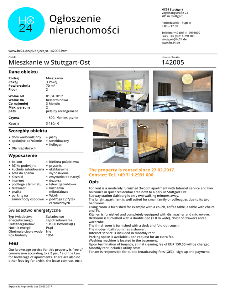 Ogłoszenie nieruchomości HC24 Stuttgart Vogelsangstraße 23 70176 Stuttgart Poniedziałek – Piątek: 9.00 – 17.00 Telefon: +49 (0)711-2991000 Faks: +49 (0)711-291188 [email protected] www.hc24.de www.hc24.de/pl/object_st-142005.htm Obiekt Numer obiektu Mieszkanie w Stuttgart-Ost 142005 Dane obiektu Rodzaj Pokój Powierzchnia Floor Mieszkania 3 Pokój 70 m² 2 Wolne od Wolne do Co najmniej Max. persons pets 01.04.2017 bezterminowo 3 Months 2 pets by arrangement Czynsz 1 590,- €/miesięcznie Kaucja 3 180,- € Szczegóły obiektu dom wielorodzinny spokojne po?o?enie jasny umeblowany Kollegen Dla niepalacych Wyposażenie balkon ?ó?ko podwójne kuchnia zabudowana sofa do spania r?czniki internet pod?oga z laminatu telewizor pralka parking na samochody osobowe bielizna po?cielowa prysznic ekskluzywne wyposa?enie zmywarka do naczy? dozorca telewizja kablowa kuchenka mikrofalowa WLAN pod?oga z p?ytek ceramicznych Świadectwo energetyczne Typ świadectwa energetycznego Sluttenergibehov Nośnik energii Obejmuje ciepłą wodę Rok budowy Świadectwo zapotrzebowania 131,00 kWh/m²a(E) Prąd Nie 1964 Fees Our brokerage service for this property is free of commission according to § 2 par. 1a of the Law for brokerage of apartments. There are also no other fees (eg for a visit, the lease contract, etc.). Exposição imprimida aos 03.03.2017 Powered by TCPDF (www.tcpdf.org) The property is rented since 27.02.2017. Contact: Tel. +49 711 2991 000 Opis For rent is a modernly furnished 3-room apartment with Internet service and two balconies in quiet residential area next to a park in Stuttgart Ost. Subway station Gaisburg is only two walking minutes away. The bright apartment is well suited for small family or colleagues due to its two bedrooms. Living room is furnished for example with a couch, coffee table, a table with chairs and TV. Kitchen is furnished and completely equipped with dishwasher and microwave. Bedroom is furnished with a double bed (1.8 m wide), chest of drawers and a wardrobe. The third room is furnished with a desk and fold-out couch. The modern bathroom has a shower. Internet service is included in monthly rent. Parking space is available upon request for an extra fee. Washing machine is located in the basement. Upon termination of tenancy, a final cleaning fee of EUR 150.00 will be charged. Monthly rent includes utility costs. Tenant is responsible for public broadcasting fees (GEZ) - sign-up and payment.
