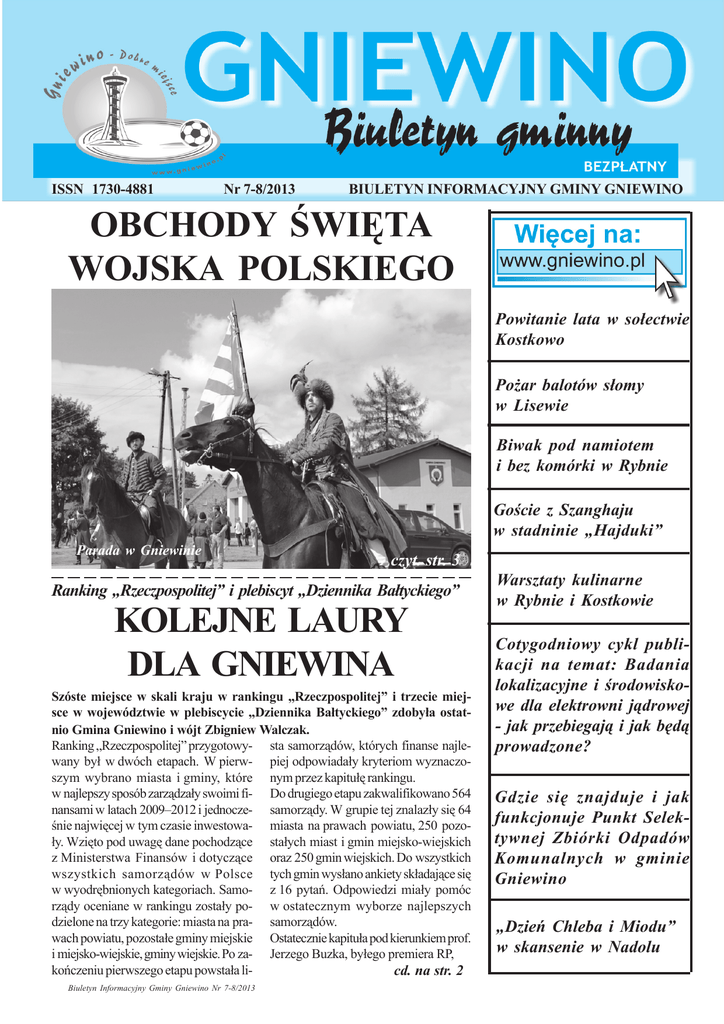 ISSN 1730-4881 Nr 7-8/2013 BIULETYN INFORMACYJNY GMINY GNIEWINO OBCHODY ŒWIÊTA WOJSKA POLSKIEGO Powitanie lata w so³ectwie Kostkowo Po¿ar balotów s³omy w Lisewie Biwak pod namiotem i bez komórki w Rybnie Parada w Gniewinie czyt. str. 2-3 czyt. str. 3 Ranking „Rzeczpospolitej” i plebiscyt „Dziennikaczyt. Ba³tyckiego” str. 3 KOLEJNE LAURY DLA GNIEWINA Szóste miejsce w skali kraju w rankingu „Rzeczpospolitej” i trzecie miejsce w województwie w plebiscycie „Dziennika Ba³tyckiego” zdoby³a ostatnio Gmina Gniewino i wójt Zbigniew Walczak. Ranking „Rzeczpospolitej” przygotowy- sta samorz¹dów, których finanse najlewany by³ w dwóch etapach. W pierw- piej odpowiada³y kryteriom wyznaczoszym wybrano miasta i gminy, które nym przez kapitu³ê rankingu. w najlepszy sposób zarz¹dza³y swoimi fi- Do drugiego etapu zakwalifikowano 564 nansami w latach 2009–2012 i jednocze- samorz¹dy. W grupie tej znalaz³y siê 64 œnie najwiêcej w tym czasie inwestowa- miasta na prawach powiatu, 250 pozo³y. Wziêto pod uwagê dane pochodz¹ce sta³ych miast i gmin miejsko-wiejskich z Ministerstwa Finansów i dotycz¹ce oraz 250 gmin wiejskich. Do wszystkich wszystkich samorz¹dów w Polsce tych gmin wys³ano ankiety sk³adaj¹ce siê w wyodrêbnionych kategoriach. Samo- z 16 pytañ. Odpowiedzi mia³y pomóc rz¹dy oceniane w rankingu zosta³y po- w ostatecznym wyborze najlepszych dzielone na trzy kategorie: miasta na pra- samorz¹dów. wach powiatu, pozosta³e gminy miejskie Ostatecznie kapitu³a pod kierunkiem prof. str.RP, 4 i miejsko-wiejskie, gminy wiejskie. Po za- Jerzego Buzka, by³egoczyt. premiera koñczeniu pierwszego etapu powsta³a licd. na str. 2 Biuletyn Informacyjny Gminy Gniewino Nr 7-8/2013 Goœcie z Szanghaju w stadninie „Hajduki” Warsztaty kulinarne w Rybnie i Kostkowie Cotygodniowy cykl publikacji na temat: Badania lokalizacyjne i œrodowiskowe dla elektrowni j¹drowej - jak przebiegaj¹ i jak bêd¹ prowadzone? Gdzie siê znajduje i jak funkcjonuje Punkt Selektywnej Zbiórki Odpadów Komunalnych w gminie Gniewino „Dzieñ Chleba i Miodu” w skansenie w Nadolu Dobre miejsce LAURY DLA GNIEWINA dok. ze str. 1 a obecnie pos³a do Parlamentu Europejskiego, og³osi³a wyniki rankingu, w którym Gmina Gniewino uplasowa³a siê na 6 miejscu wœród gmin wiejskich kraju. Podczas uroczystoœci wrêczenia nagród dziesiêciu najlepszym w poszczególnych kategoriach, która odby³a siê w siedzibie redakcji „Rzeczpospolitej” w Warszawie 17 lipca br. wójt gminy Gniewino Zbigniew Walczak odebra³ nagrodê z r¹k prof. Jerzego Buzka i redaktora naczelnego „Rzeczpospolitej” Bogus³awa Chraboty. Kolejny sukces, to zajêcie wysokich 3 miejsc w SMS-owym plebiscycie „Dziennika Ba³tyckiego” na najlepszego wójta i najbardziej przyjazn¹ mieszkañcom gminê wiejsk¹ Pomorza. We wtorek 23 lipca br. podczas uroczystoœci w Sali Herbowej Urzêdu Marsza³kowskiego w Gdañsku dziesiêciu najpopularniejszych wójtów z Pomorza uhonorowano specjalnymi dyplomami i kapeluszami, atrybutami dobrze wype³nianej w³adzy samorz¹dowej. W imieniu wójta Zbigniewa Walczaka nagrodê z r¹k marsza³ka Mieczys³awa Struka oraz redaktora naczelnego Dziennika Ba³tyckiego Mariusza Szmidka i prezesa „Prasy Ba³tyckiej” Tomasza Niskiego odebra³a sekretarz gminy Gniewino Mariola Kwaœniewska. Marsza³ek, gratuluj¹c zwyciêzcom i dziêkuj¹c redakcji „Dziennika Ba³tyckiego” za zorganizowanie plebiscytu, podkreœli³, ¿e w dzia³alnoœci samorz¹dowej licz¹ siê nie tylko kilometry zbudowanych dróg czy sieci wodoci¹gowej, choæ to bardzo wa¿ne, ale te¿ kszta³towanie i wzmacnianie spo³eczeñstwa obywatelskiego, wiêzi miêdzy ludŸmi wielu kultur na Pomorzu. Na pierwsz¹ trójkê wójtów – Jerzego W³udzika z Kosakowa, Romana Rezmerowskiego z gminy wiejskiej Tczew i Zbigniewa Walczaka z Gniewina - czeka dodatkowa nagroda - ca³ostronicowa prezentacja na ³amach „Dziennika Ba³tyckiego”. Wójtowie bêd¹ mogli opowiedzieæ o swoich dokonaniach i planach na przysz³oœæ. Natomiast najlepsze gminy - Gmina Kosakowo, która zwyciê¿y³a w tym rankingu, w nagrodê bêdzie mog³a siê zaprezentowaæ na ³amach czterostronicowej wk³adki, która uka¿e siê w ca³ym nak³adzie w codziennym wydaniu „Dziennika Ba³tyckiego” a gminy Tczew (wiejska) i Gniewino, która zajê³y kolejne miejsca otrzymaj¹ w nagrodê mo¿liwoœæ zamieszczenia ca³ostronicowej promocji. A nam wypada podziêkowaæ wszystkim, którzy oddali swój g³os na nasz¹ Gminê. Dziêkujemy! (MOD) CKiB w Gniewinie to... CENTRUM Z RENOM¥! Centrum Kultury i Biblioteka w Gniewinie mo¿e pochwaliæ siê wpisaniem do presti¿owego Europejskiego Rejestru Renomowanych Centrum Kultury i Biblioteka w Gniewinie otrzyma³o Certyfikat EuroRenoma - Europejski Rejestr Renomowanych. Rejestr ten zrzesza, promuje i wspiera te firmy, które w swojej dzia³alnoœci charakteryzuj¹ siê solidnoœci¹ i jakoœci¹ swoich dzia³añ, a tak¿e wyró¿niaj¹ siê na tle innych bazowaniem ich na zasadach etyki biznesowej. Jego ide¹ jest tak¿e zwiêkszenie liczby podmiotów dzia³aj¹cych zgodnie z prawem oraz ze standardami europejskimi, w sposób jasny i zrozumia³y dla ka¿dego. Uczestnicy programu mog¹ pos³ugiwaæ siê Certyfikatem Europejskiego Rejestru Renomowanych, czyli najbardziej 2 aktualn¹ informacj¹ o rzetelnoœci, solidnoœci i wiarygodnoœci instytucji czy firmy. - W naszym przypadku wi¹¿e siê to w szczególnoœci z jasnoœci¹ i efektywnoœci¹ w zdobywaniu dotacji z programów europejskich, z których korzystamy rozwijaj¹c swoj¹ dzia³alnoœæ – mówi Waldemar Szczypior, dyrektor CKiB w Gniewinie. - Certyfikat wzbudza zaufanie partnerów biznesowych, jest argumentem w rozmowach handlowych, u³atwia wygrywanie przetargów, a tak¿e zapewnia dodatkowe punkty przy ocenie wniosku o unijne dofinansowanie. (MW) Biuletyn Informacyjny Gminy Gniewino Nr 7-8/2013 Dobre miejsce Z Okazji Œwiêta Wojska